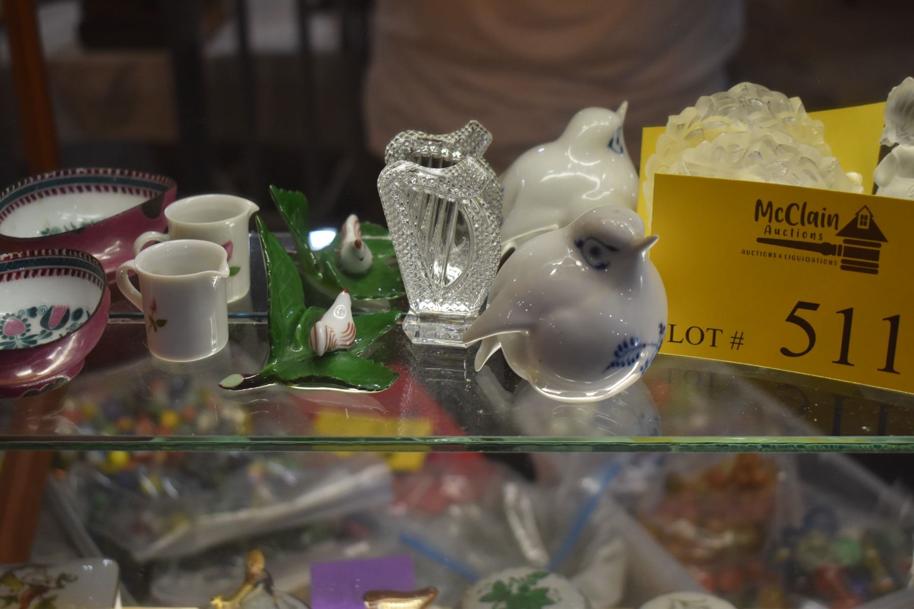 MIXED LOT: WATERFORD HARP, HEREND LEAF W/BIRD, ROYAL COPENHAGEN BIRD, LALIQUE BIRD, GOEBEL AUSTRIAN BOWL, ETC. (8 PCS)