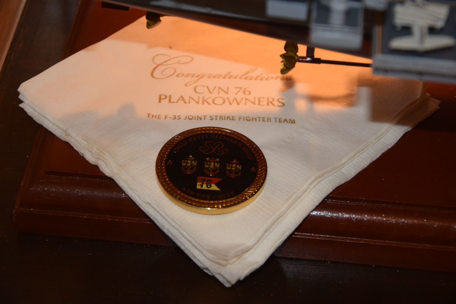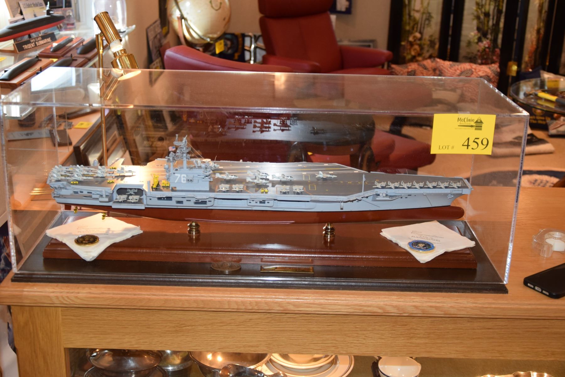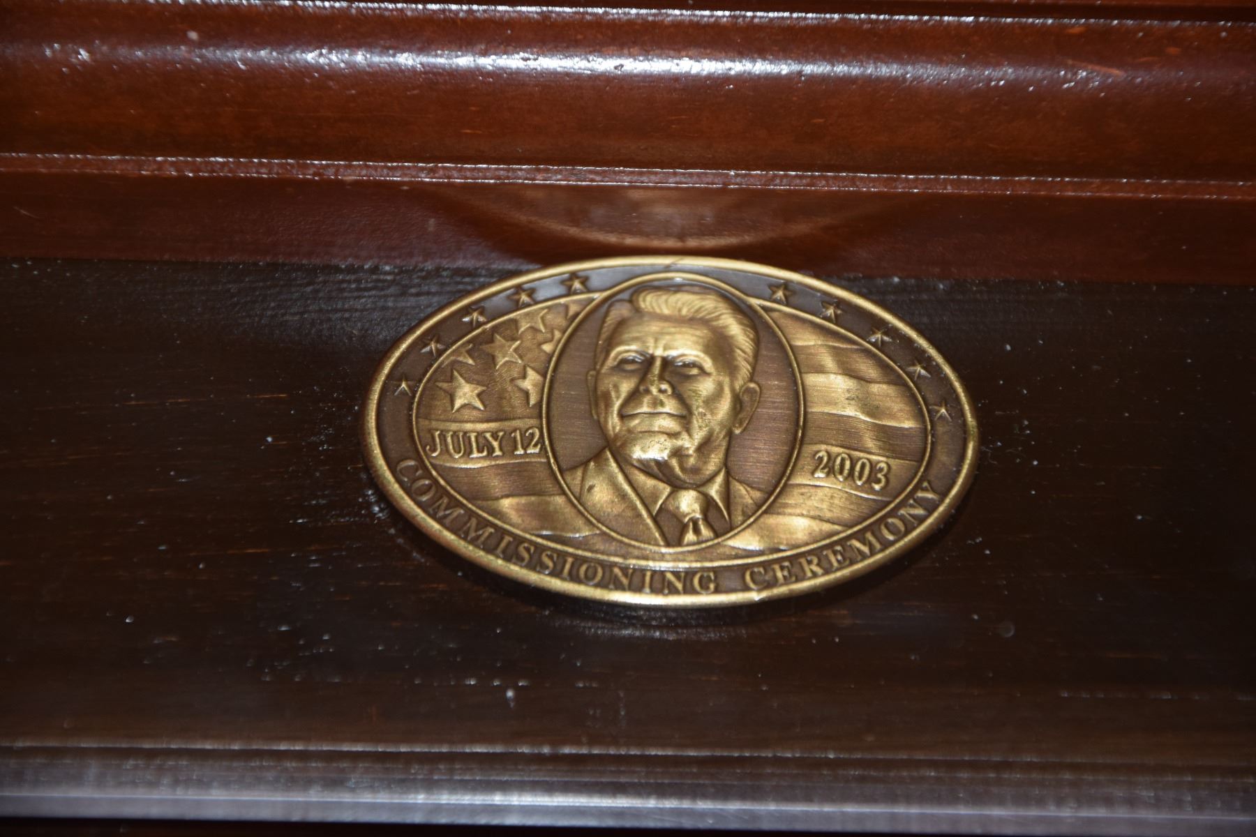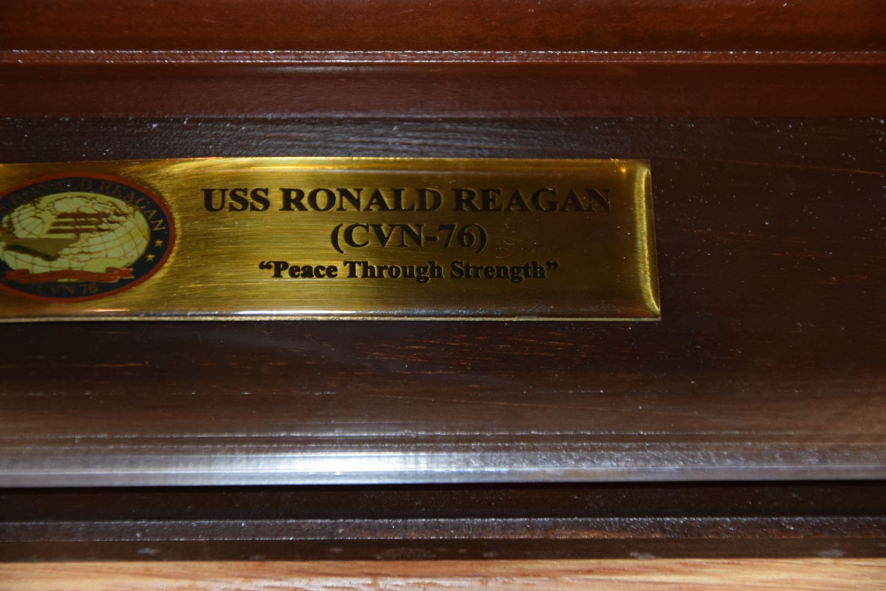 MODEL OF THE USS RONALD REAGAN (CVN-76) MOUNTED ON WOOD BASE IN PLEXI GLASS CASE (34 1/2L X 12 1/2" D X 12 1/2" H)