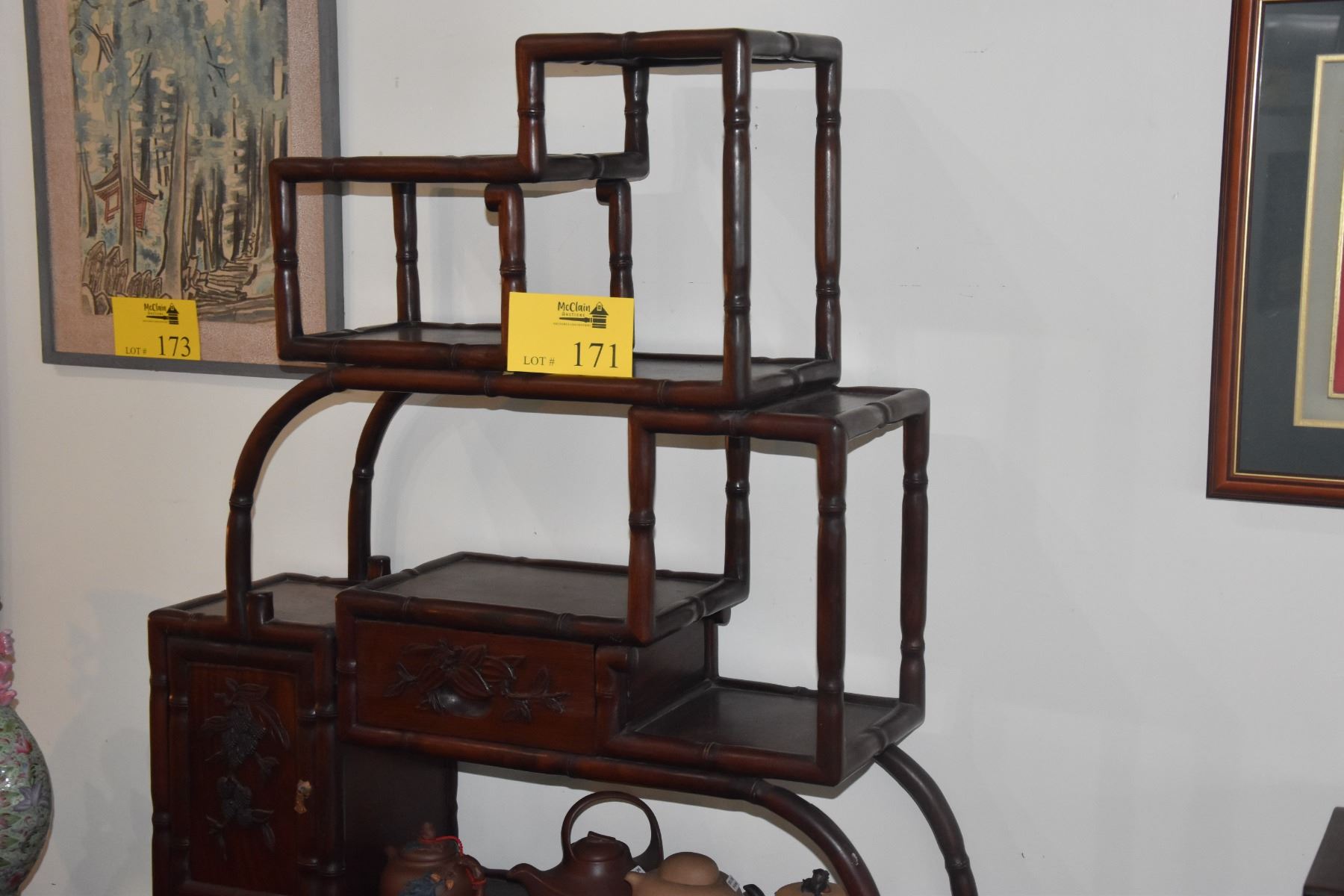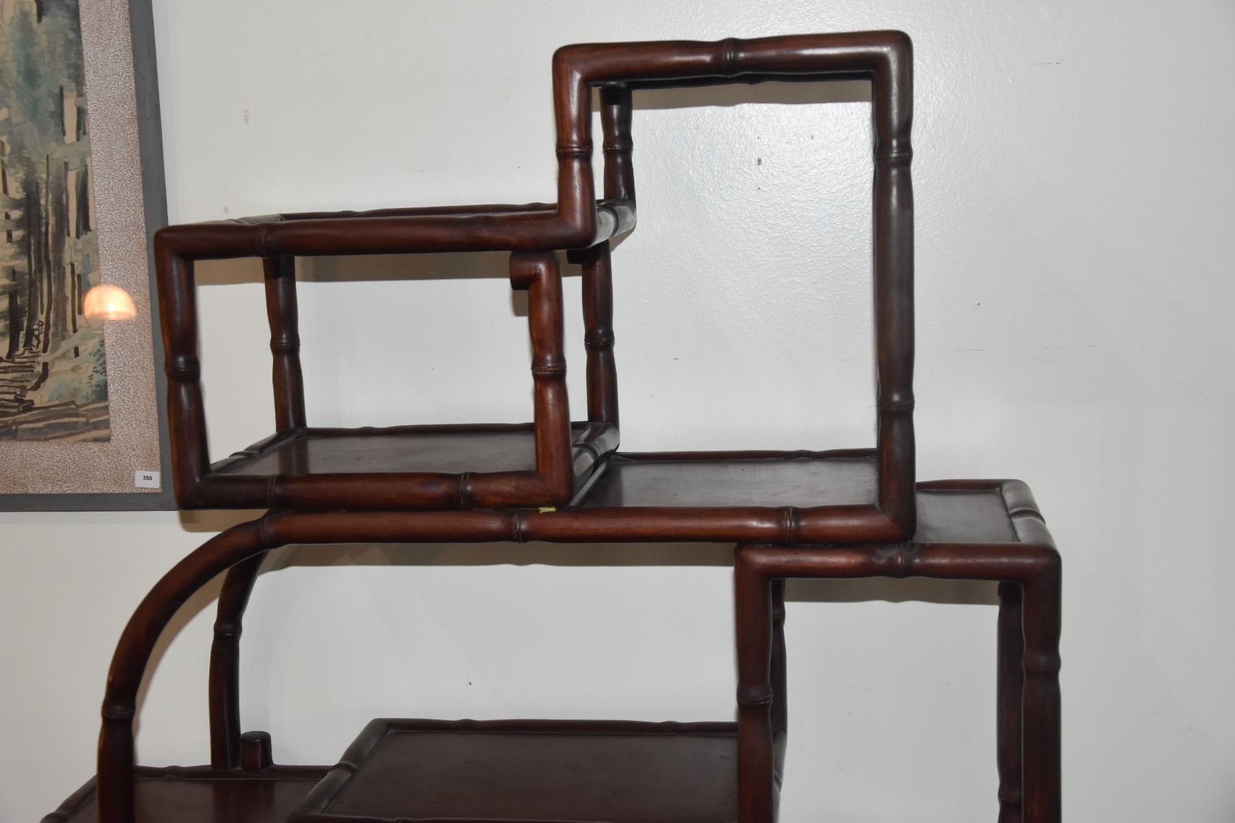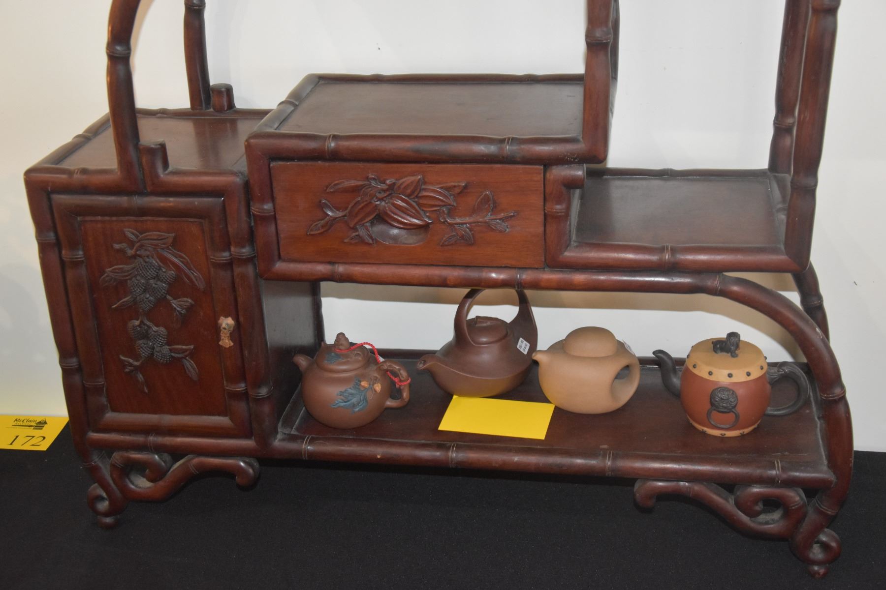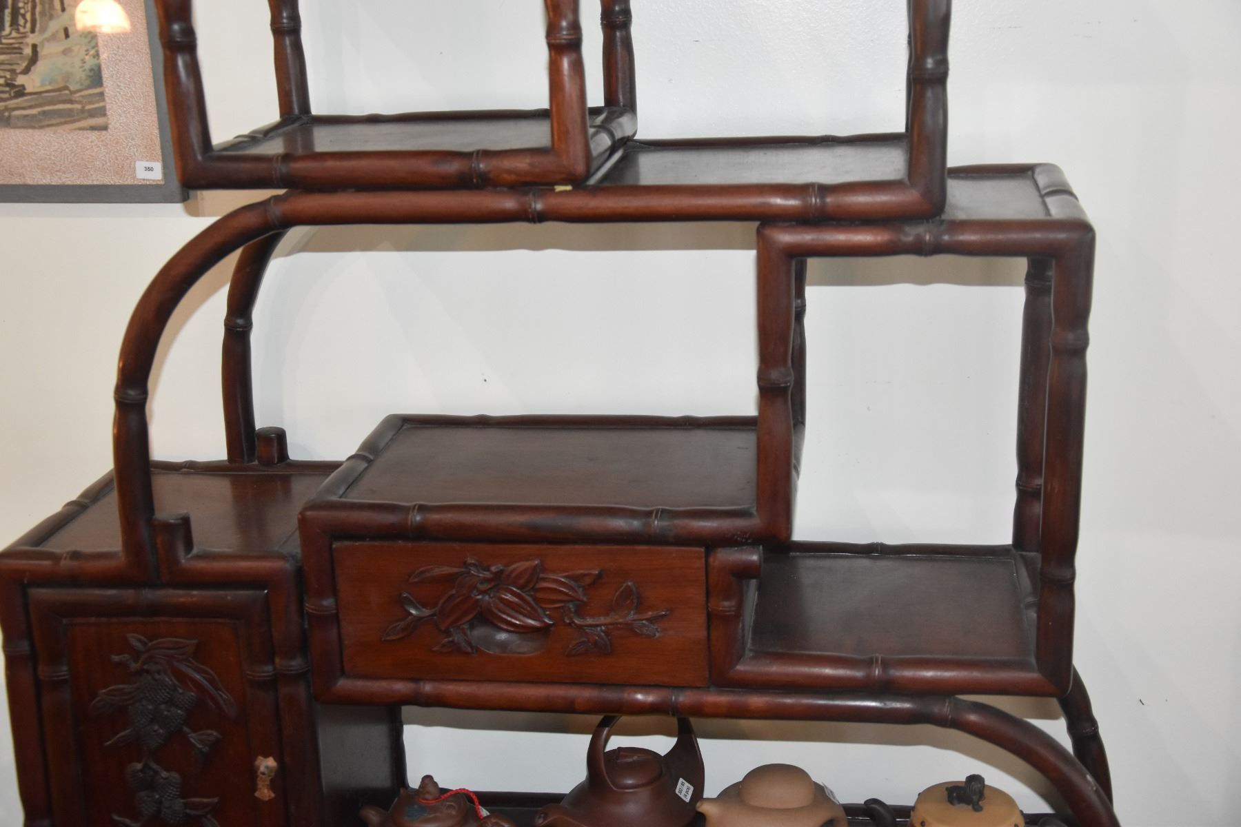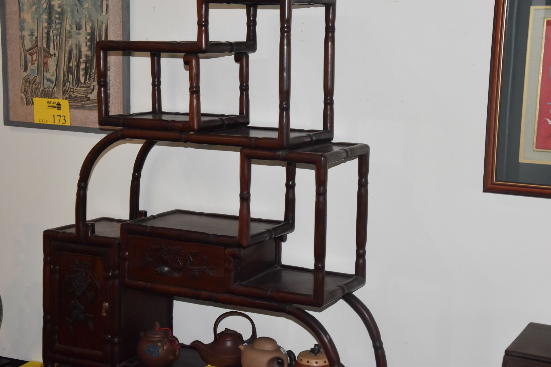 MULTI-TIERED ROSEWOOD DISPLAY STAND W/DRAWER & CUPBOARD (29 1/2" X 36")