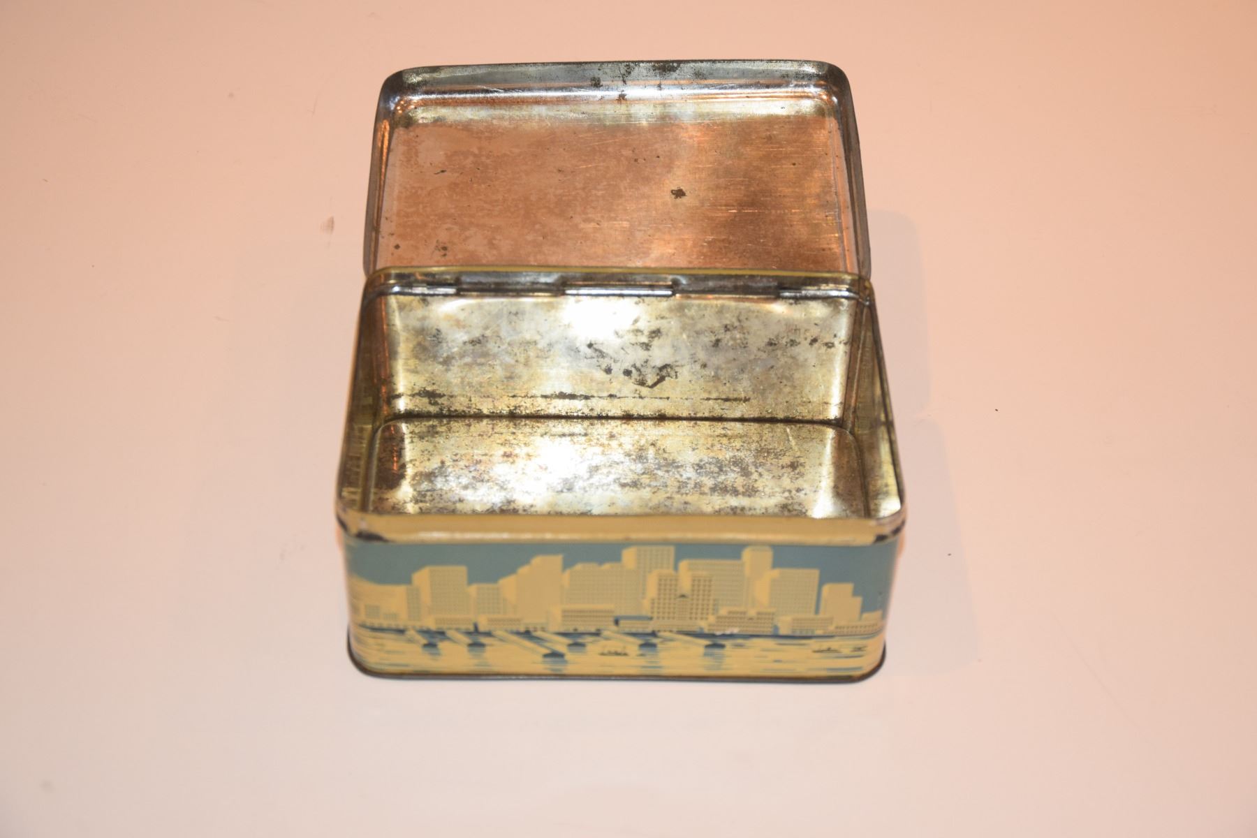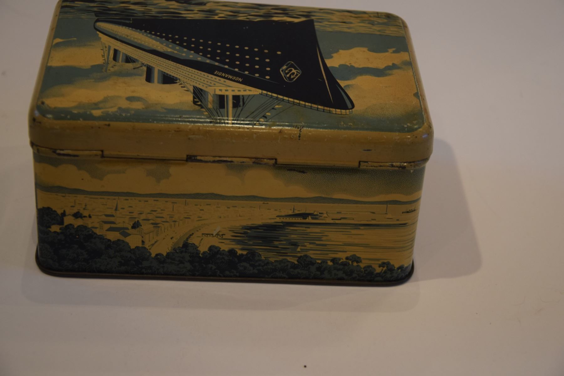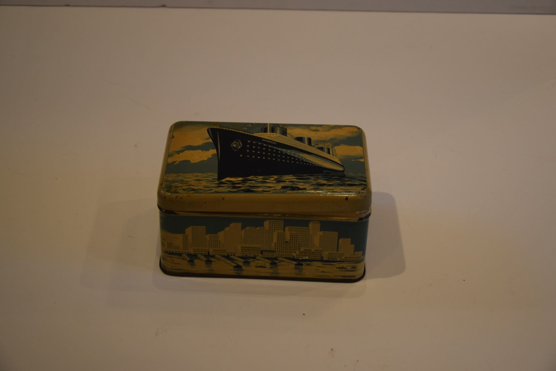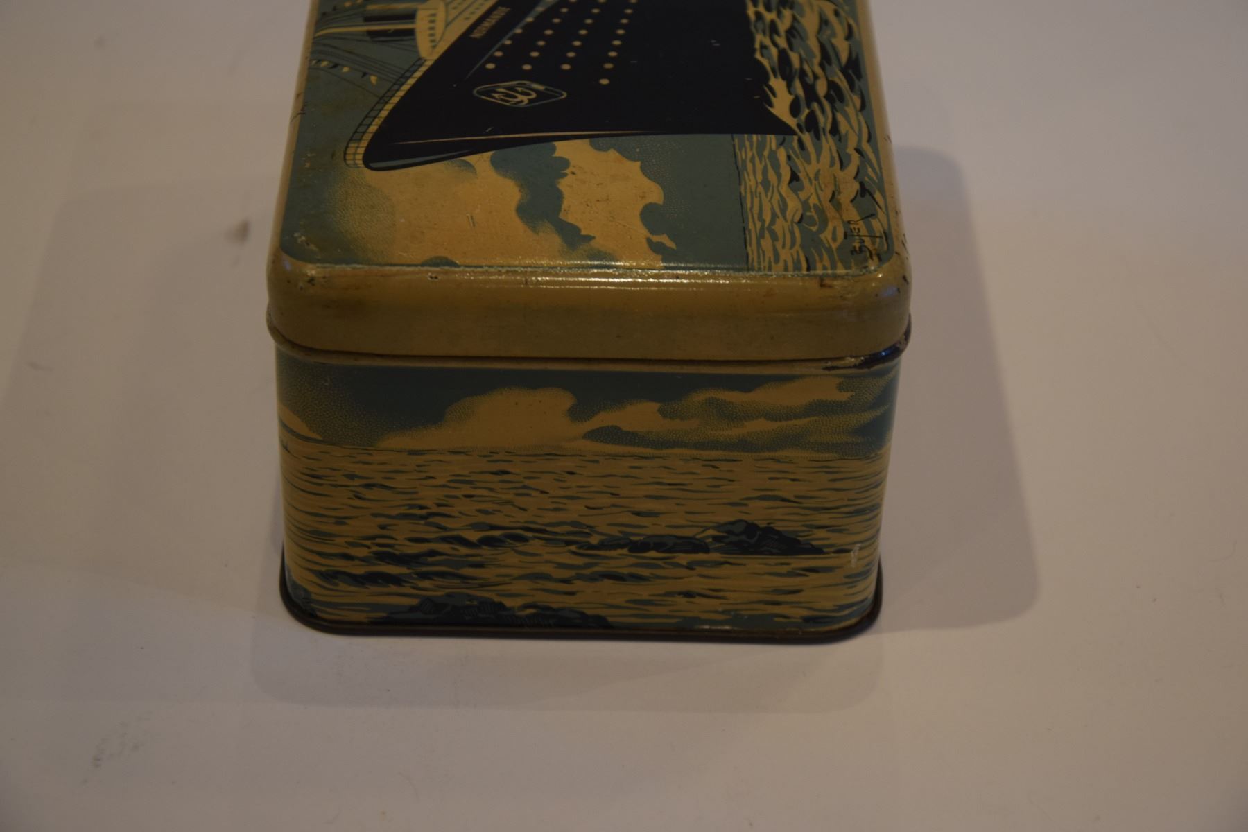 NORMANDIE: BLUE & WHITE COOKIE TIN (PICTURED IN "NORMANDIE-QUEEN OF THE SEAS") (7" X 4 1/2" X 3")
