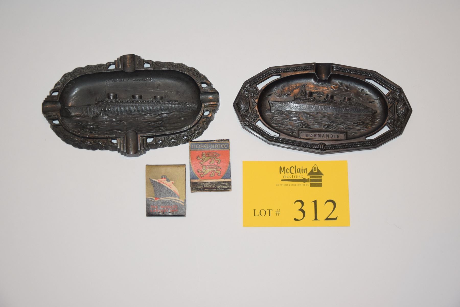 NORMANDIE: BOOK OF HER MATCHES (PARTIALLY USED),  BOOK OF HER MATCHES-SIMILAR TO THOSE IN EXHIBITION (USED) & SS NORMADIE ASHTRY, FRENCH LINE PAQUEBOT DAMPFER (5 PCS)