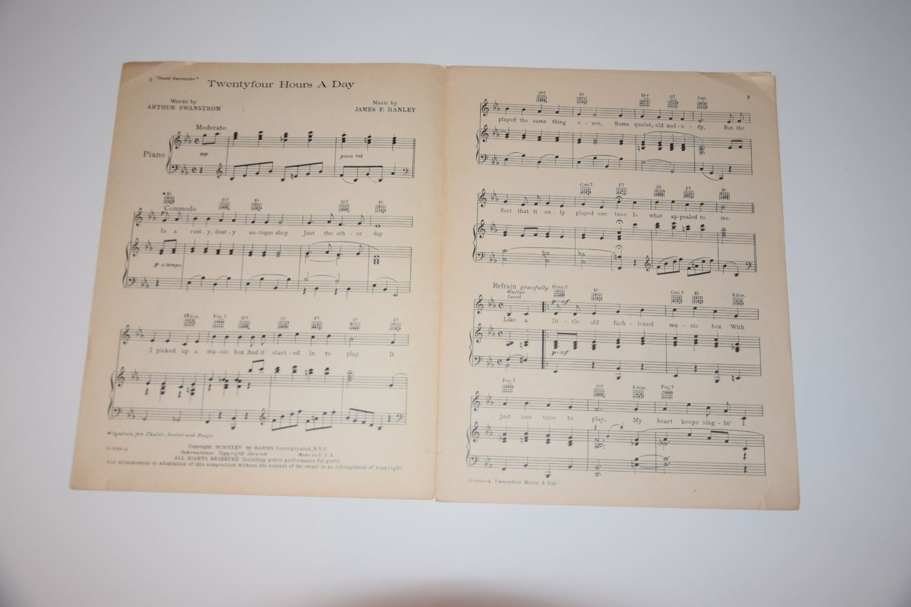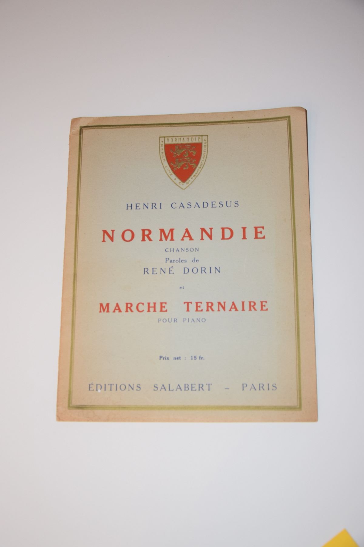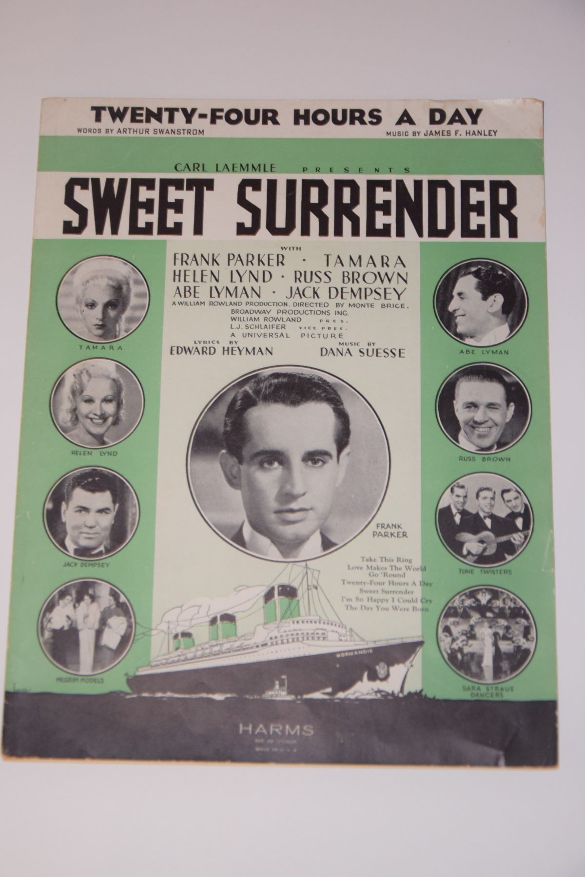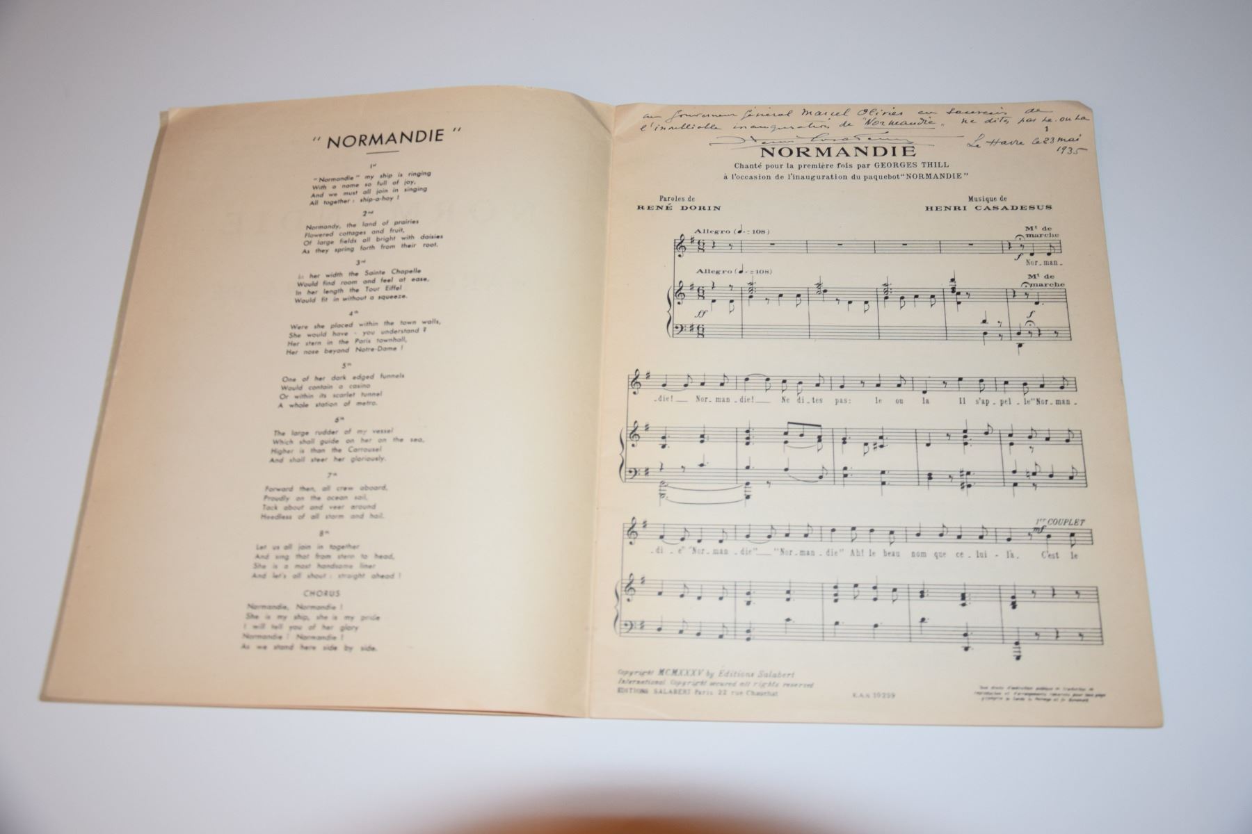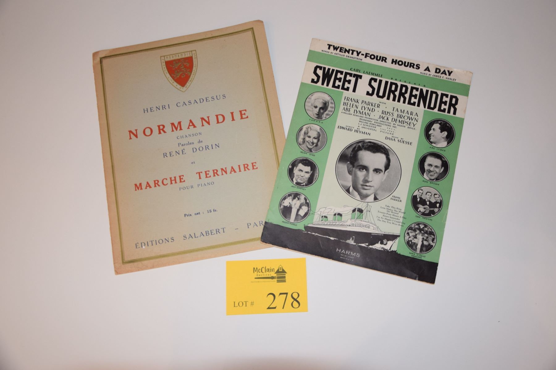 "NORMANDIE" BY RENE DORIN & HENRI CASADESUS, A SONG COMMISSIONED BY THE FRENCH LINE FOR THE MADIEN VOYAGE OF THE NORMANDIE-MAY 23, 1935, AUTHOGRAPHED, PERSONAL COPY OF MARCEL OLIVIER & "24 HOURS A DAY" SHEET MUSIC, SWEET SURRENDER (2 PCS)