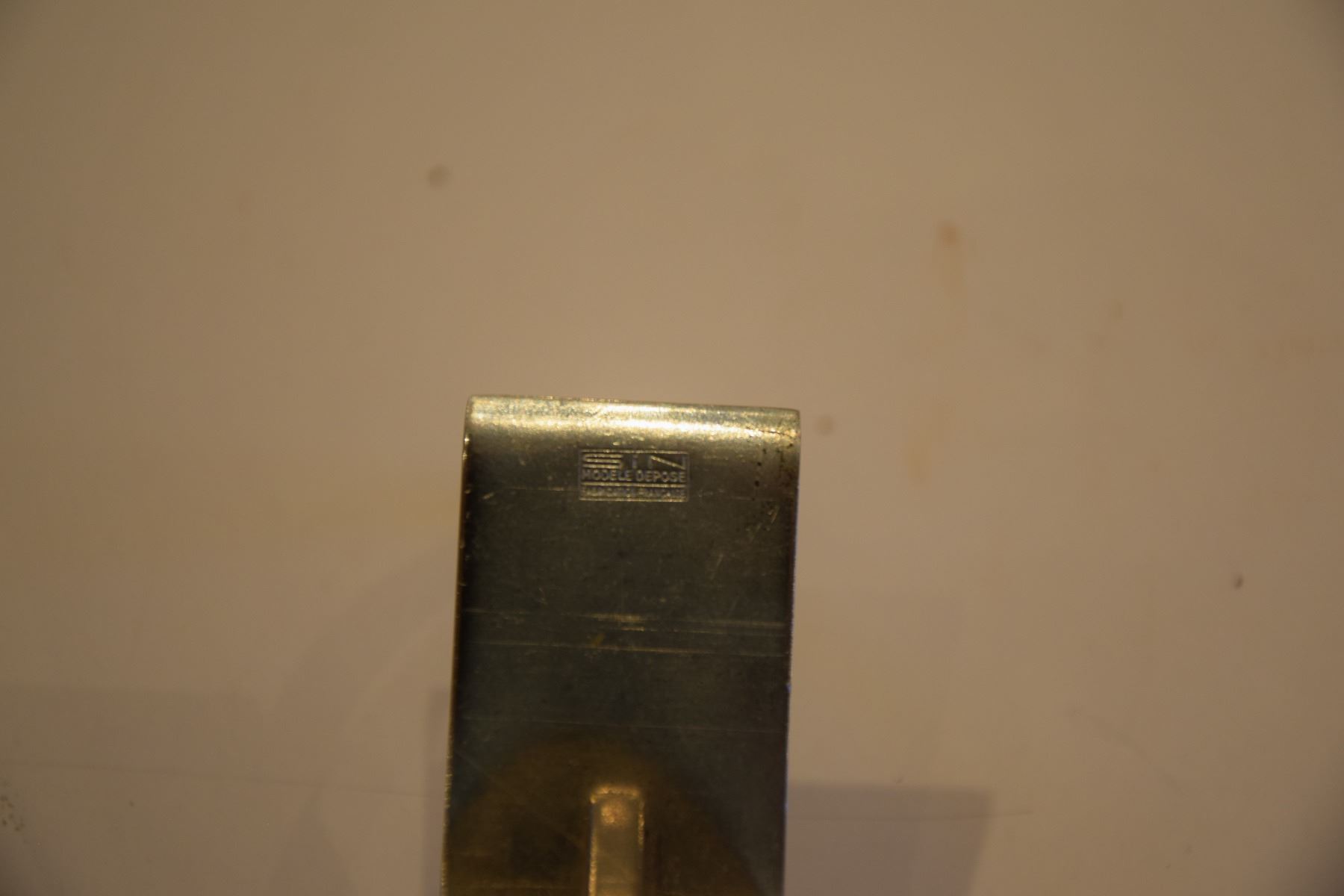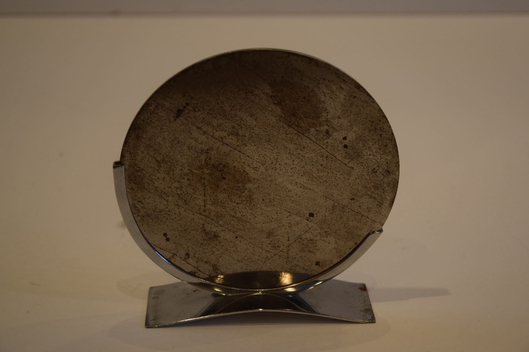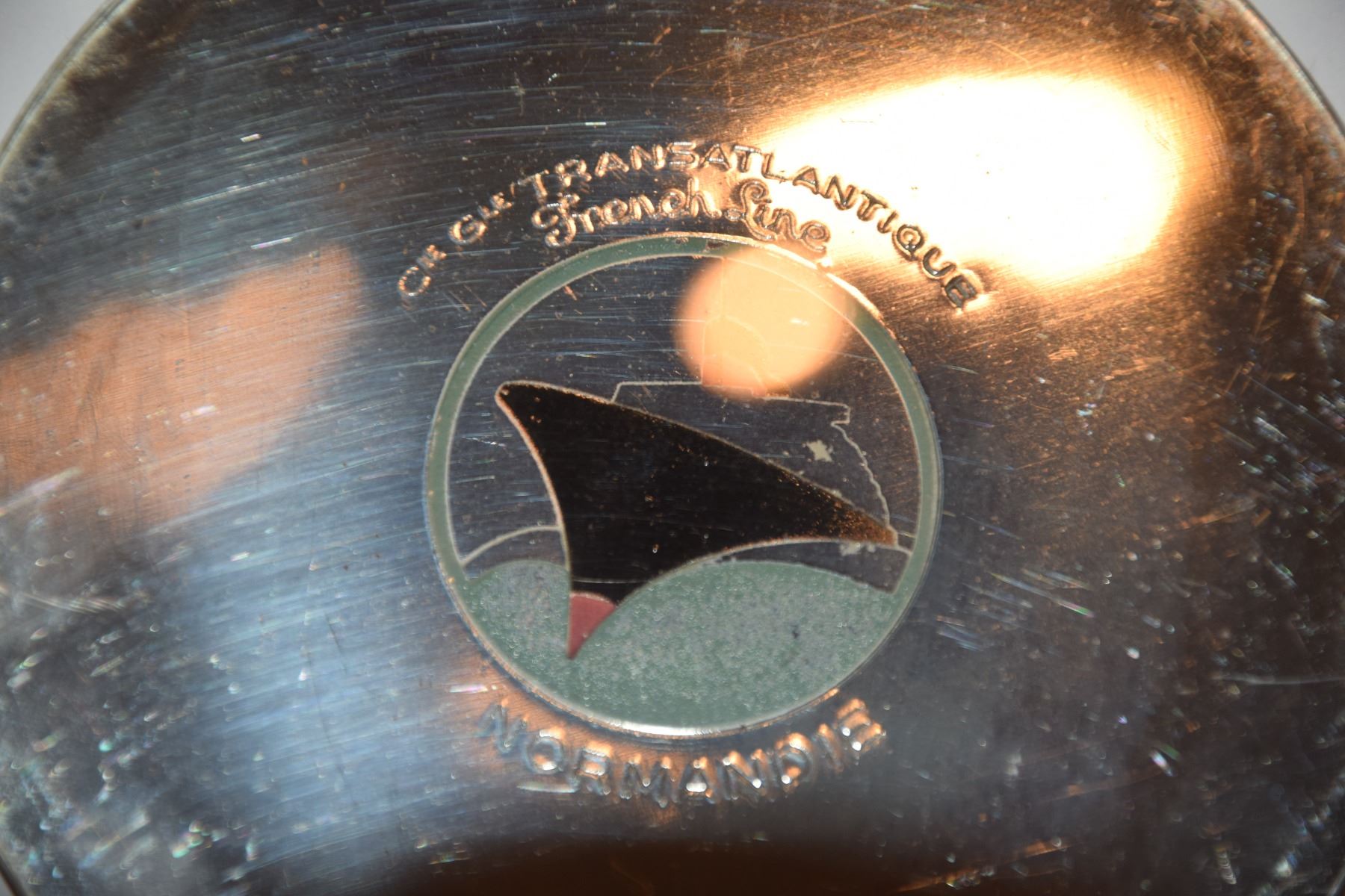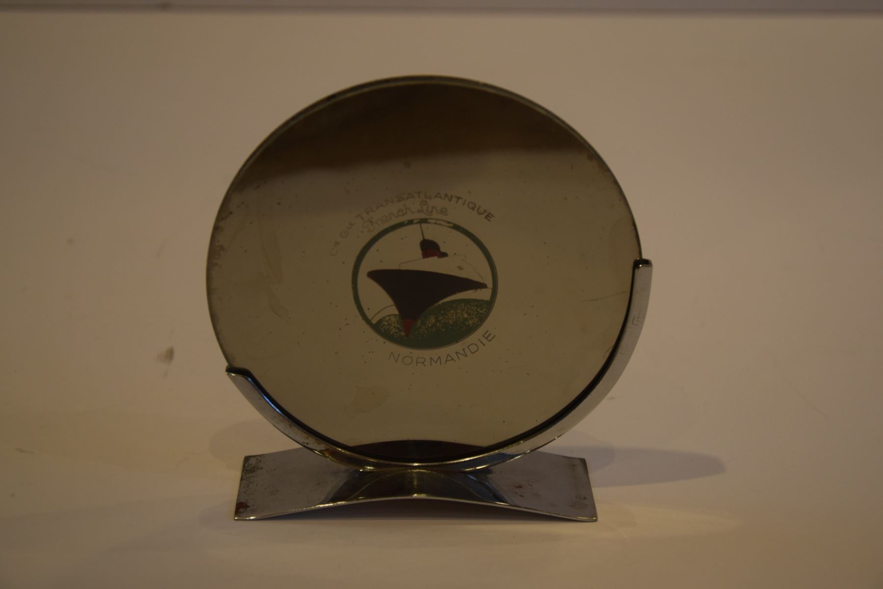 NORMANDIE: CHROME ART DECO DECORATIVE MIRROR W/A FULL COLOR NORMANDIE LOGO ENAMELED IN THE CENTER W/HER'S & THE COMPANY'S NAME AROUND IT. CONTAINED IN A SEMI-CIRCULAR HOLDER, UNDER GLASS ON A CURVED BASE (4/34" D X 5" TALL)