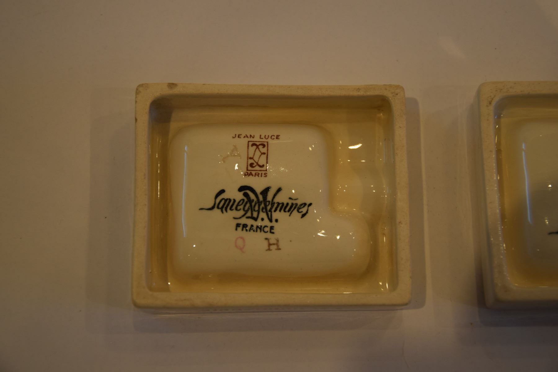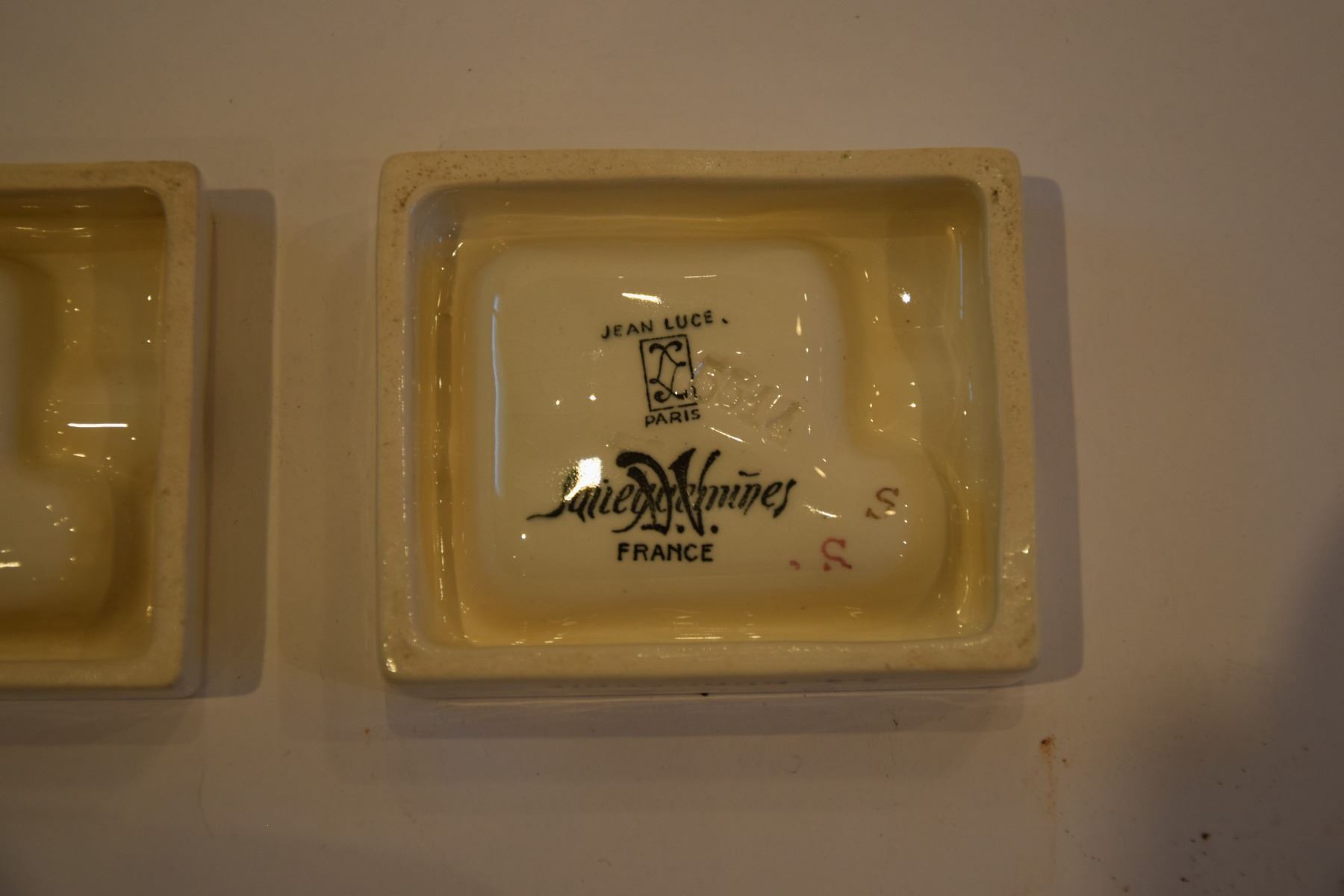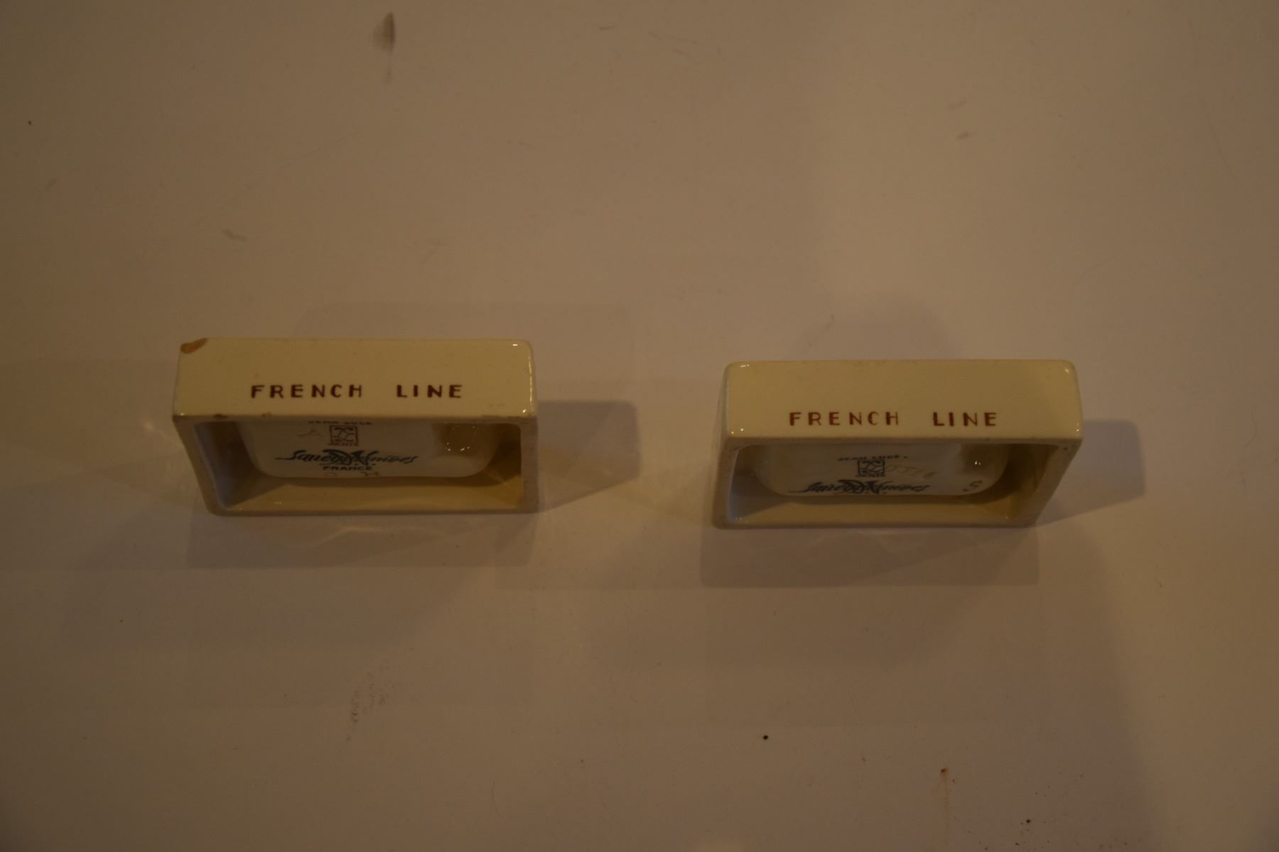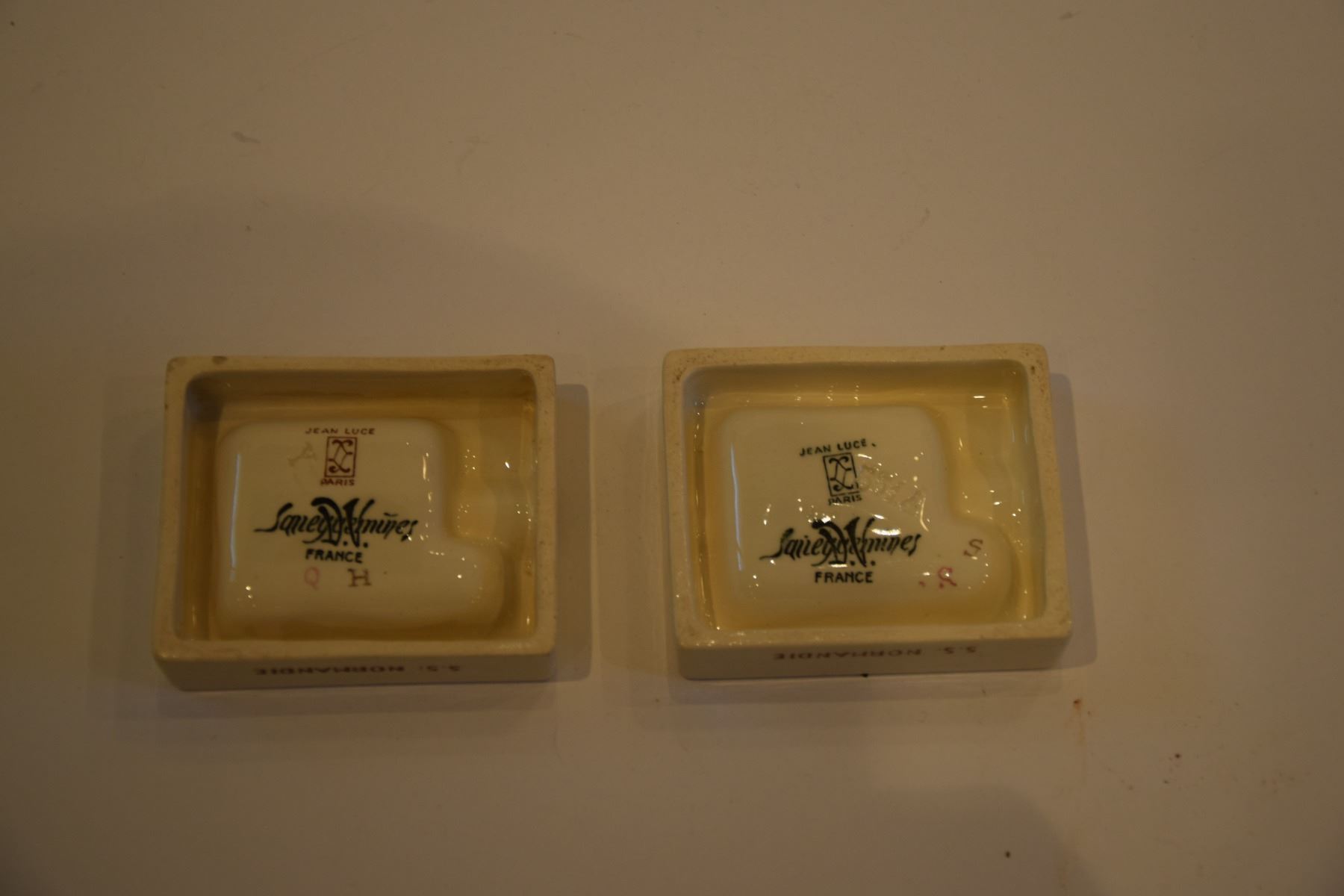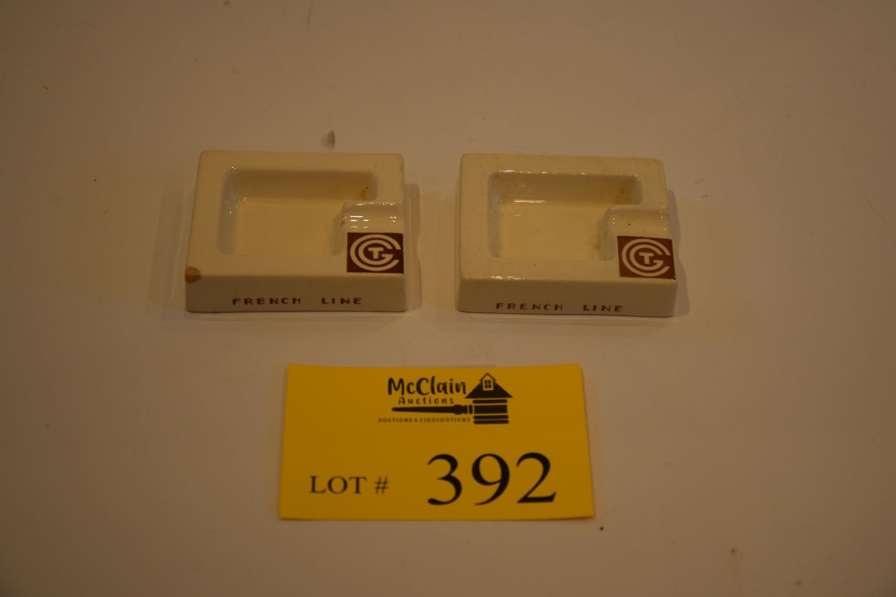 NORMANDIE: HER ASHTRAY BY JEAN LUCE, IVORY COLORED W/HER'S & COMPANY'S NAME & LOGO IN BOWN (THESE WERE USED ABOARD, NOT SOLD) (3" X 2 1/2" X 3/4") (2 PCS)