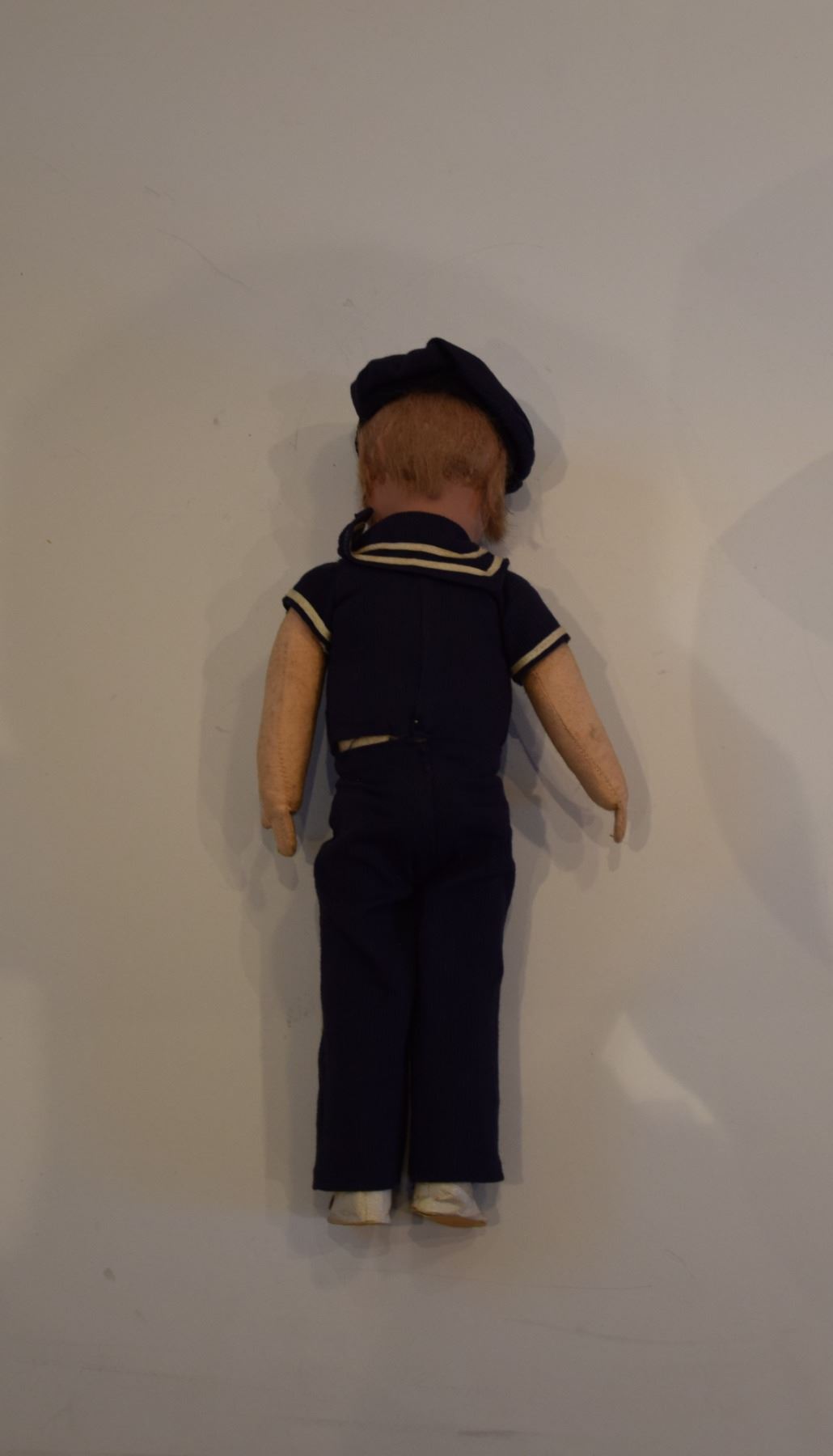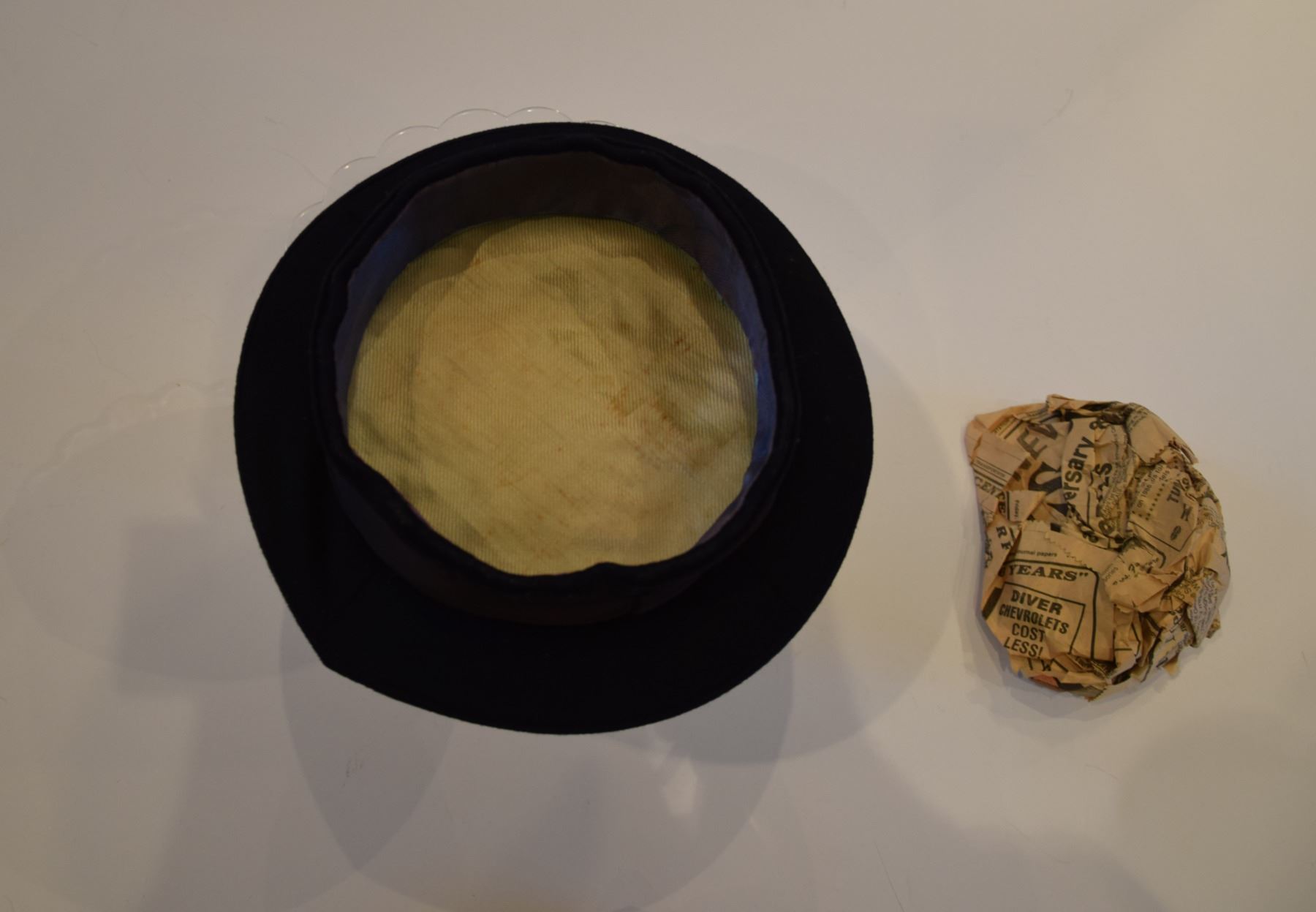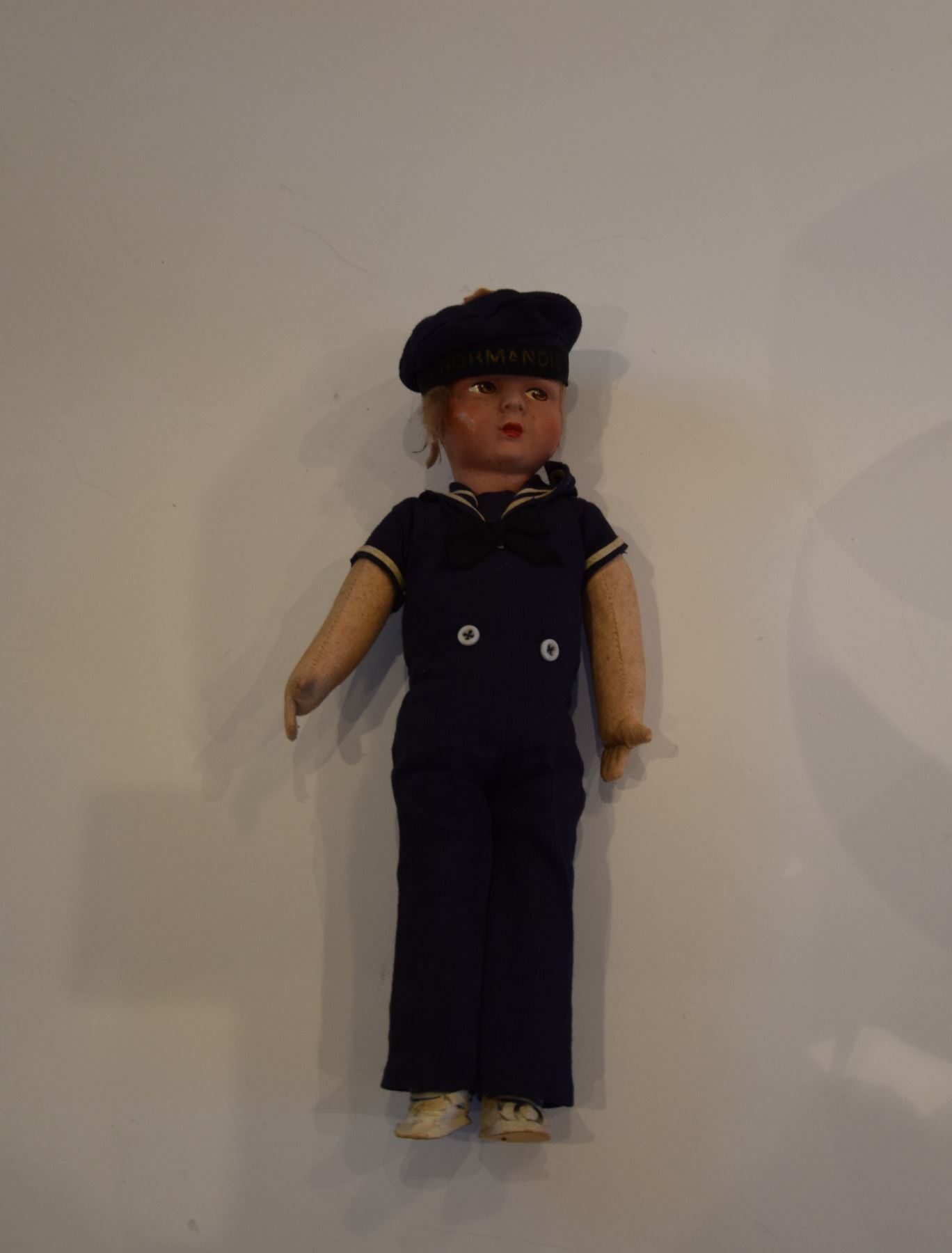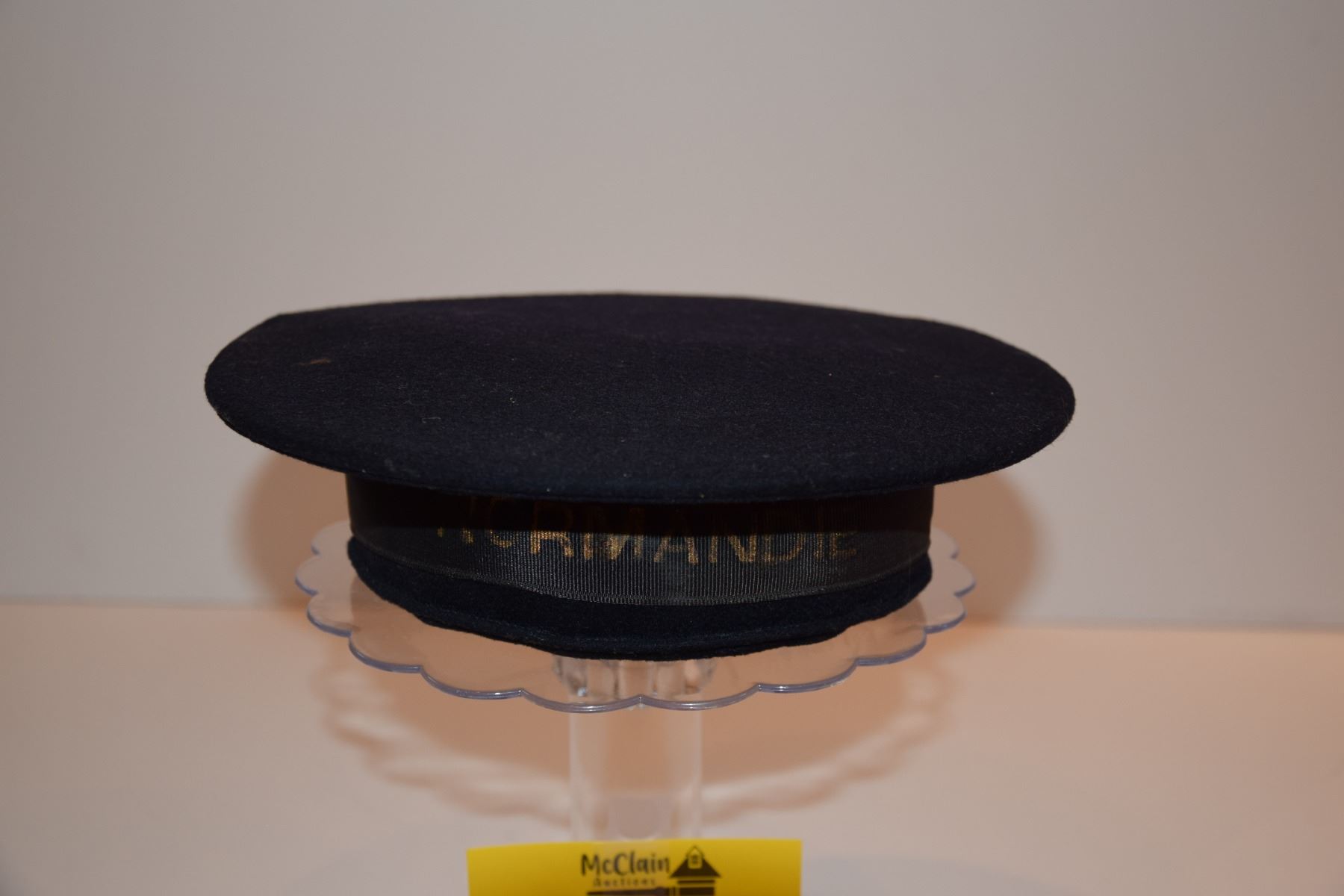 NORMANDIE: HER CREW'S HAT, NAVY BLUE WOOL W/MATCHING GROSSGAIN HAT BAND W/THE NORMANDIE'S NAME IN GOLD & NORMANDIE DOLL (2 PCS)