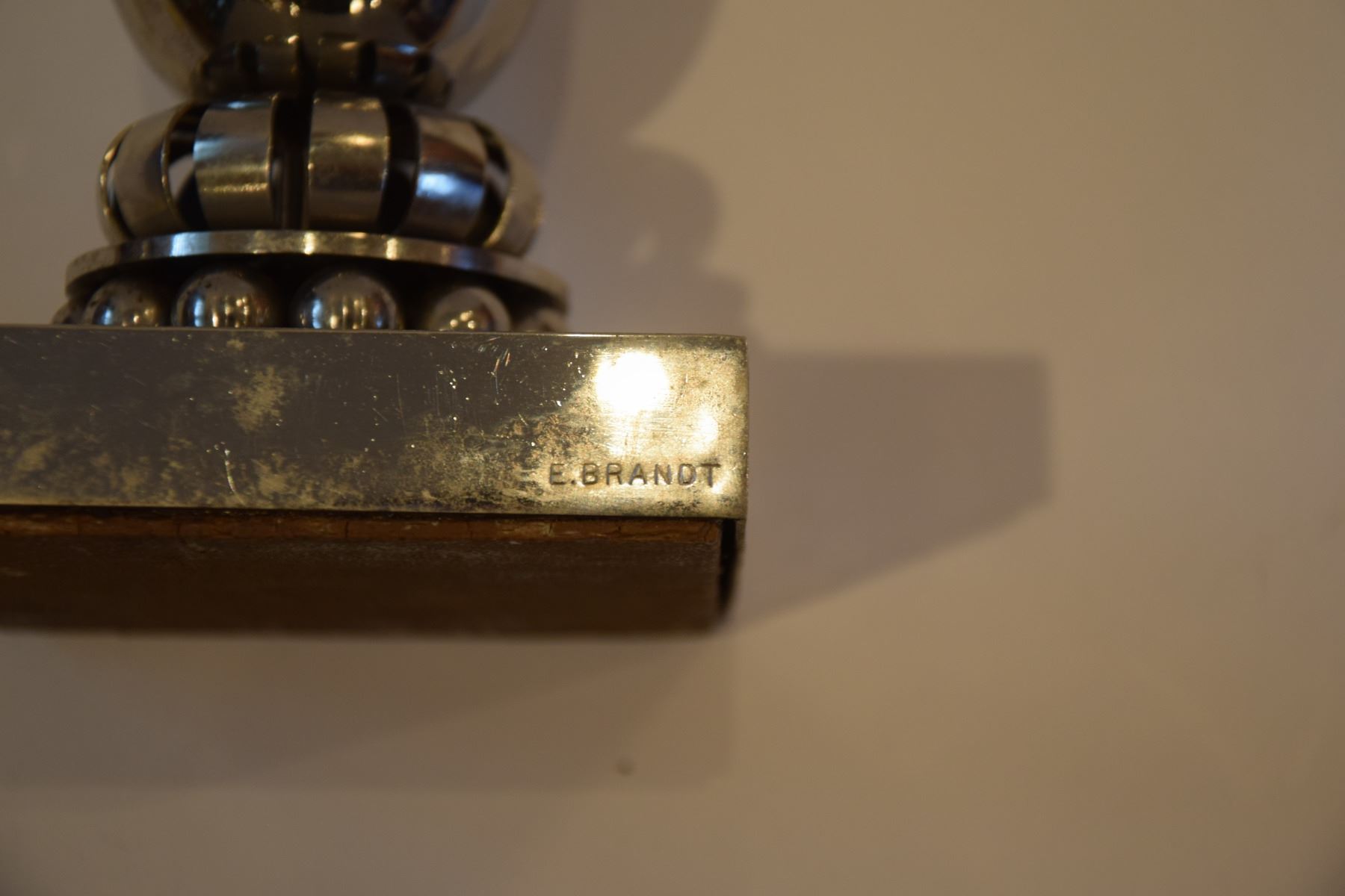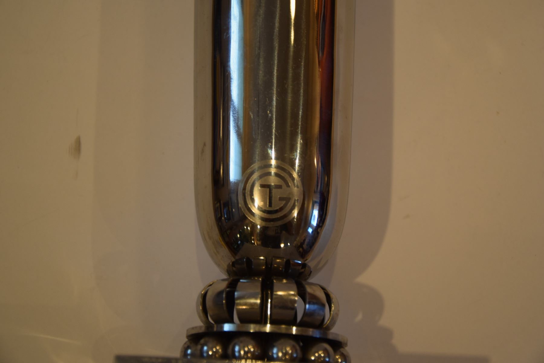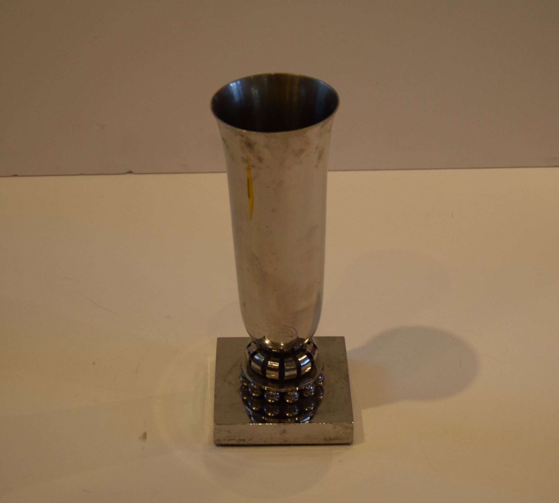 NORMANDIE: HIGH CHROME VASE BY EDGAR BRANDT W/THE FLARED CYLINDRICAL BODY IMPRESSED W/THE C.G.T LOGO & SUPPORTED BY AN OPENWORK COLUMN ON A CIRCULAR BAND OF METAL SPHERES RAISED ON A WEIGHTED BASE, STAMED G. BASTARD-E. BRANDT (10 1/2" H)