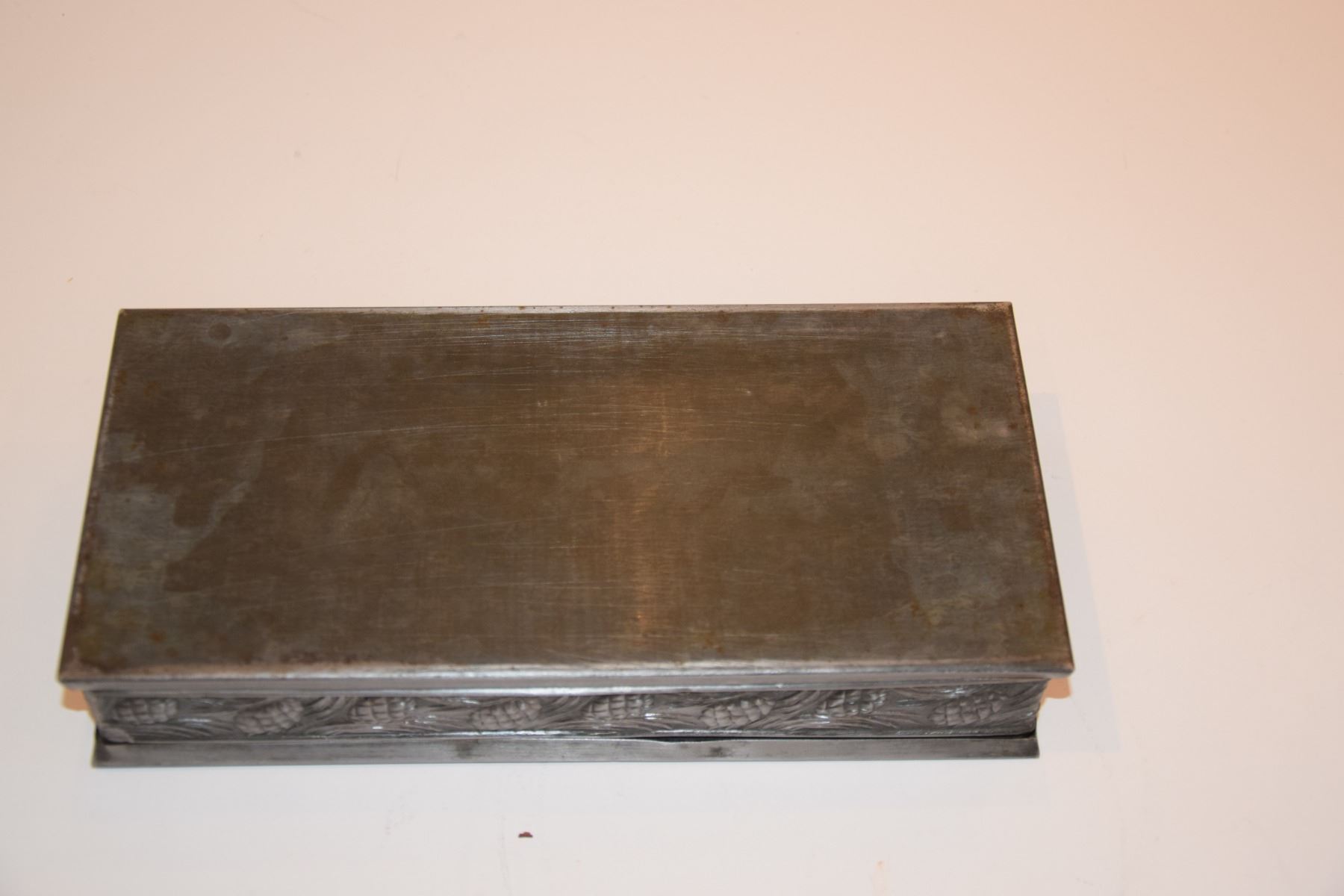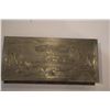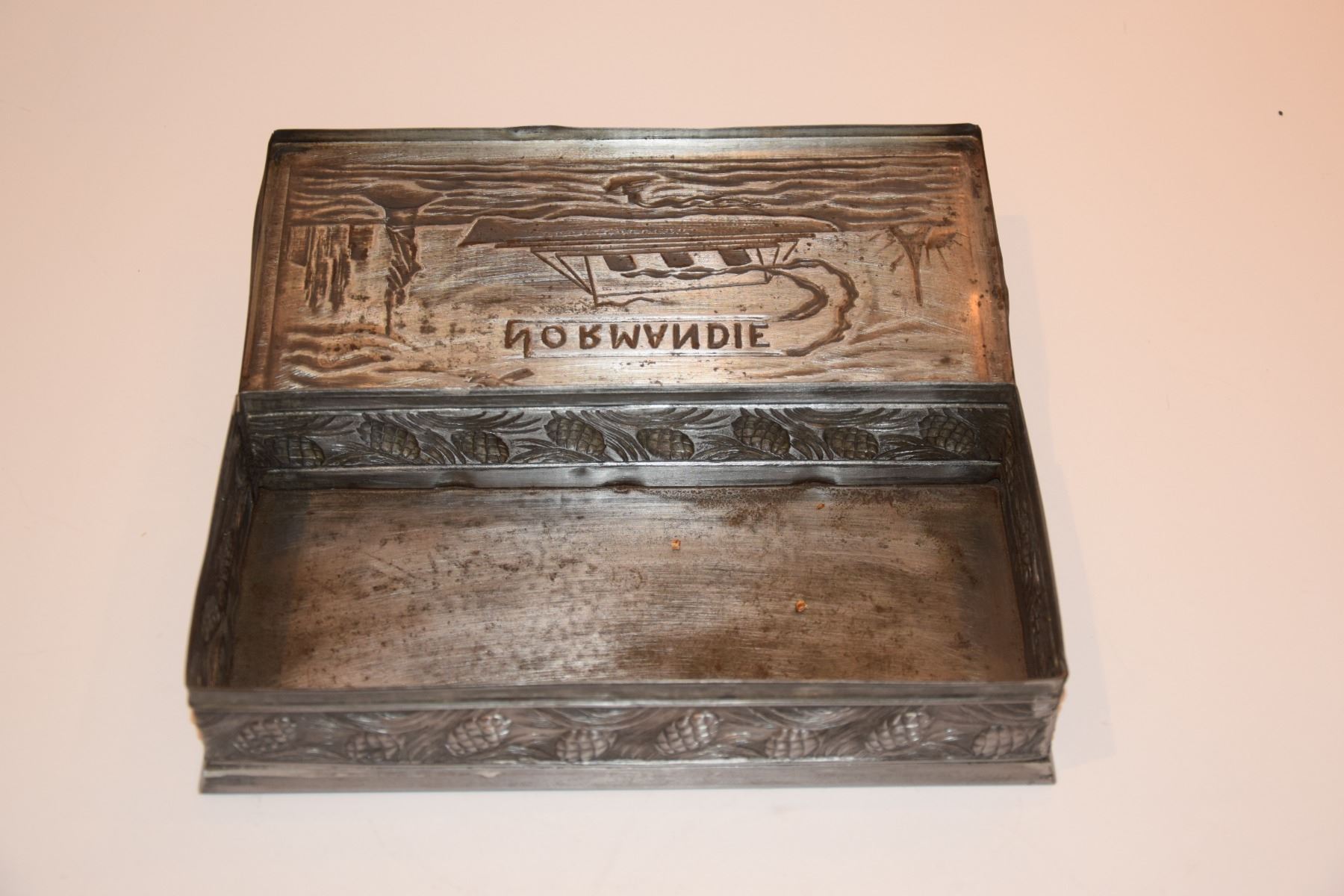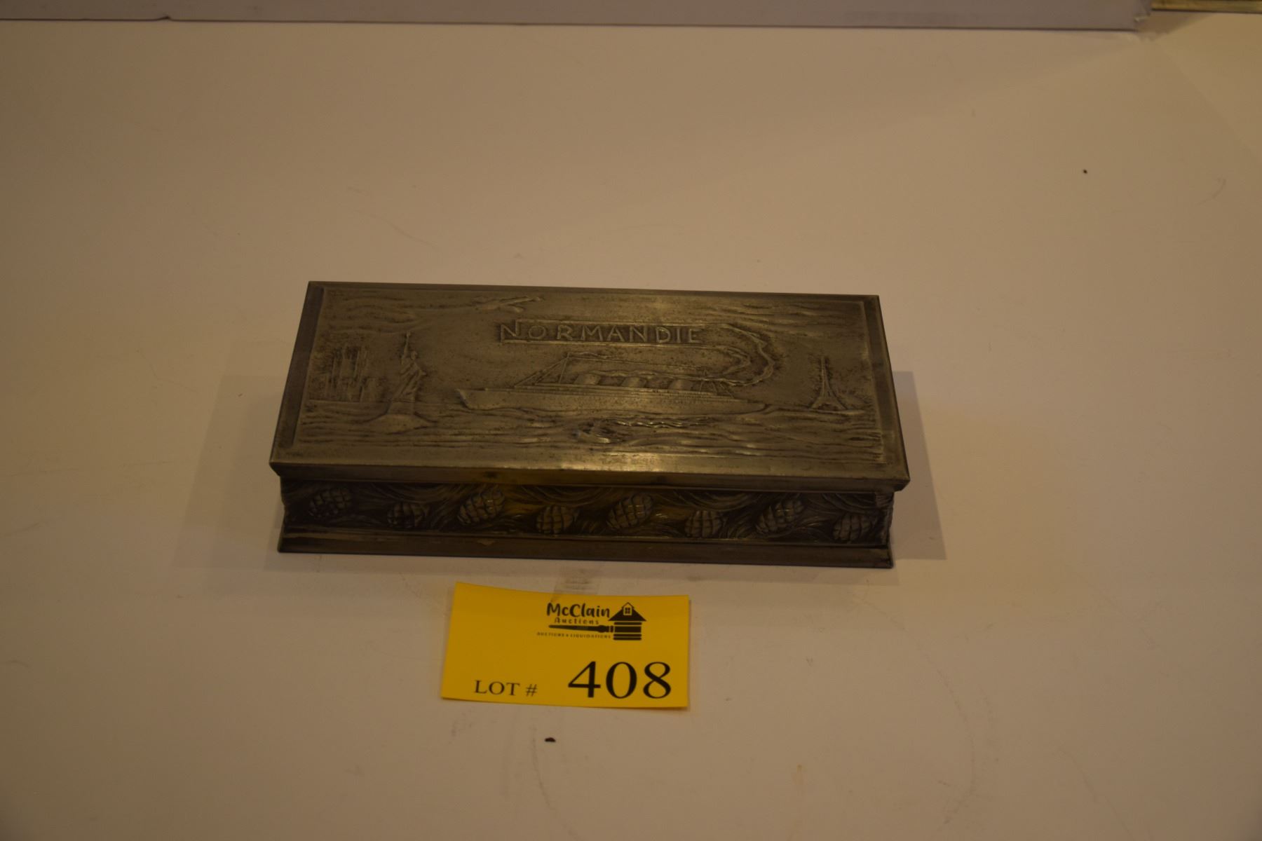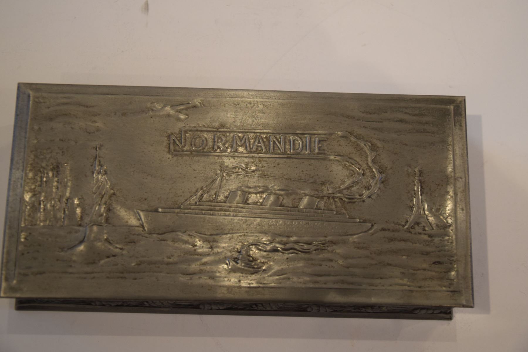 NORMANDIE: TIN BOX-NORMANDIE SAILING BETWEEN STATUE OF LIBERTY & THE EIFFEL TOWER (11" X 5 1/4")