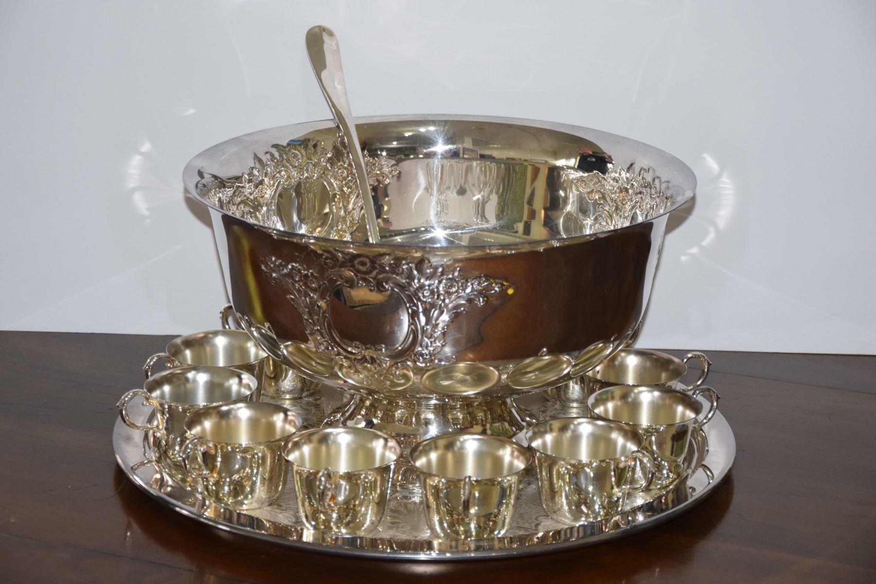 ONEIDA STAINLESS PUNCHBOWL W/EMBOSSED FLORAL DESIGN, CUPS, LADDLE & TRAY (15 PCS) (FROM REV. CLARENCE GUERREIRO COLLECTION)