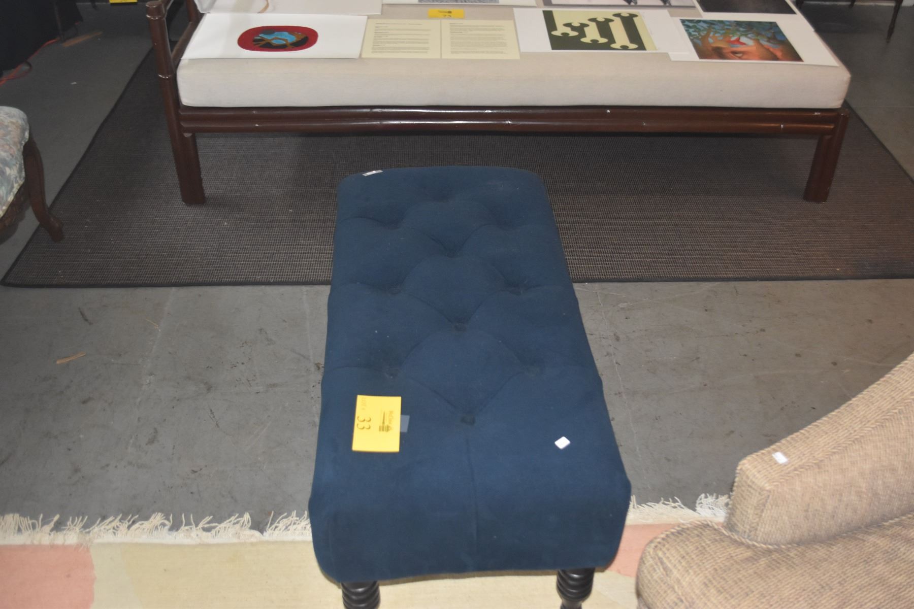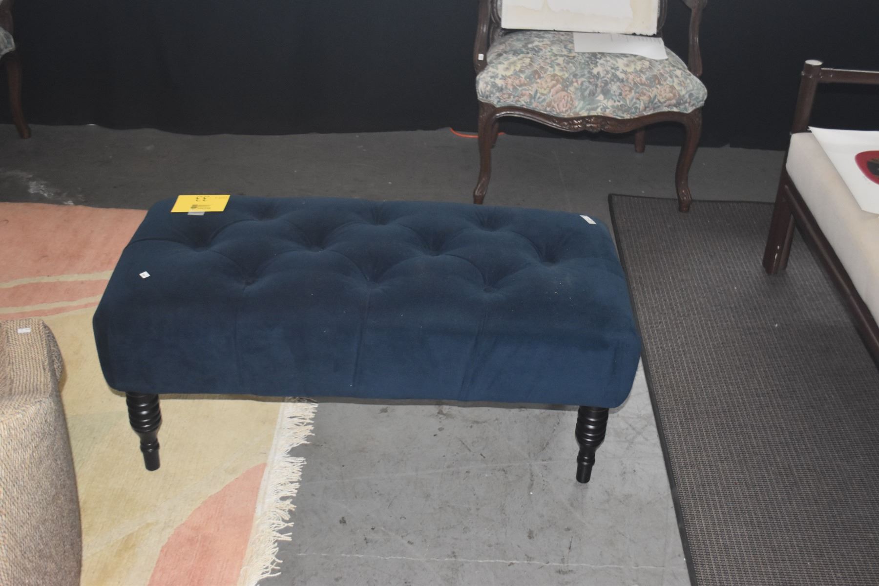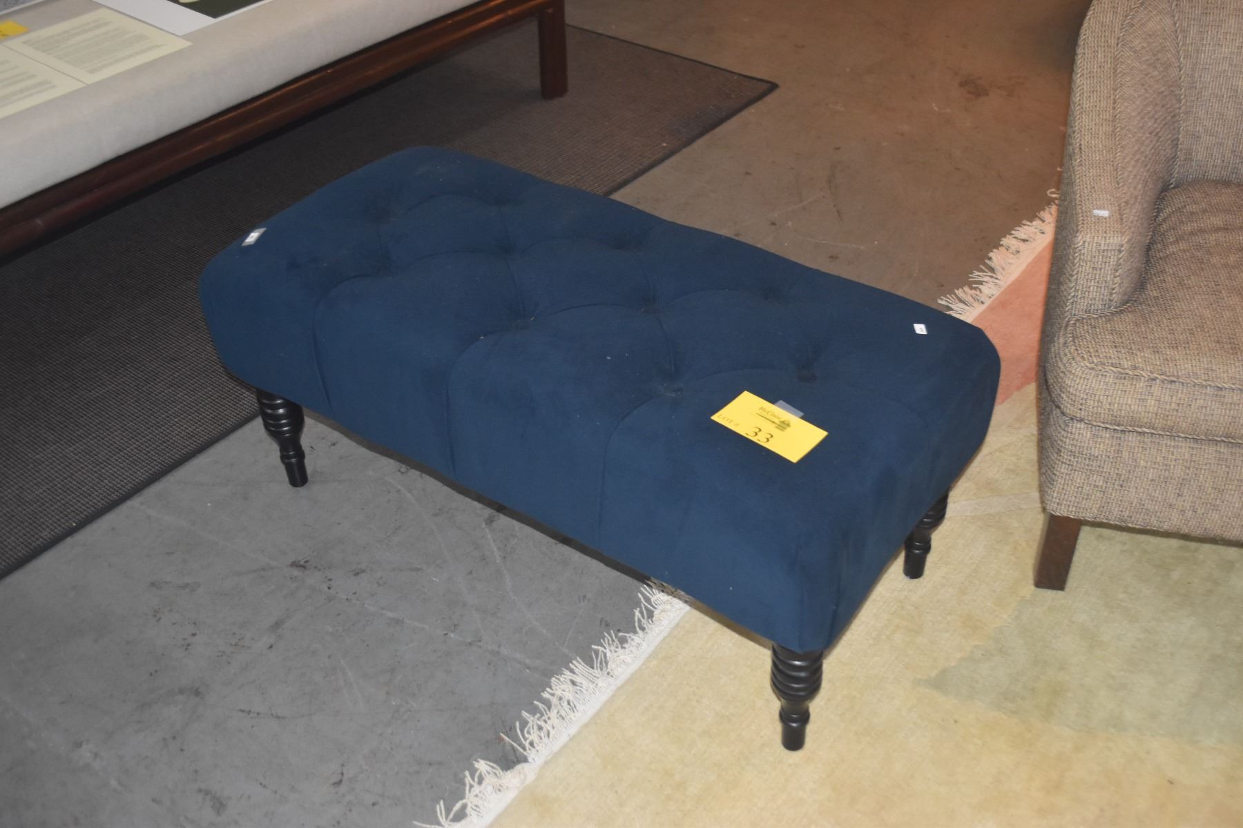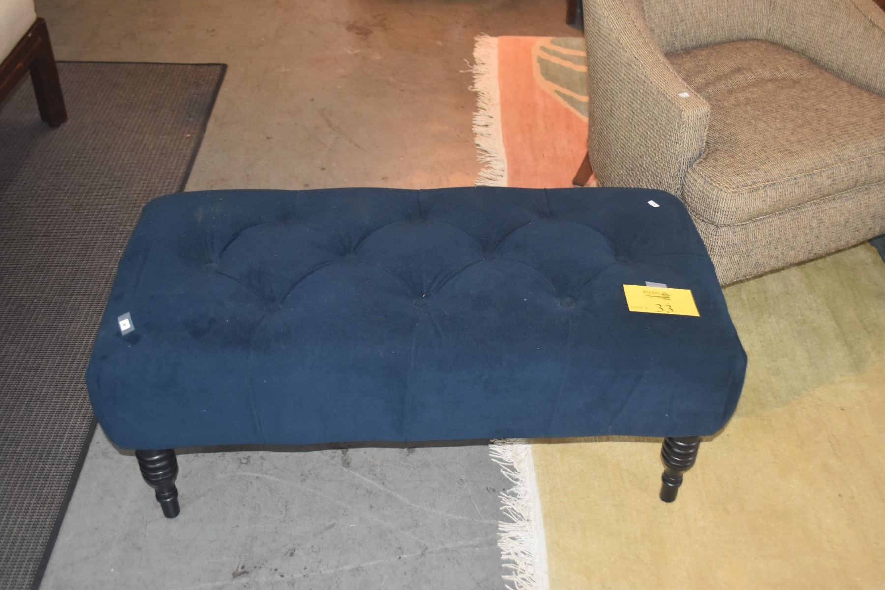 OTTOMAN/BENCH W/BLUE TUFTED FABRIC & WOOD LEGS (39" X 18" X 16")