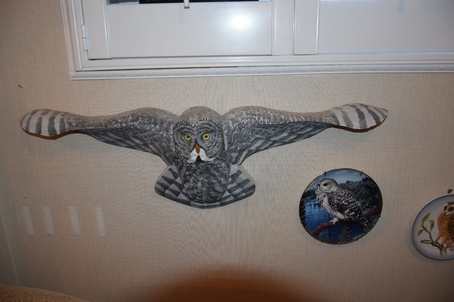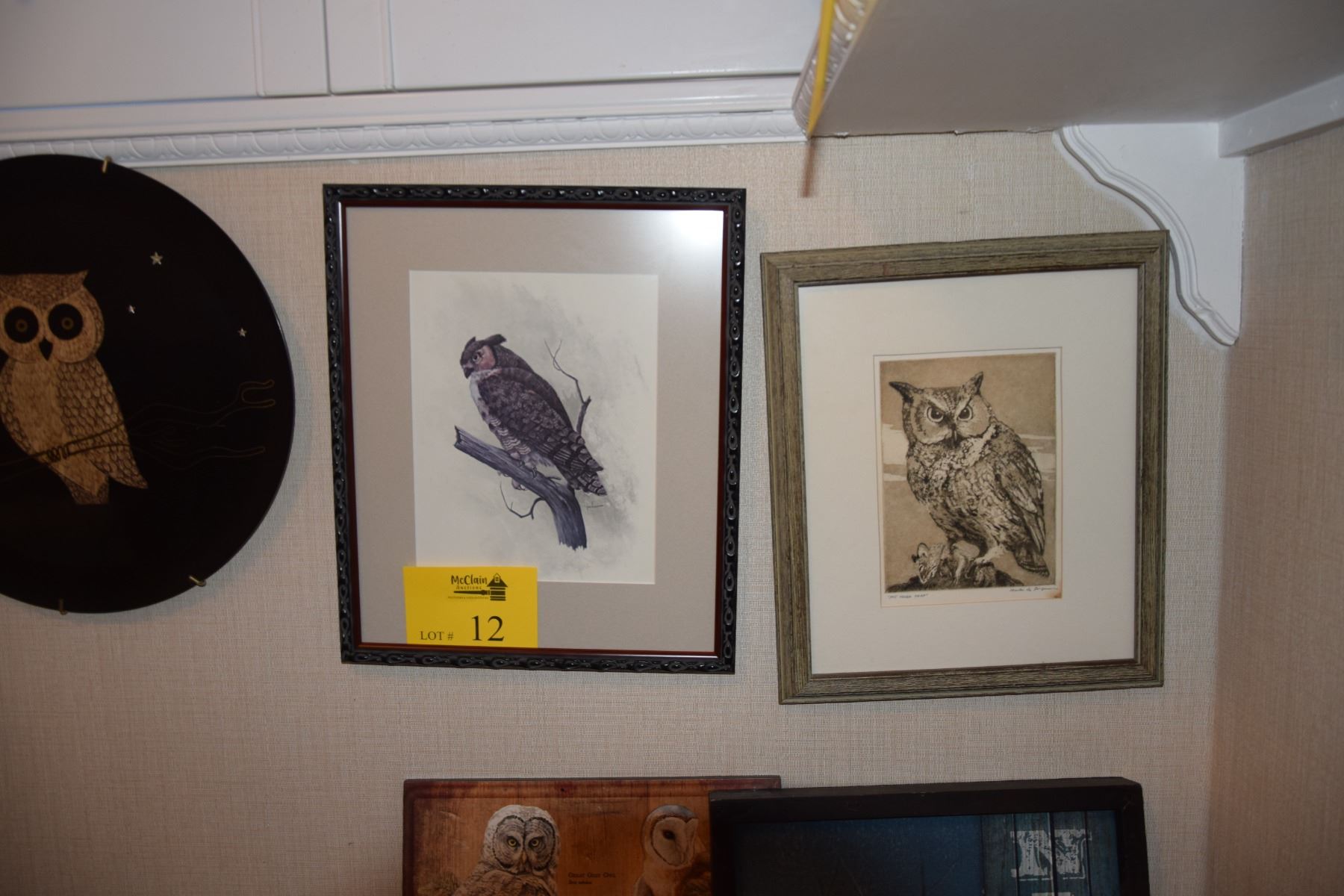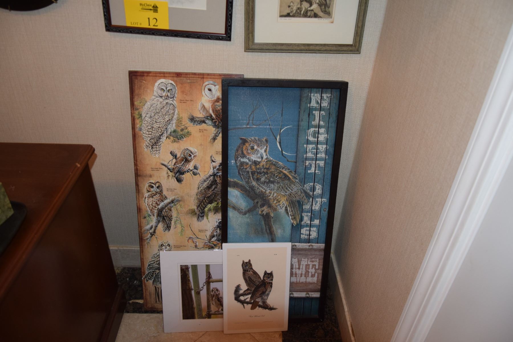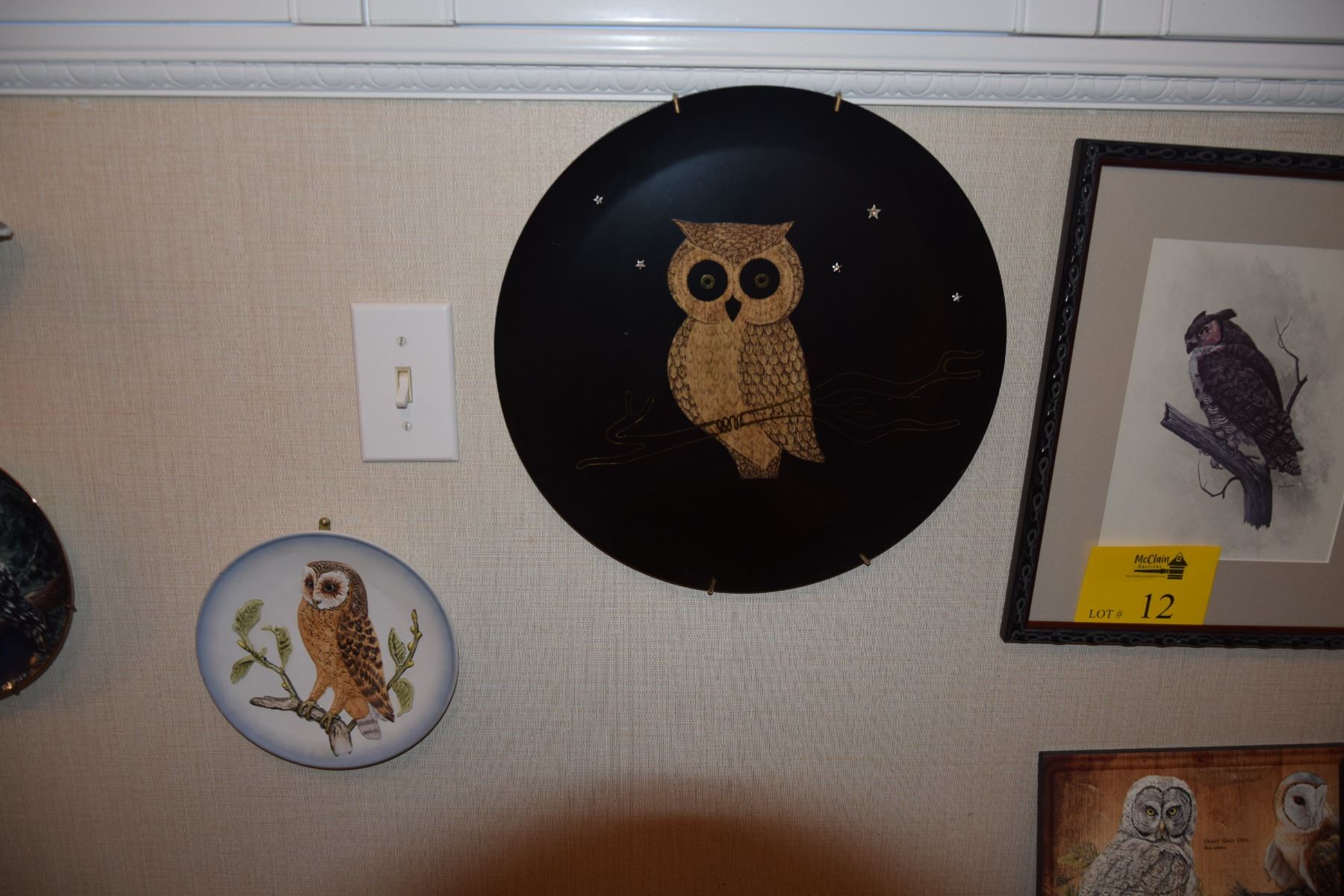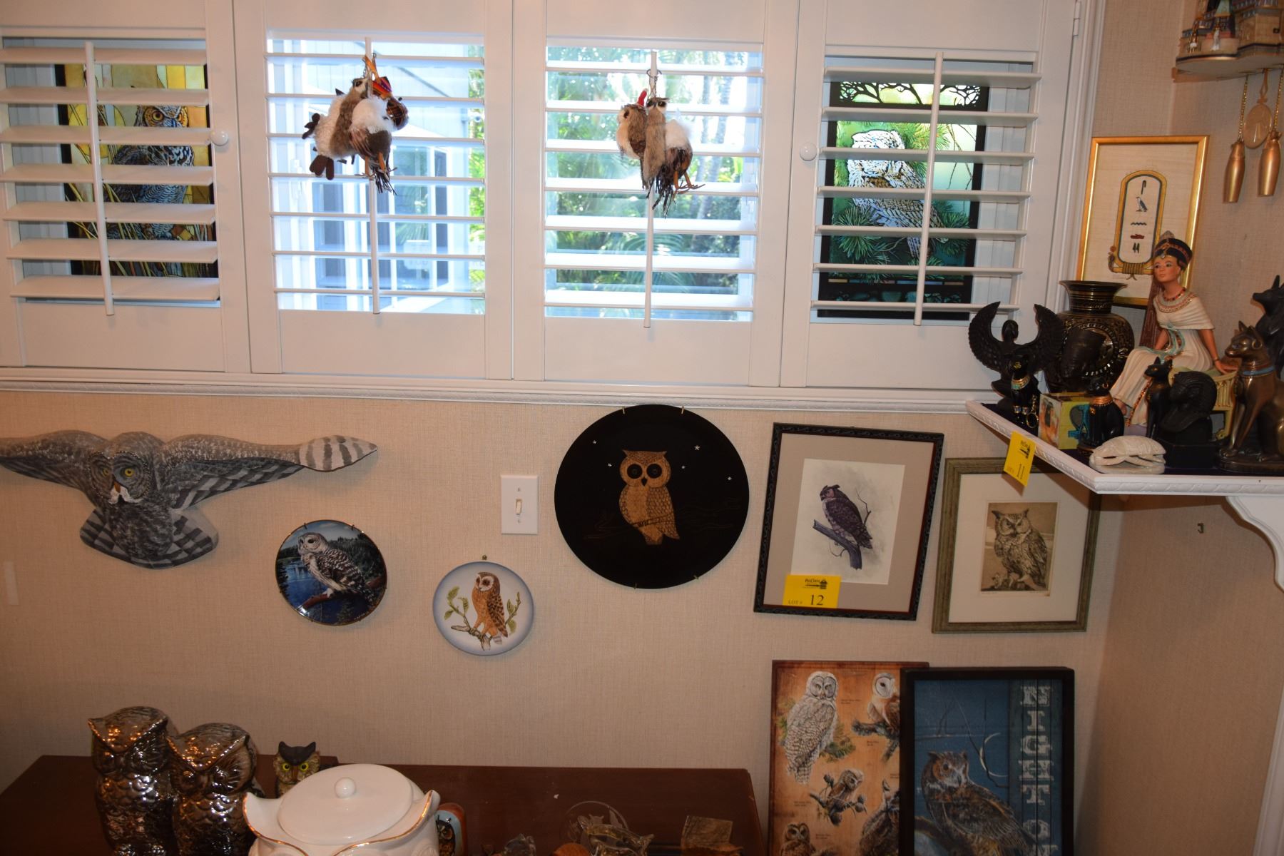 OWL LOT: FRAMED ART, COLLECTOR PLATES & CARVED WOODEN OWL (10 PCS)