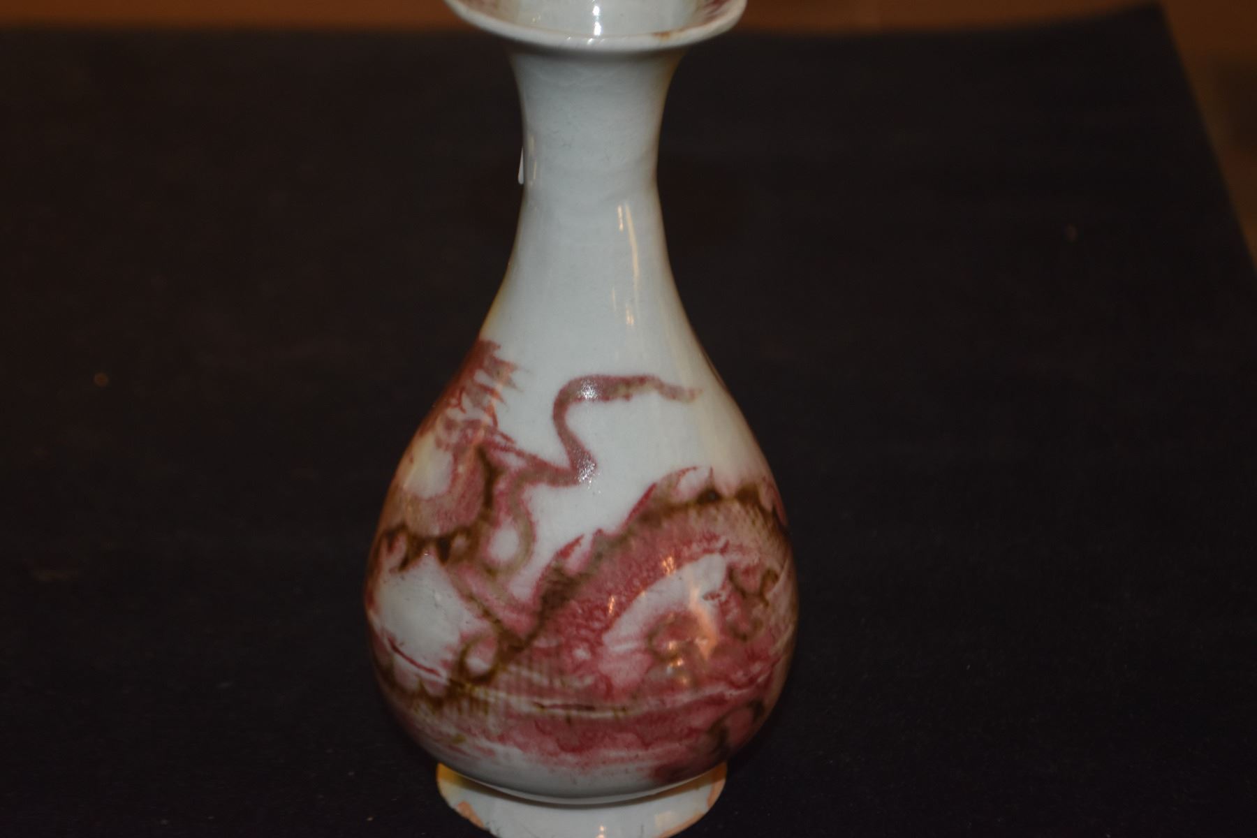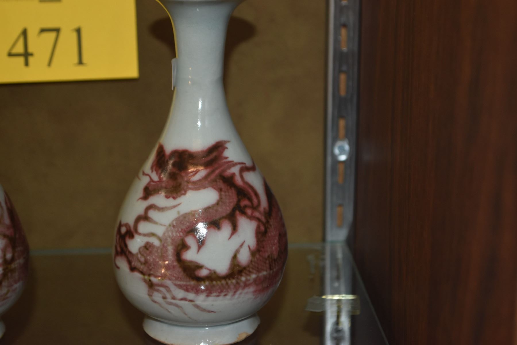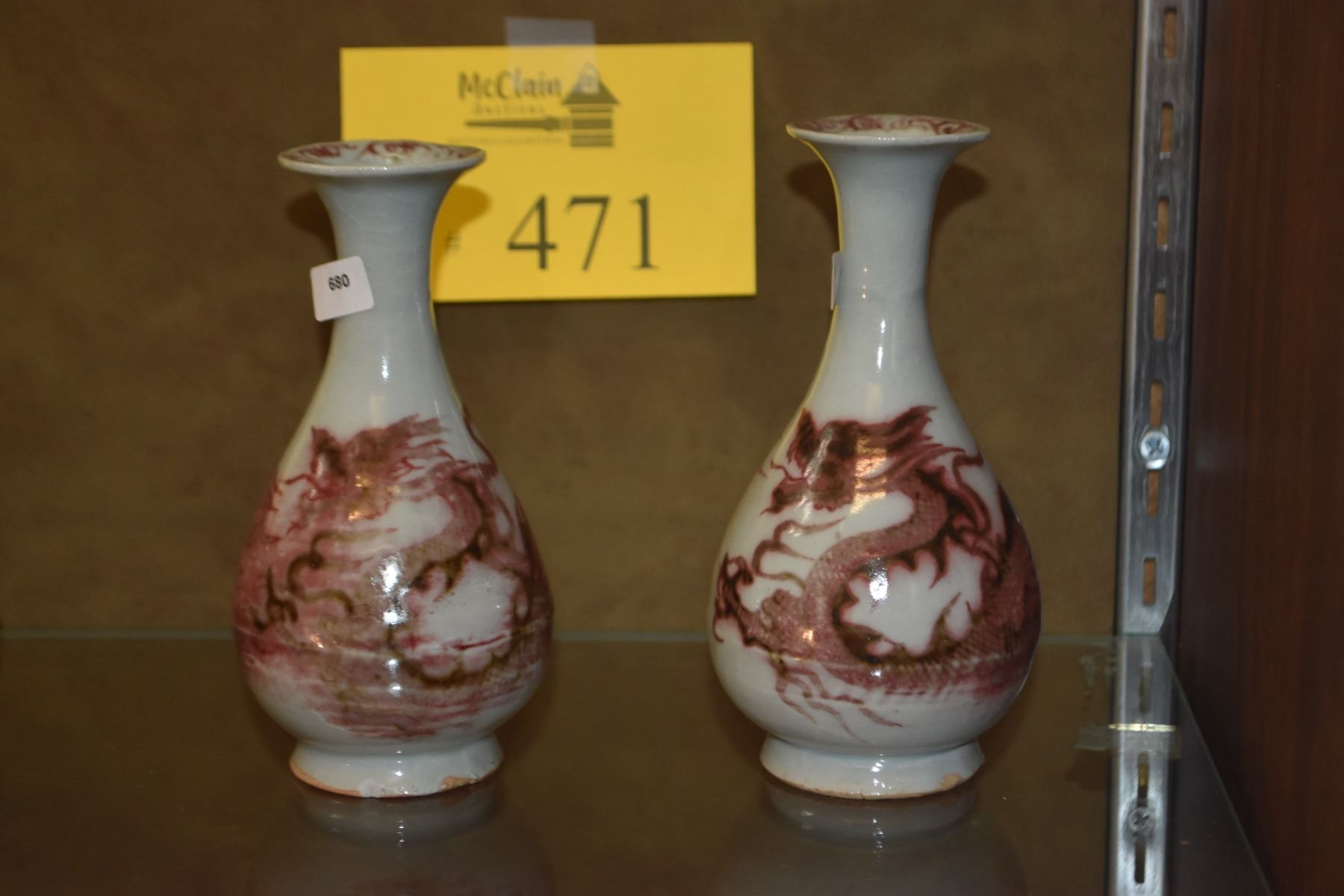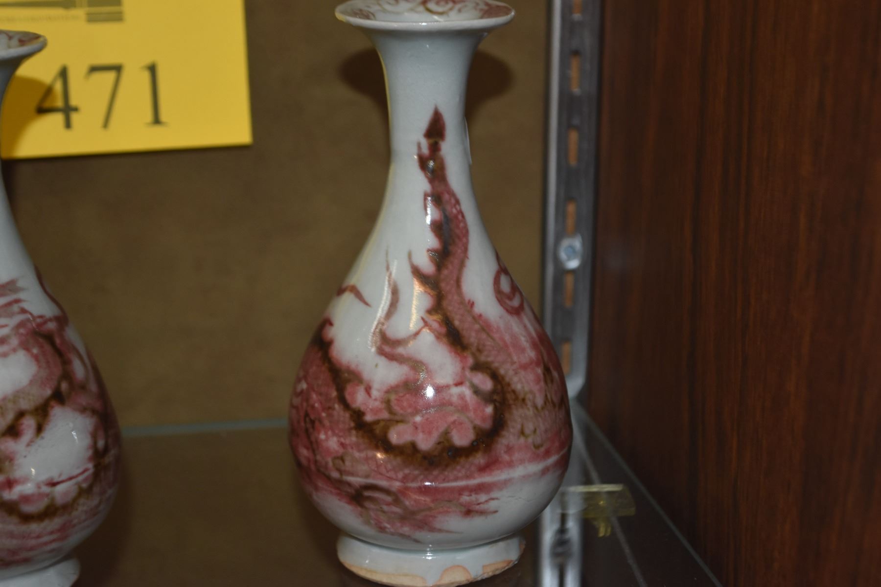 PAIR CHINESE PORCELAIN, PEARL SHAPED VASES W/COPPER RED DRAGON, NO MARKS (5 7/8") (PAIR)