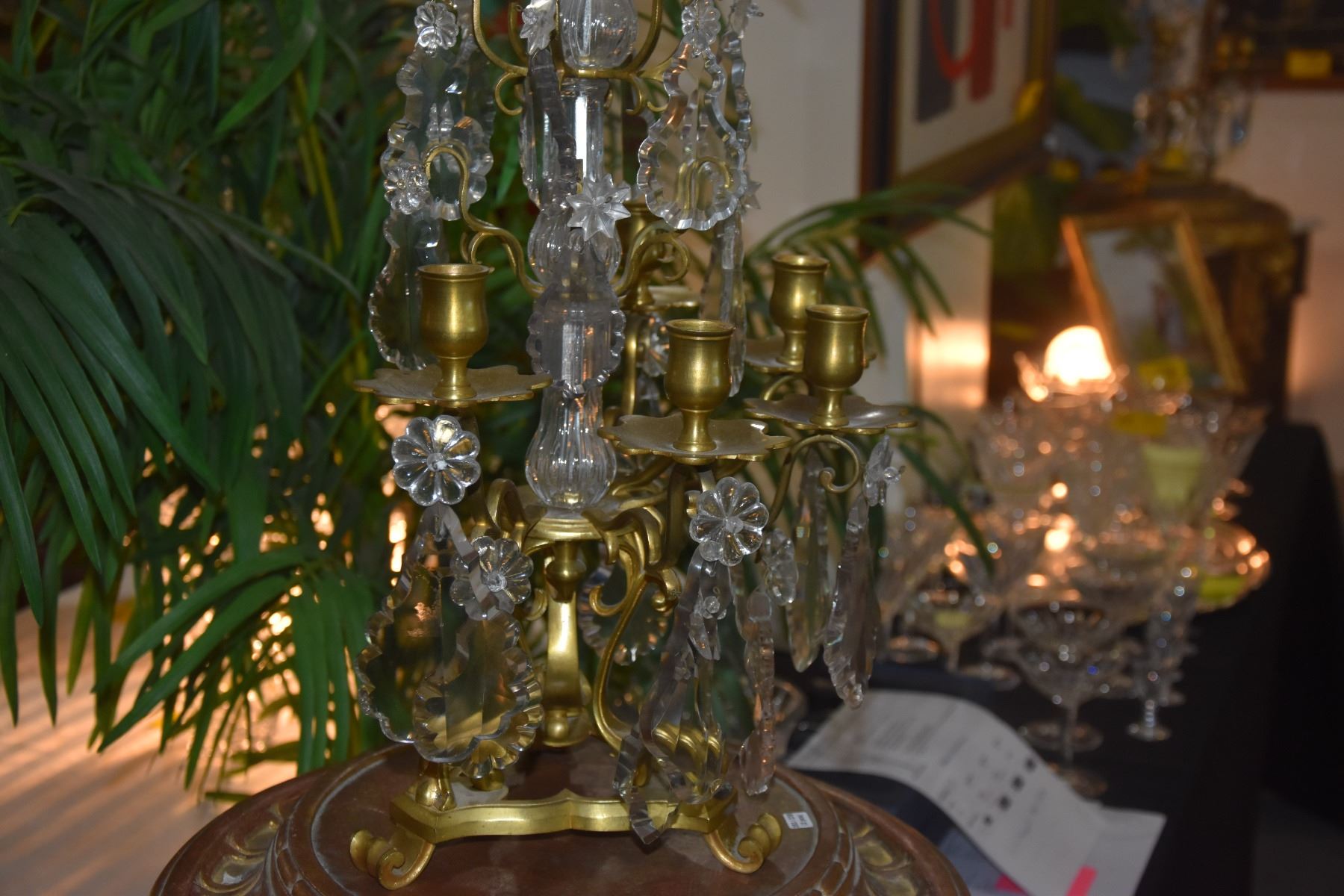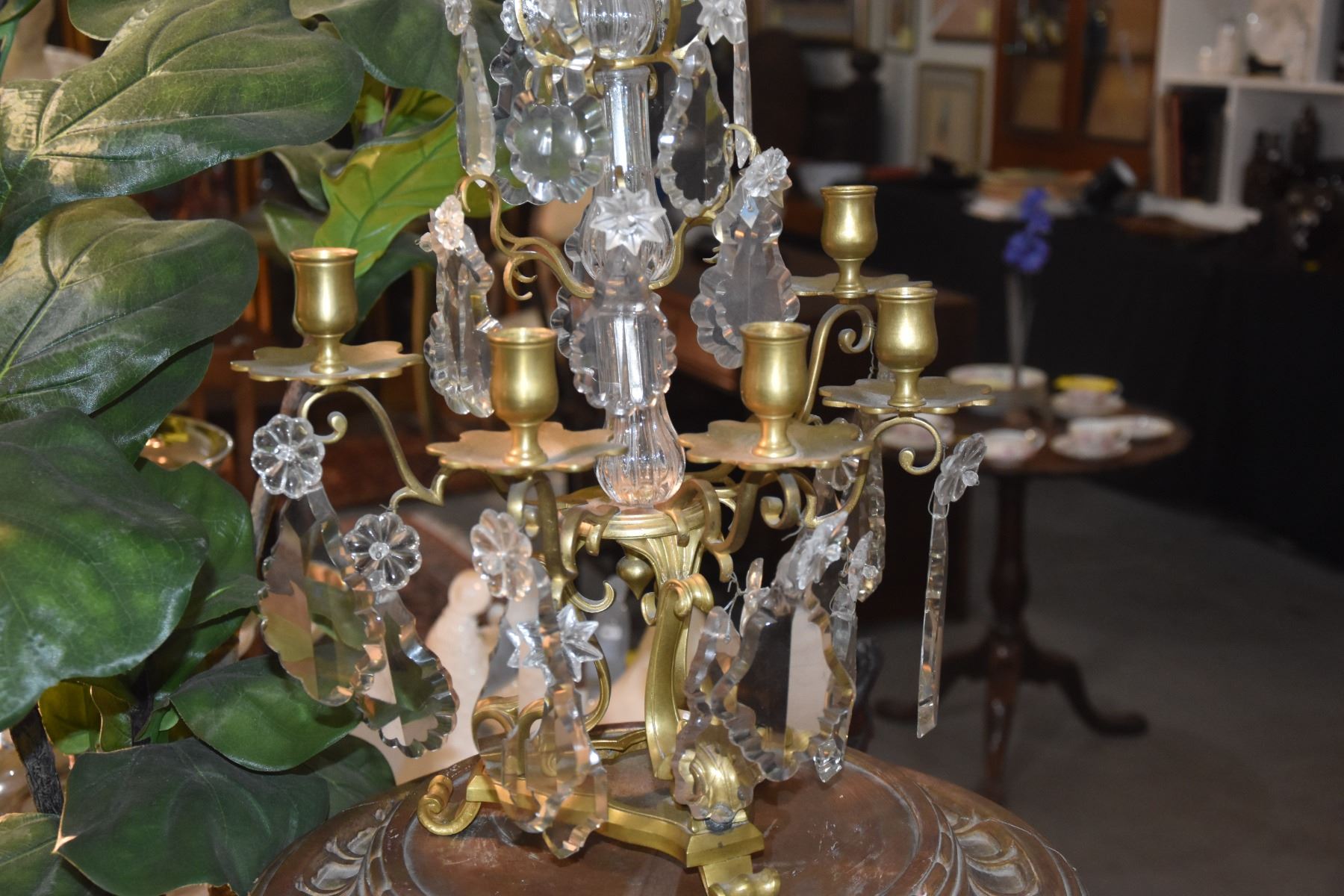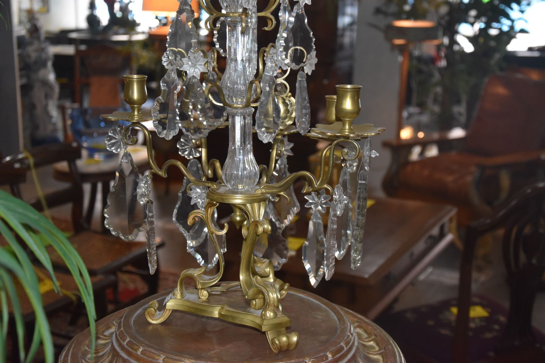PAIR GILT WORK BRONZE & CRYSTAL CANDELABRAS (26") (PAIR)