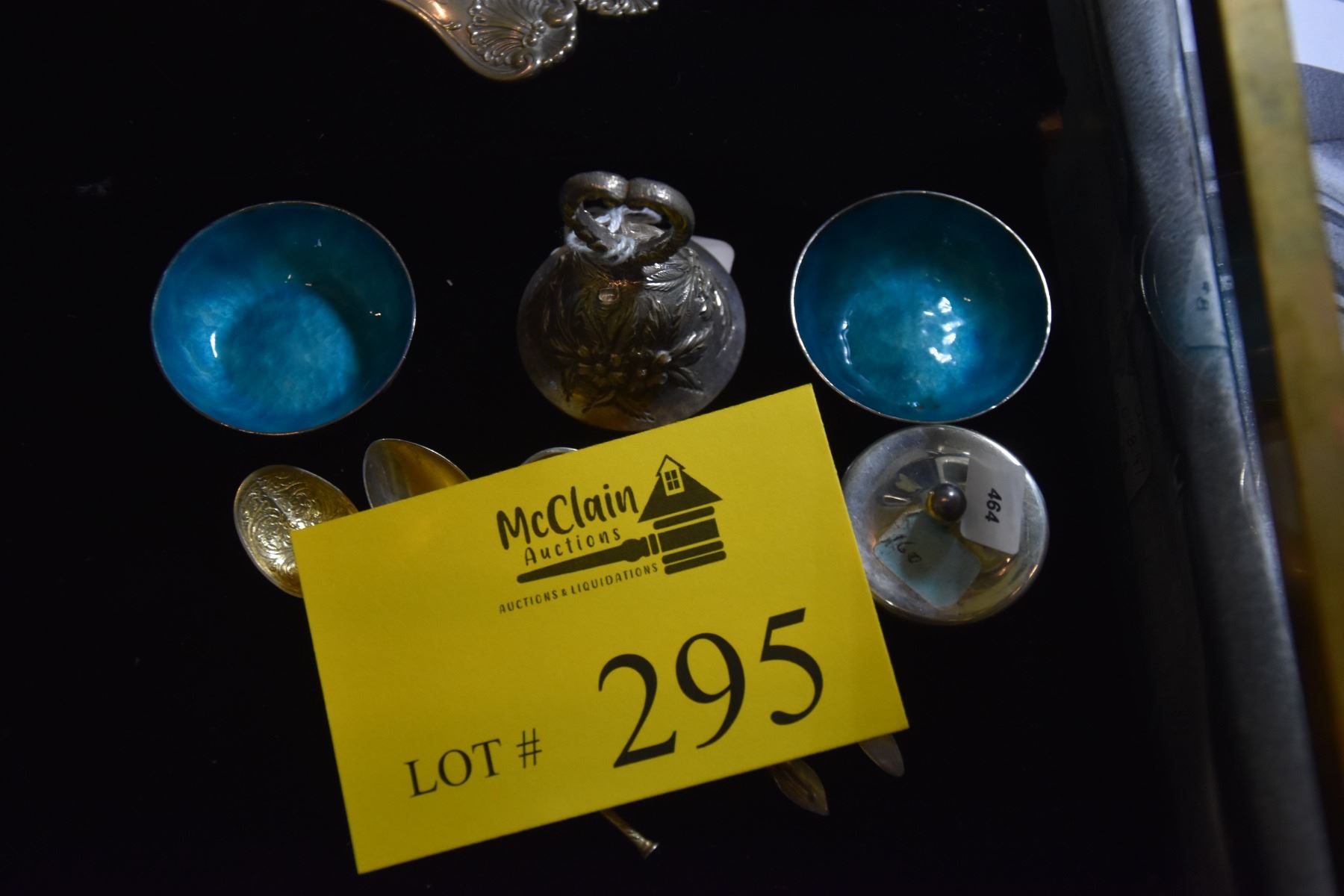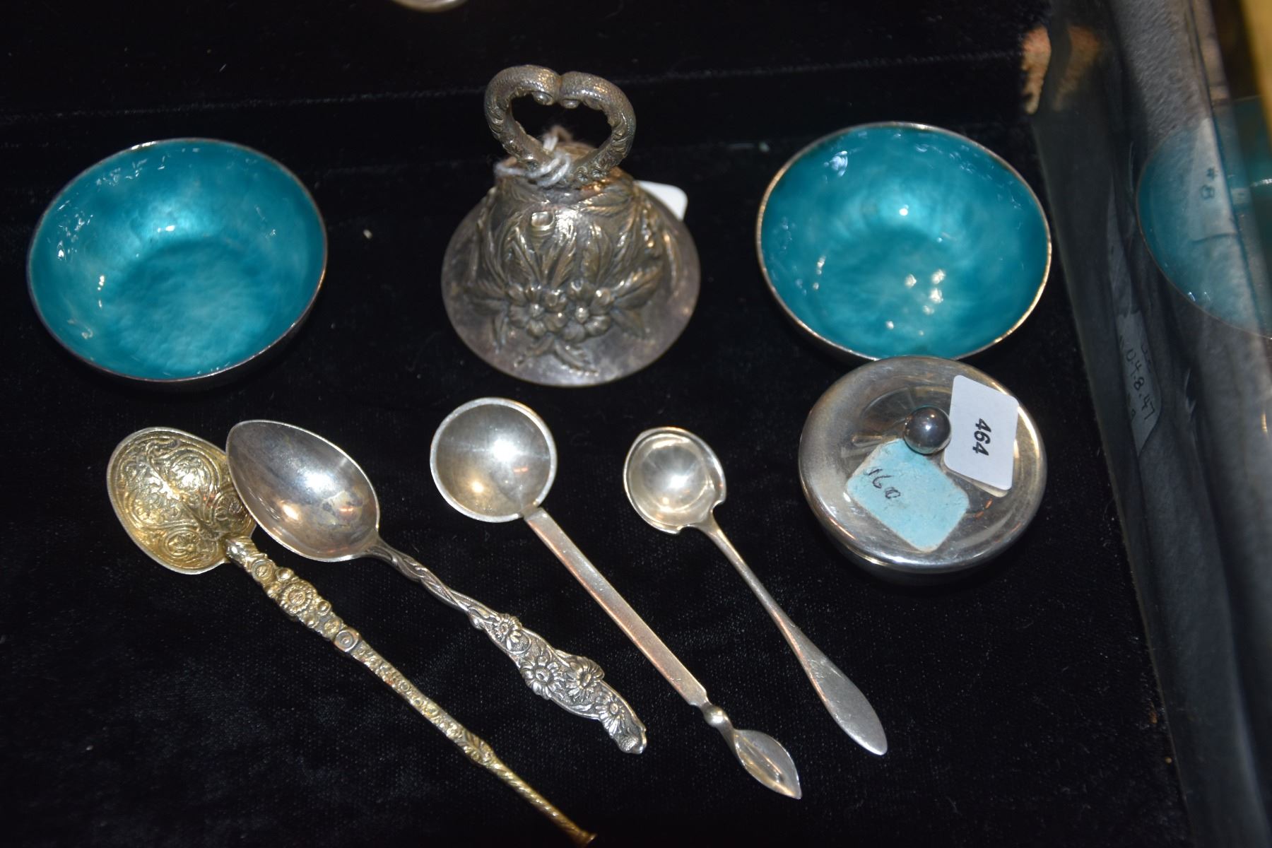 PAIR STERLING SILVER SALT CELLARS W/BLUE ENAMEL, THE PANIS GALLEY, FALMOUTH, MASS., STERLING SILVER SACCHARINE HOLDER W/LIFT OFF LID, AMERICA 1980'S, STERLING SILVER BELL W/FLORAL PATTERN & 4 STERLING SPOONS (154 G) (9 PCS)