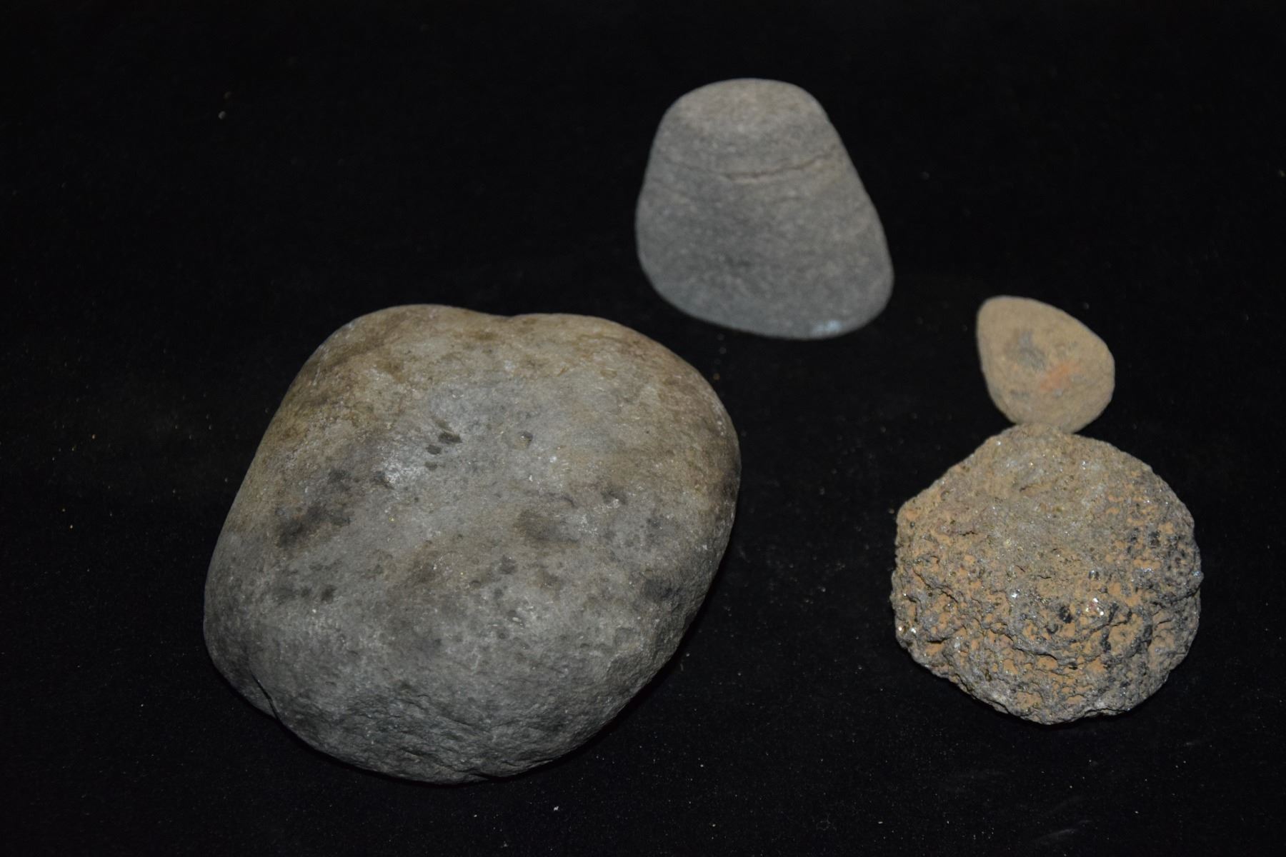 PRE-CONTACT HAWAIIAN STONES, LARGE HAMMER STONE W/THUMB INDENTIONS, CRUDE FISHING WEIGHT STONE W/MICA FLECKS, HAND HELD ABRADER & STONE GOURD STOPPER (4 PCS)