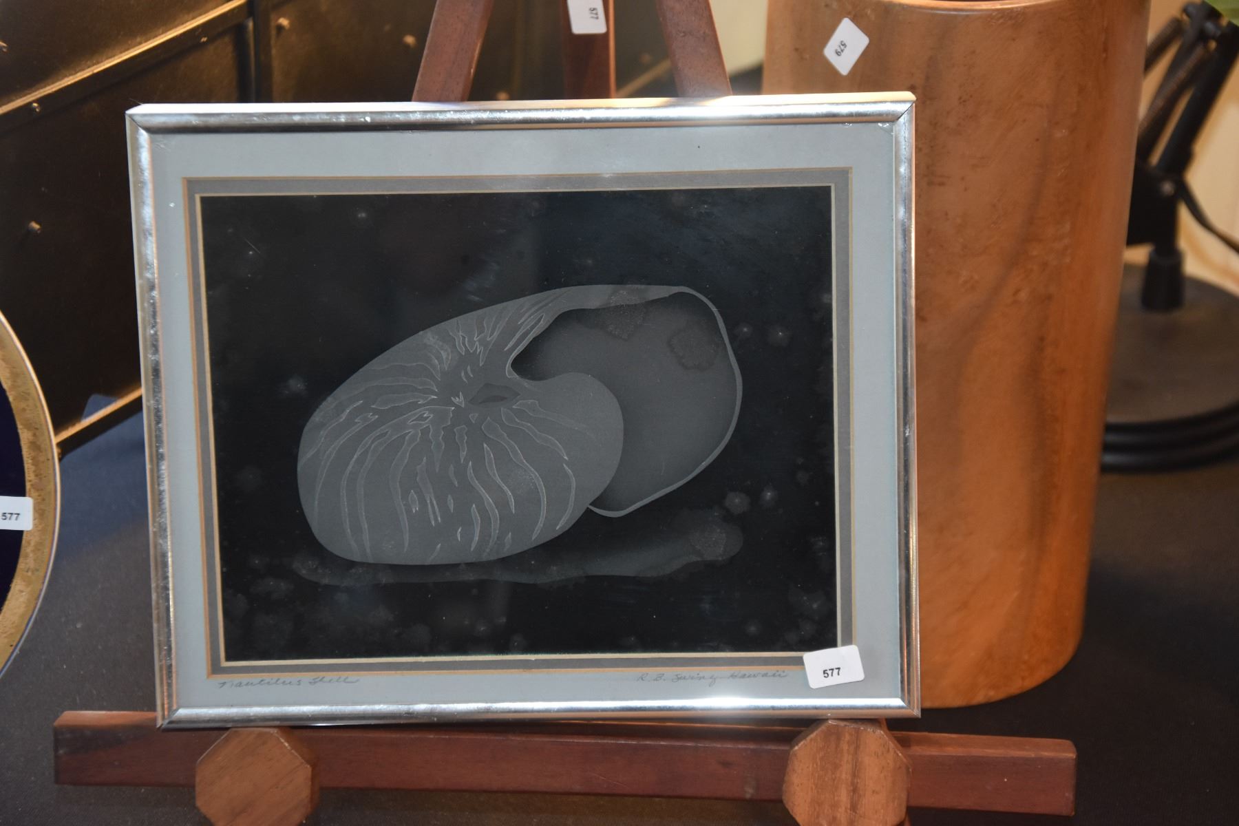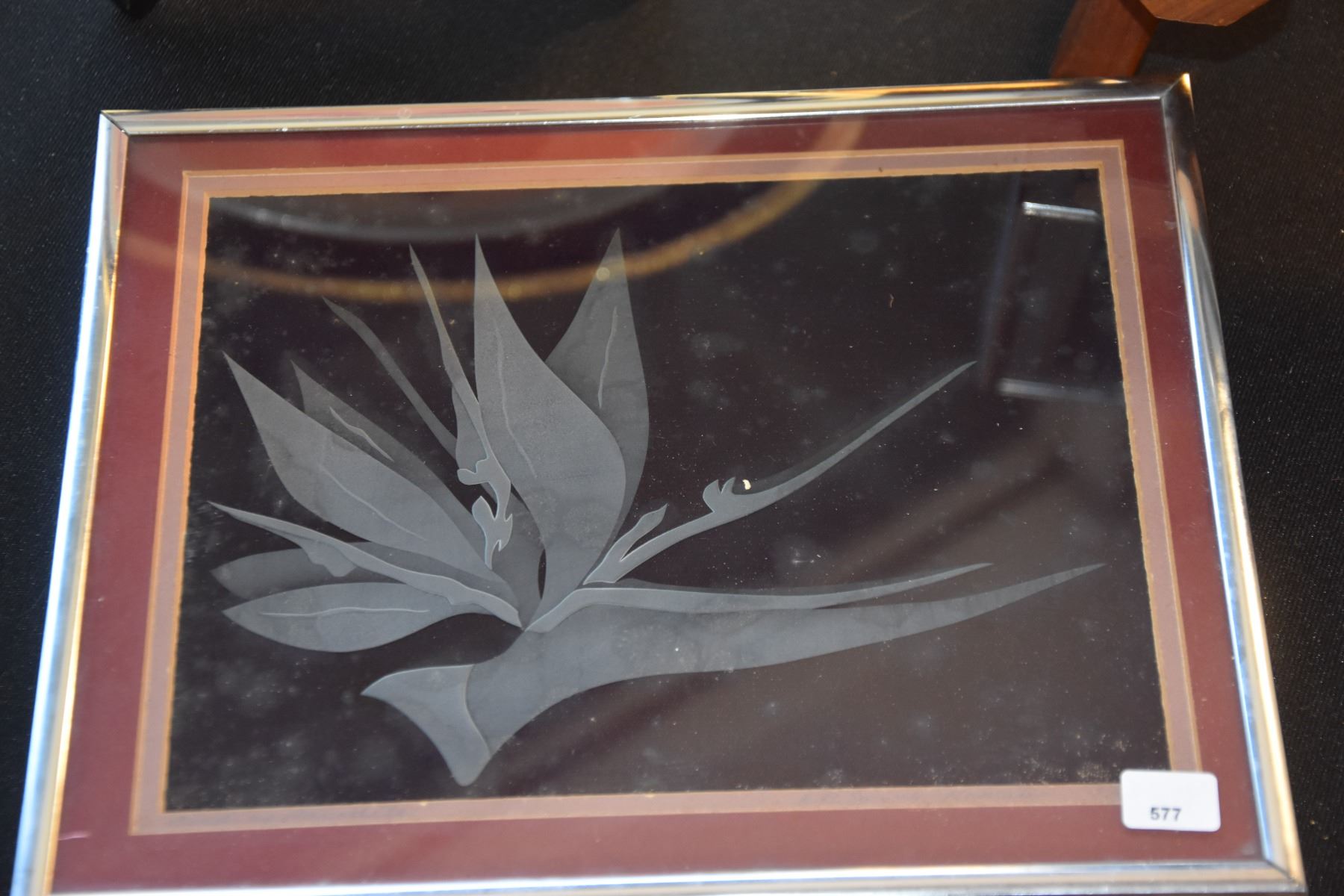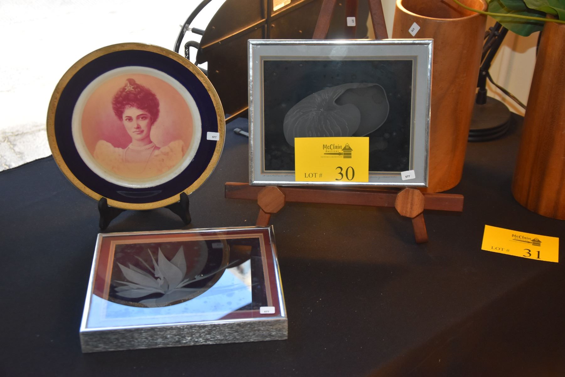 PRINCESS KAIULANI COLLECTOR PLATE, FRAMED VINTAGE ETCHED GLASS ART W/BIRD OF PARADISE & SHELL W/KOA EASEL (4 PCS)