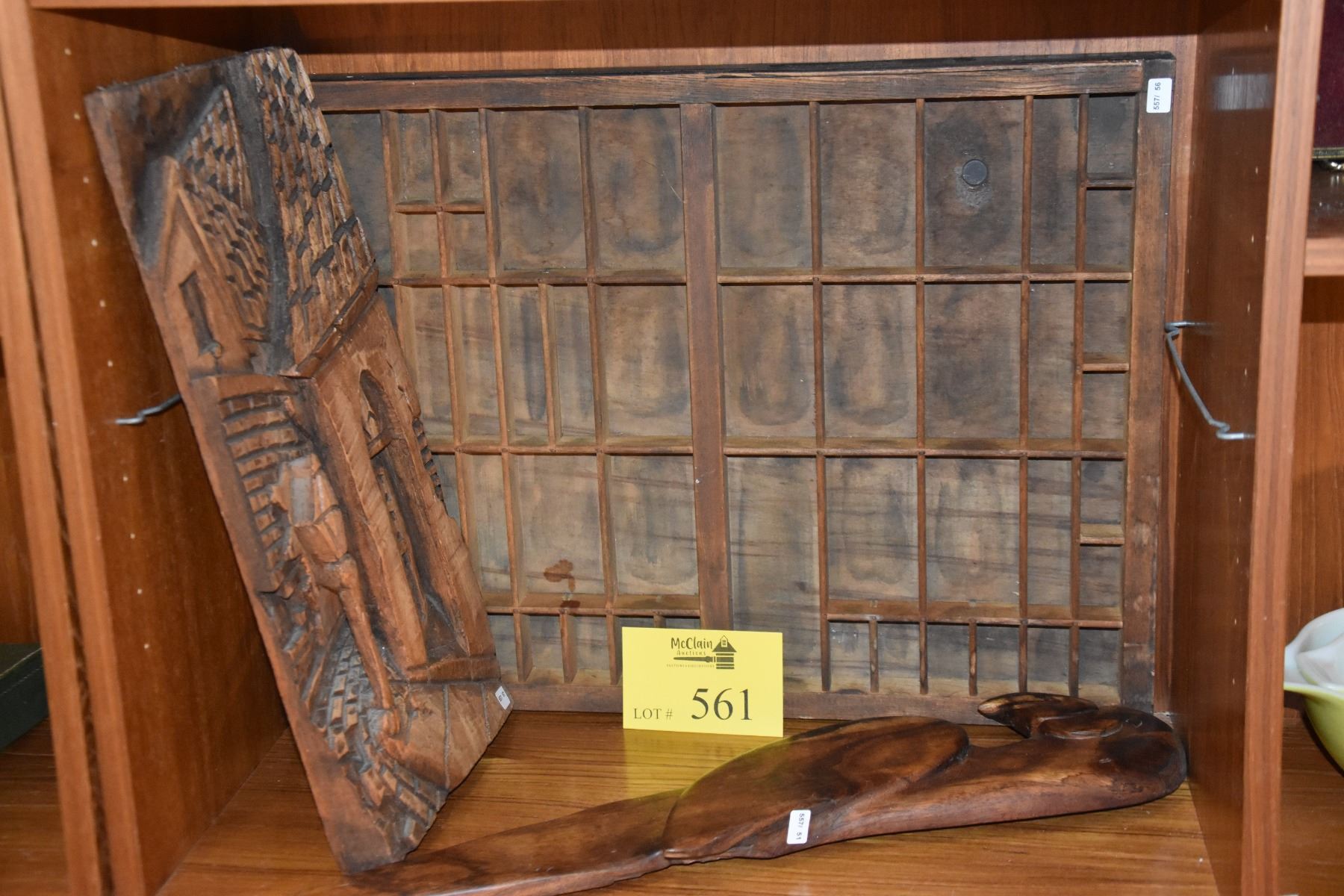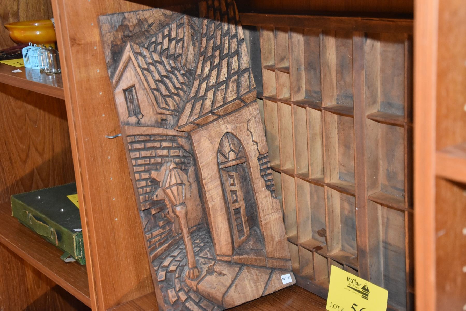 PRINTERS BOX, WOODEN WALL PARROT & WOOD CARVED STREET SCENE (3 PCS)