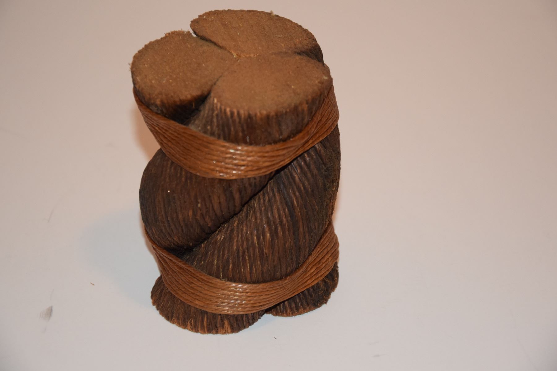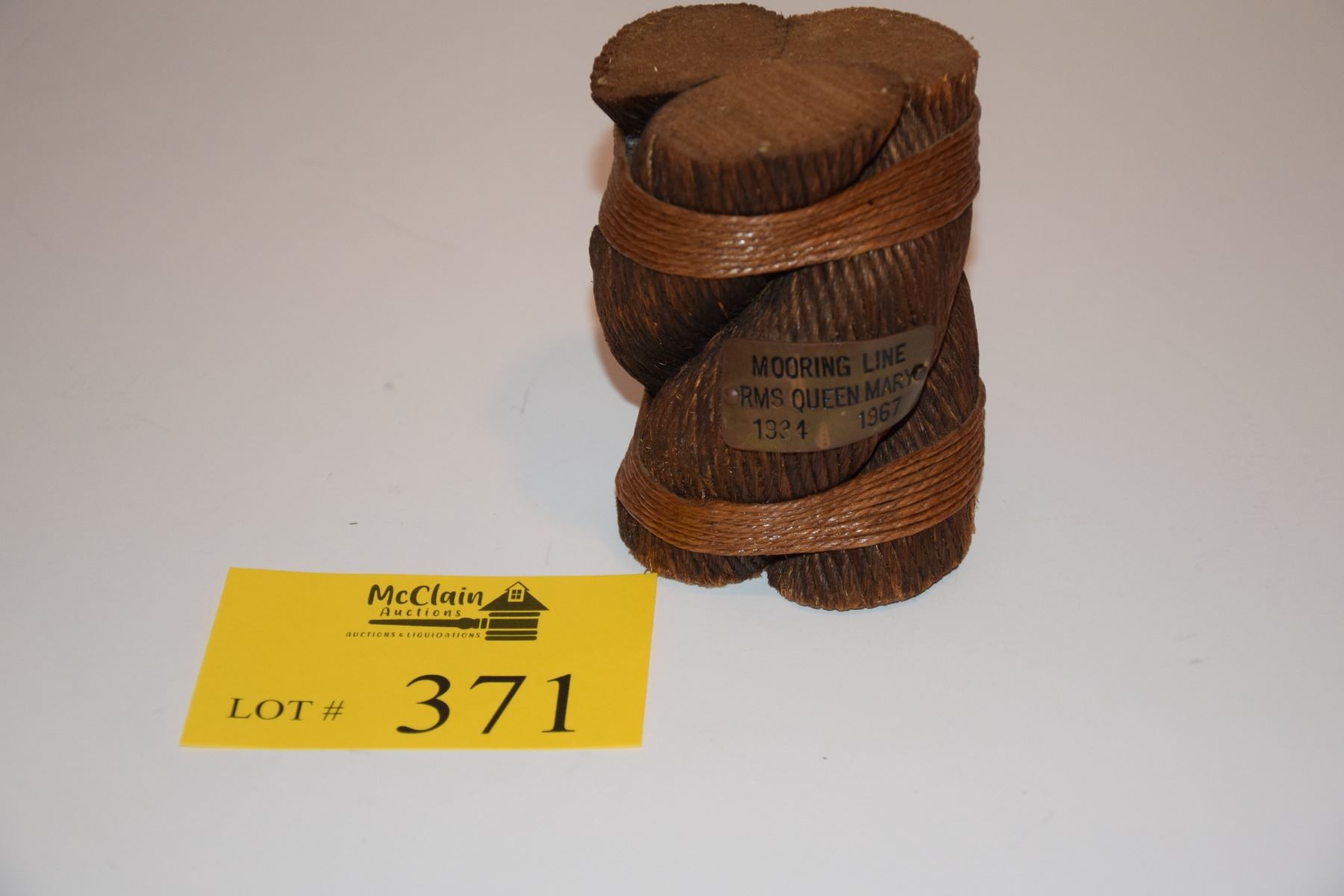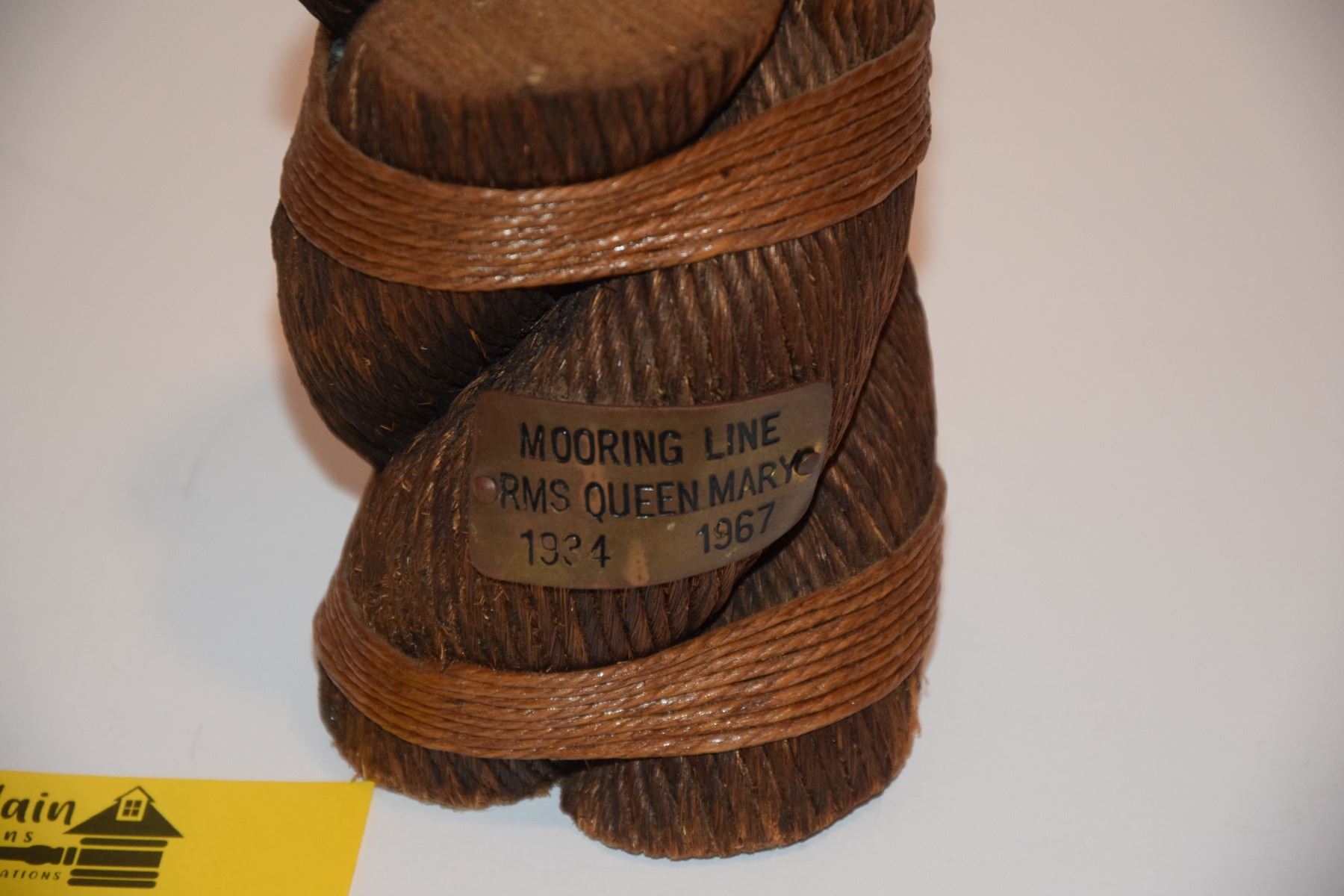 QUEEN MARY: A PIECE OF HER MOORING LINE W/A BRASS PLAQUE ATTACHED STATING "MOORING LINE" R.M.S. QUEEN ARY 1934-1967" (5" TALL X 3 1/.2" D)