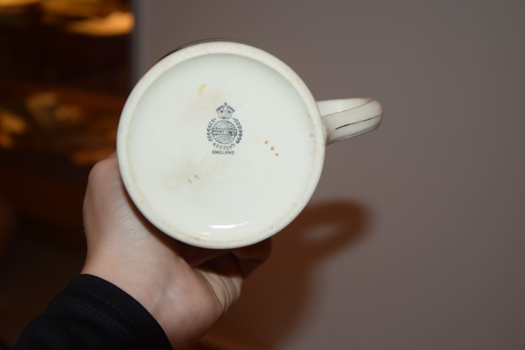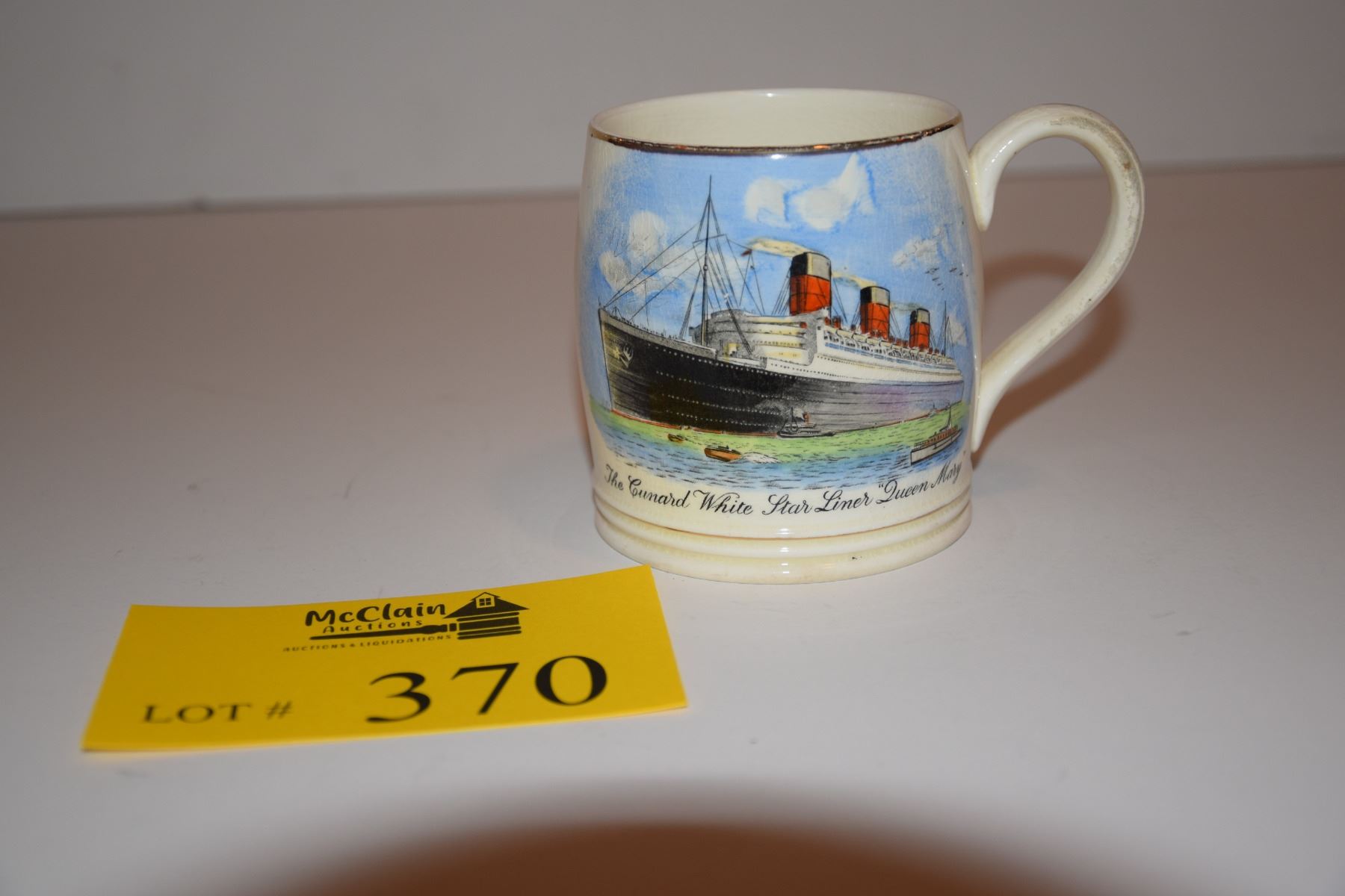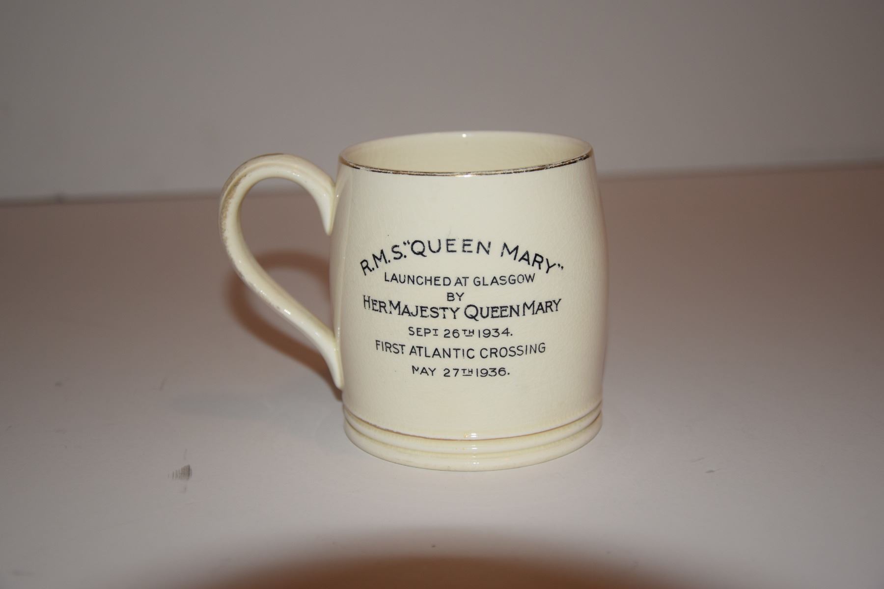 QUEEN MARY: CHINA MUG COMMISSIONED BY CUNARD FOR HER MAIDEN VOYAGE & EXECUTED BY MINTONS W/COLORED PORTRAIT IN CHANNEL OVER HER & COMPANY'S NAME ON REVERSE