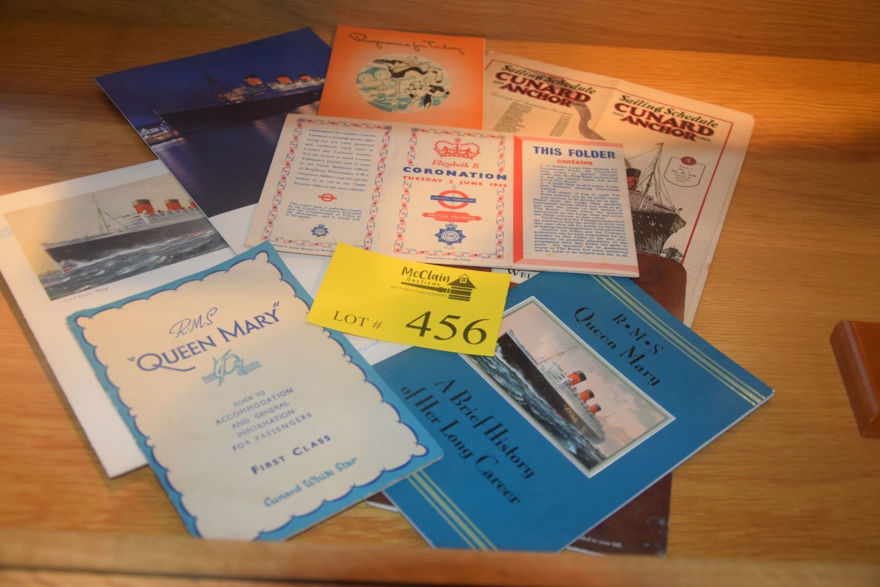 QUEEN MARY EPHEMERA: ELIZABETH R CORONATION, PROGRAMME FOR TODAY, WELCOME ABOARD, SAILING SCHEDULE CUNARD & ANCHOR LINES, A BRIEF HISTOY, QUEEN MARY FAREWELL, FARWELL DINNER MENU 6/7/1953, CORONATION DINNER MENU GUIDE TO ACCOMMODATION & GENERAL INFO