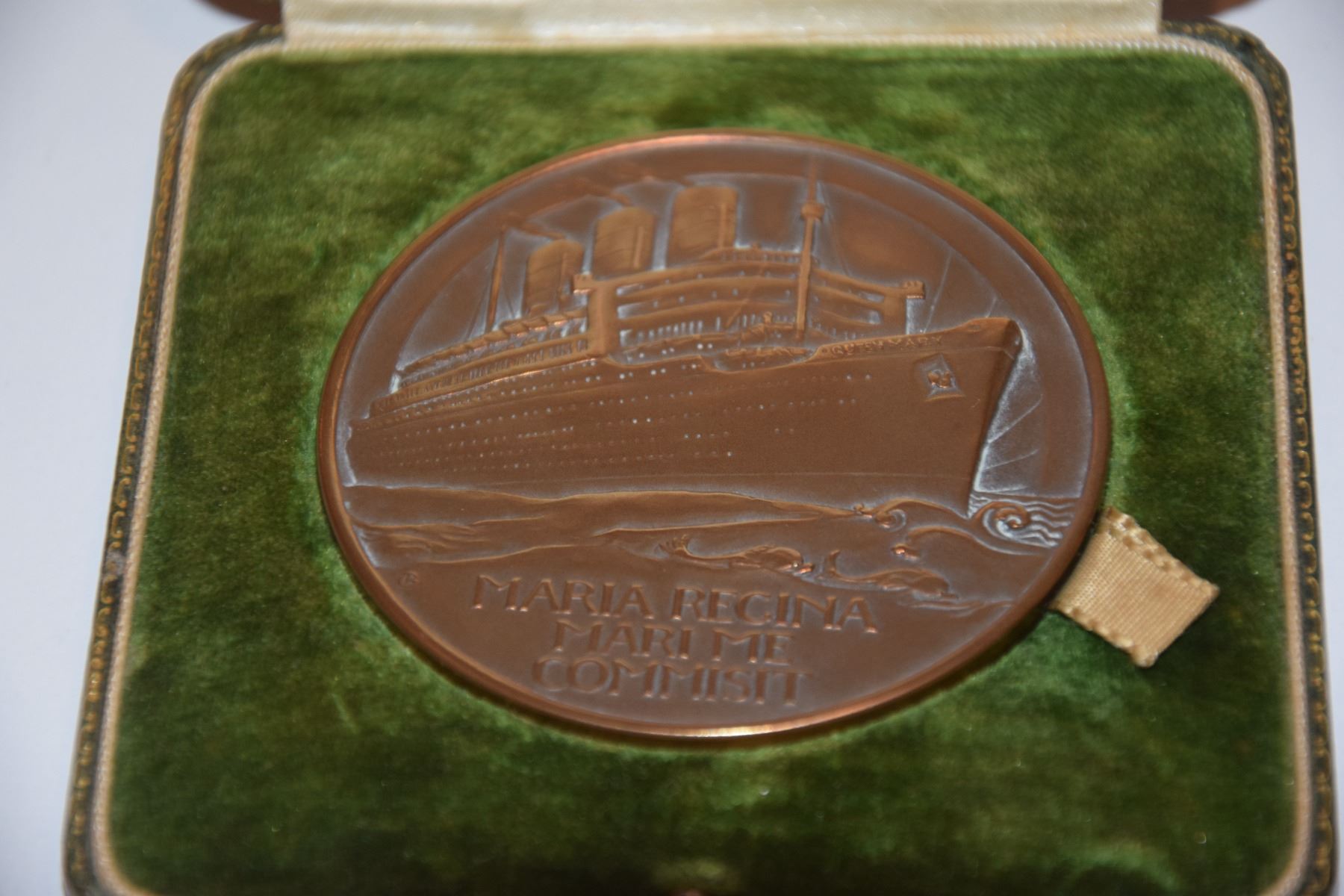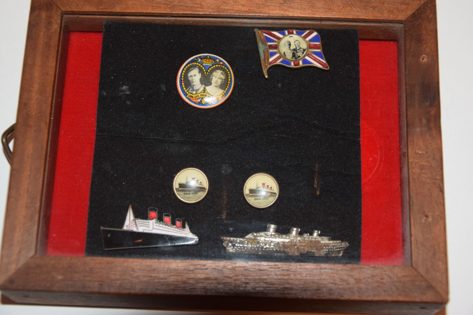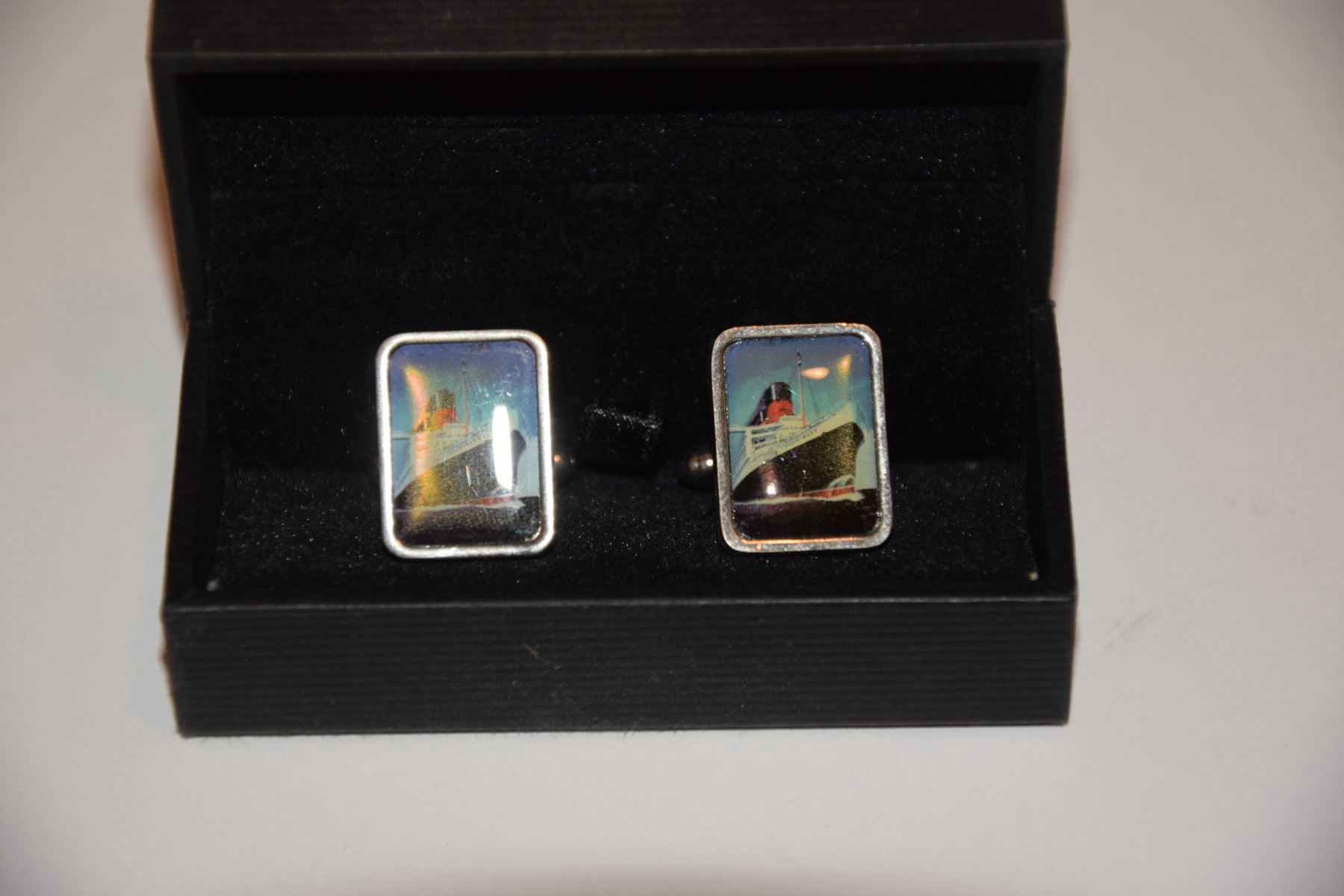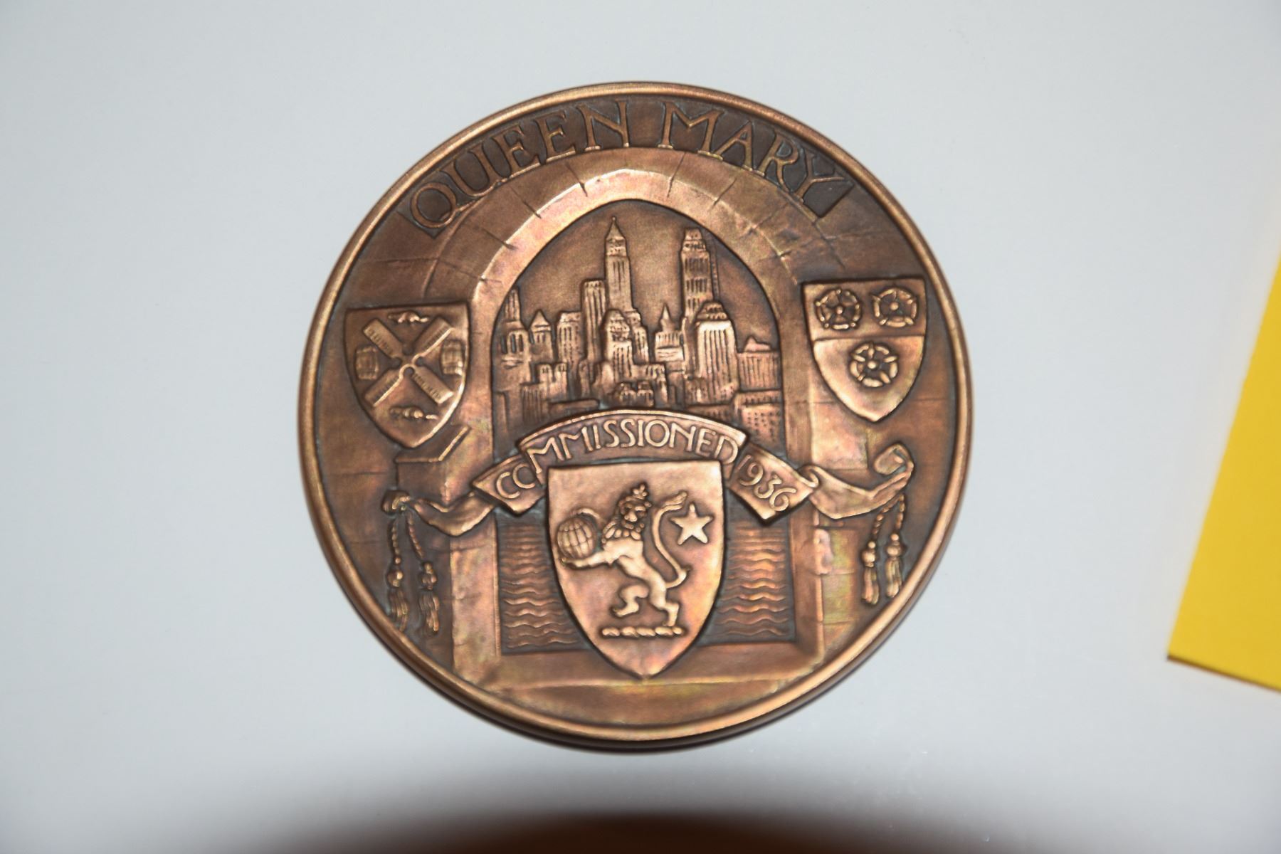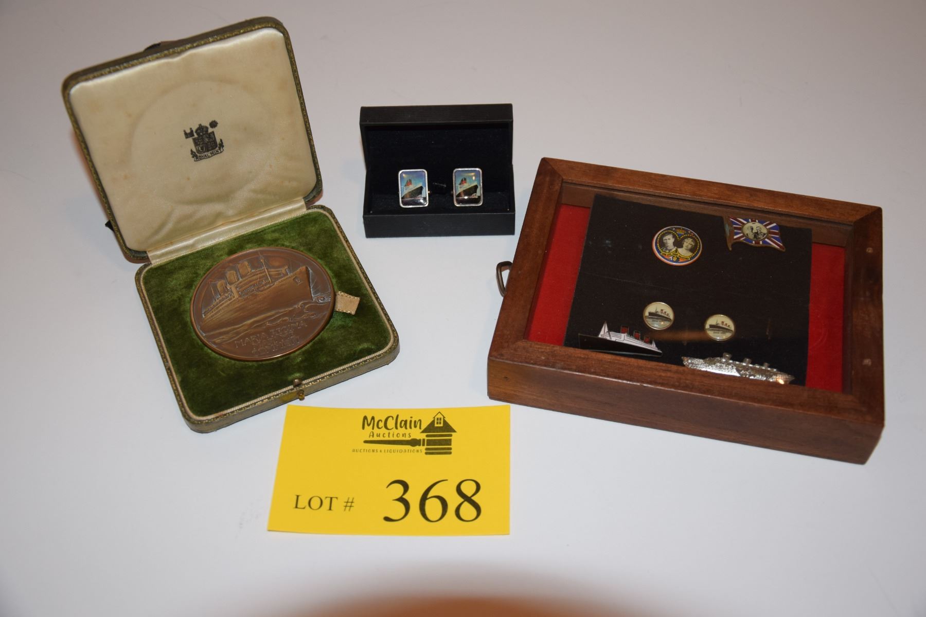 QUEEN MARY MEDALLION W/ROYAL MINT BOX & SHADOW BOX CONTAINING 6 QUEEN MARY PINS & CUFF LINS (3 PCS)