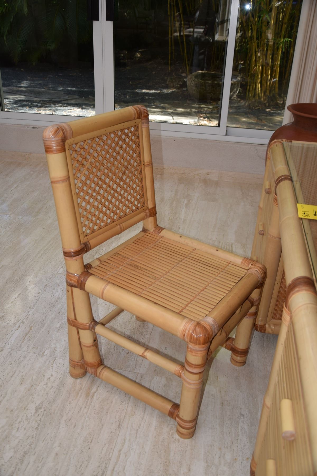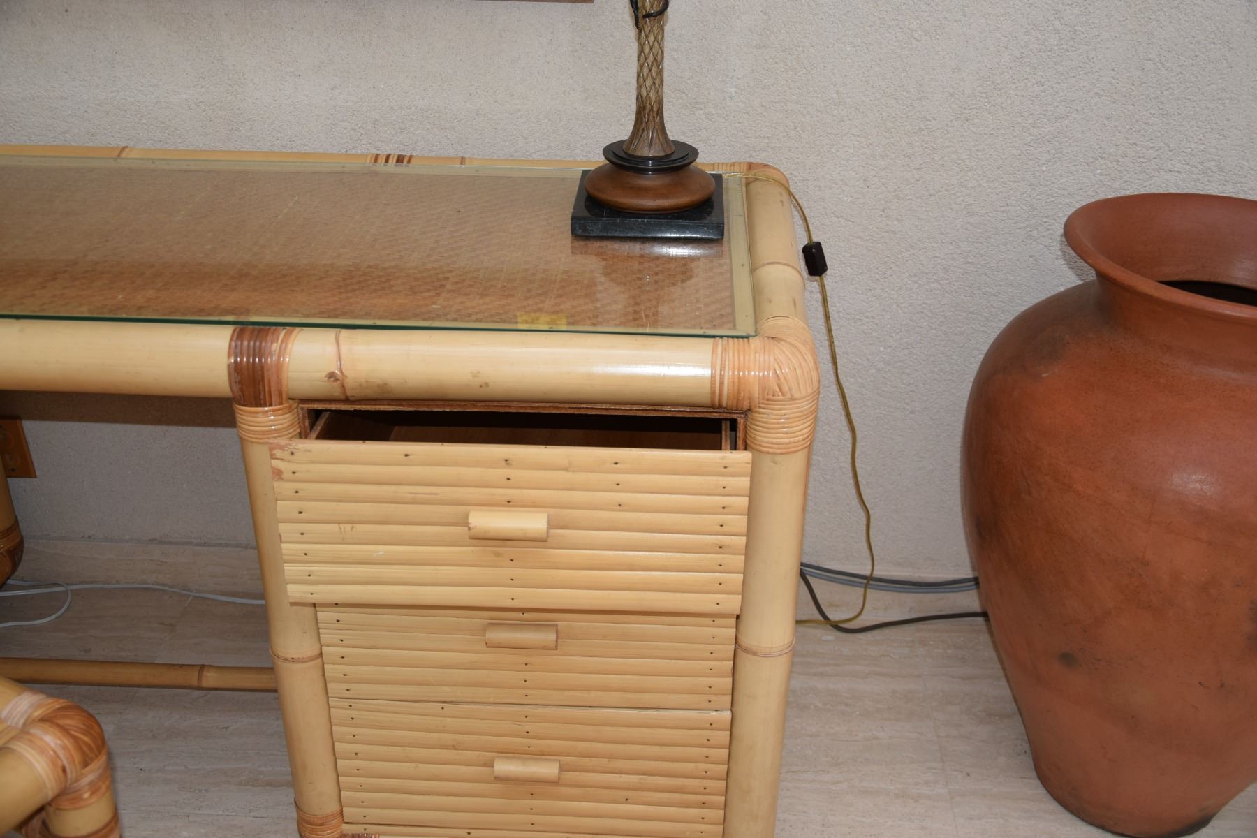 RATTAN 6 DRAWER DESK W/GLASS TOP & CHAIR (DESK: 69" X 25" X 31")