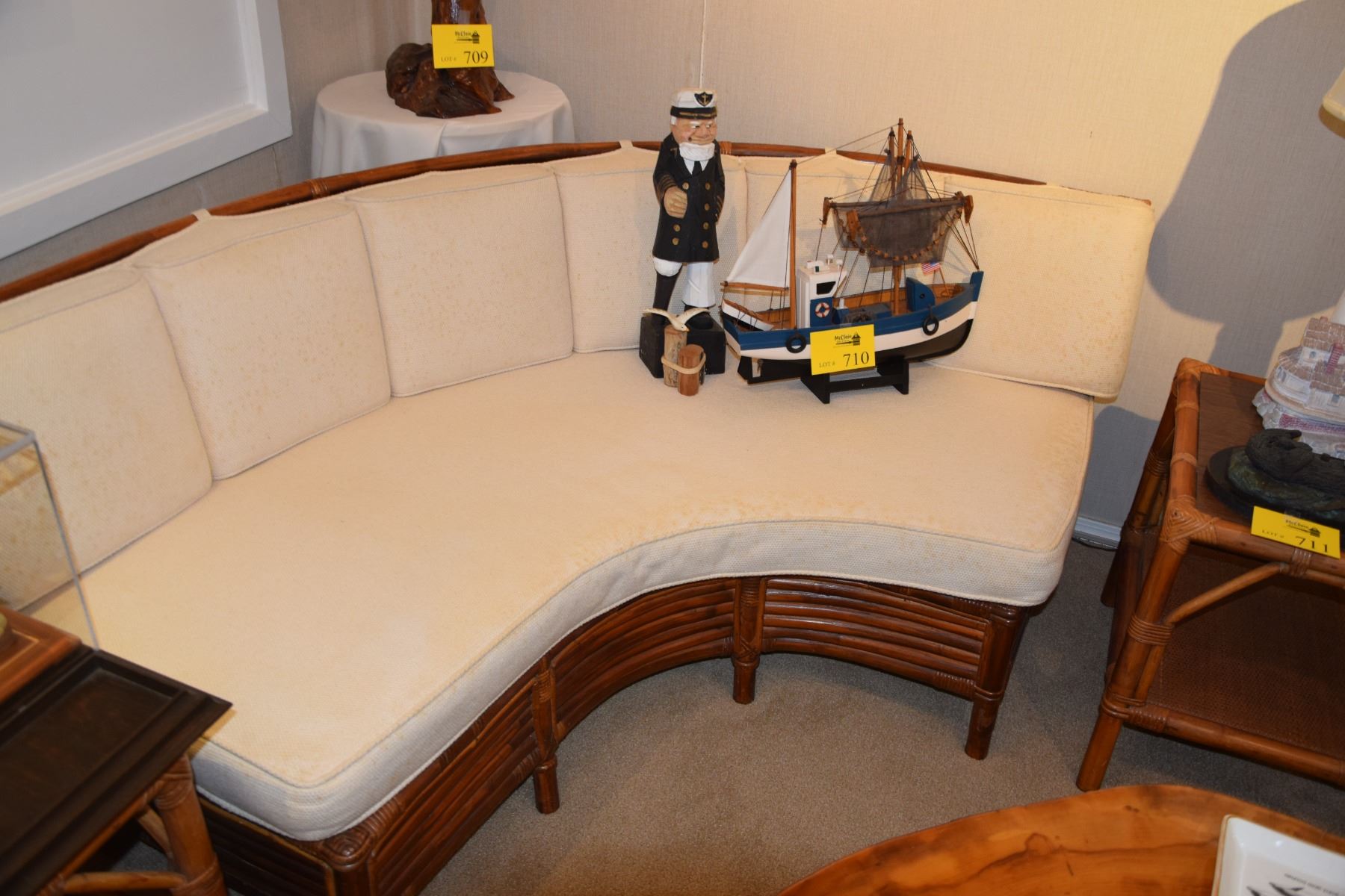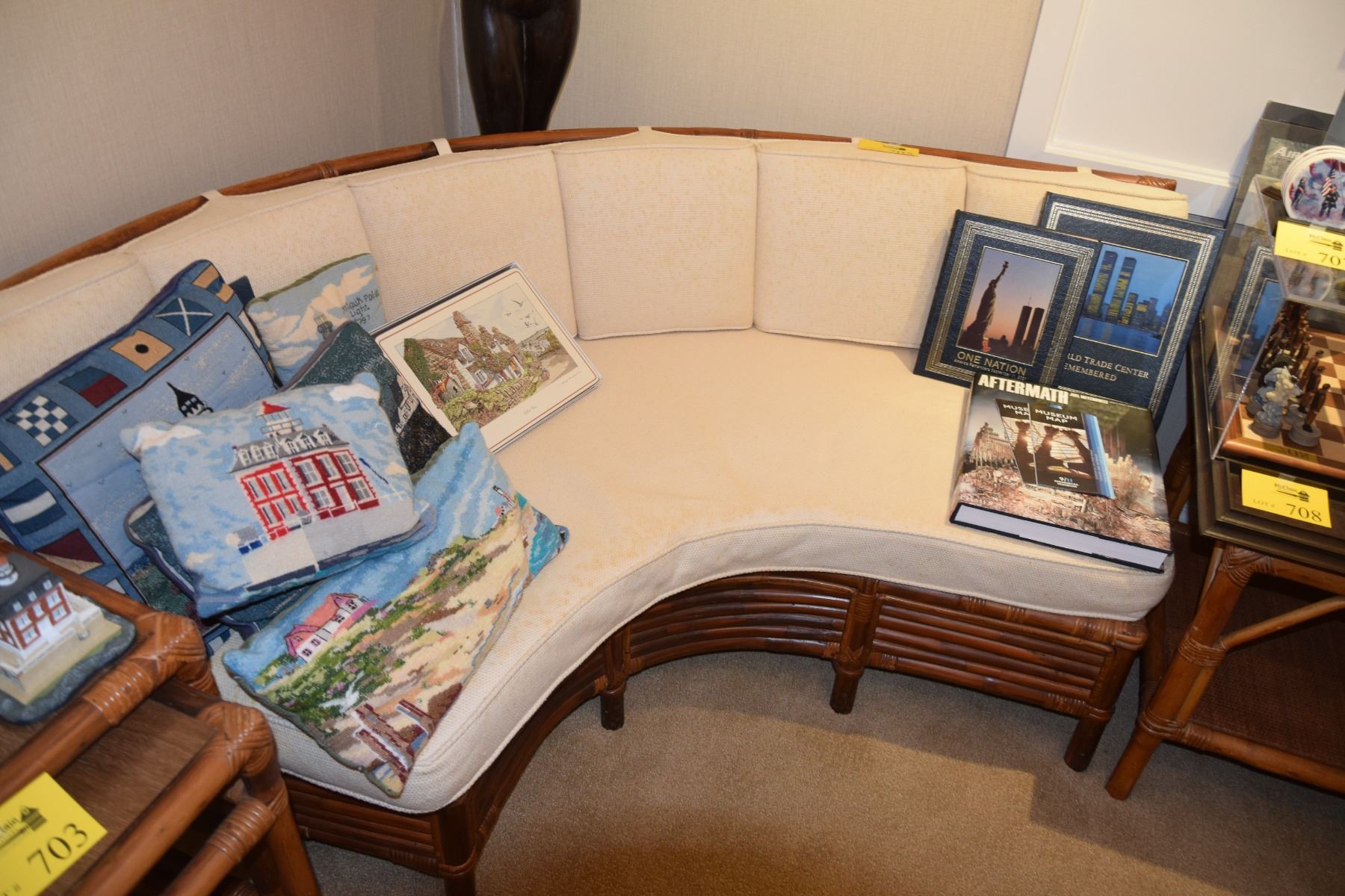 RATTAN QUARTER MOON COUCHES W/CUSHIONS (PAIR)