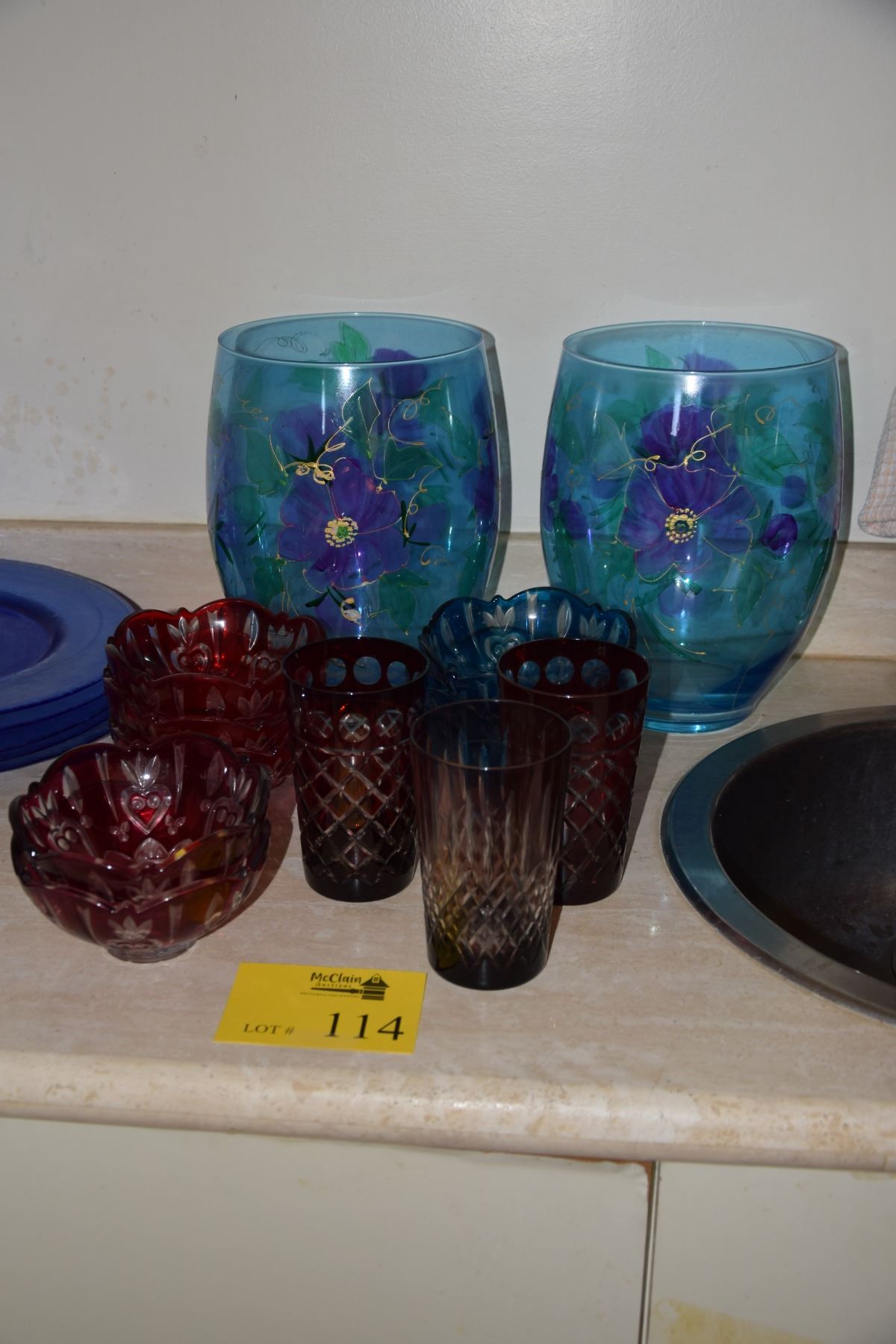 RED & BLUE CUT TO CLEAR BOWLS, WATER GLASSES & FLORAL VASES (13 PCS)