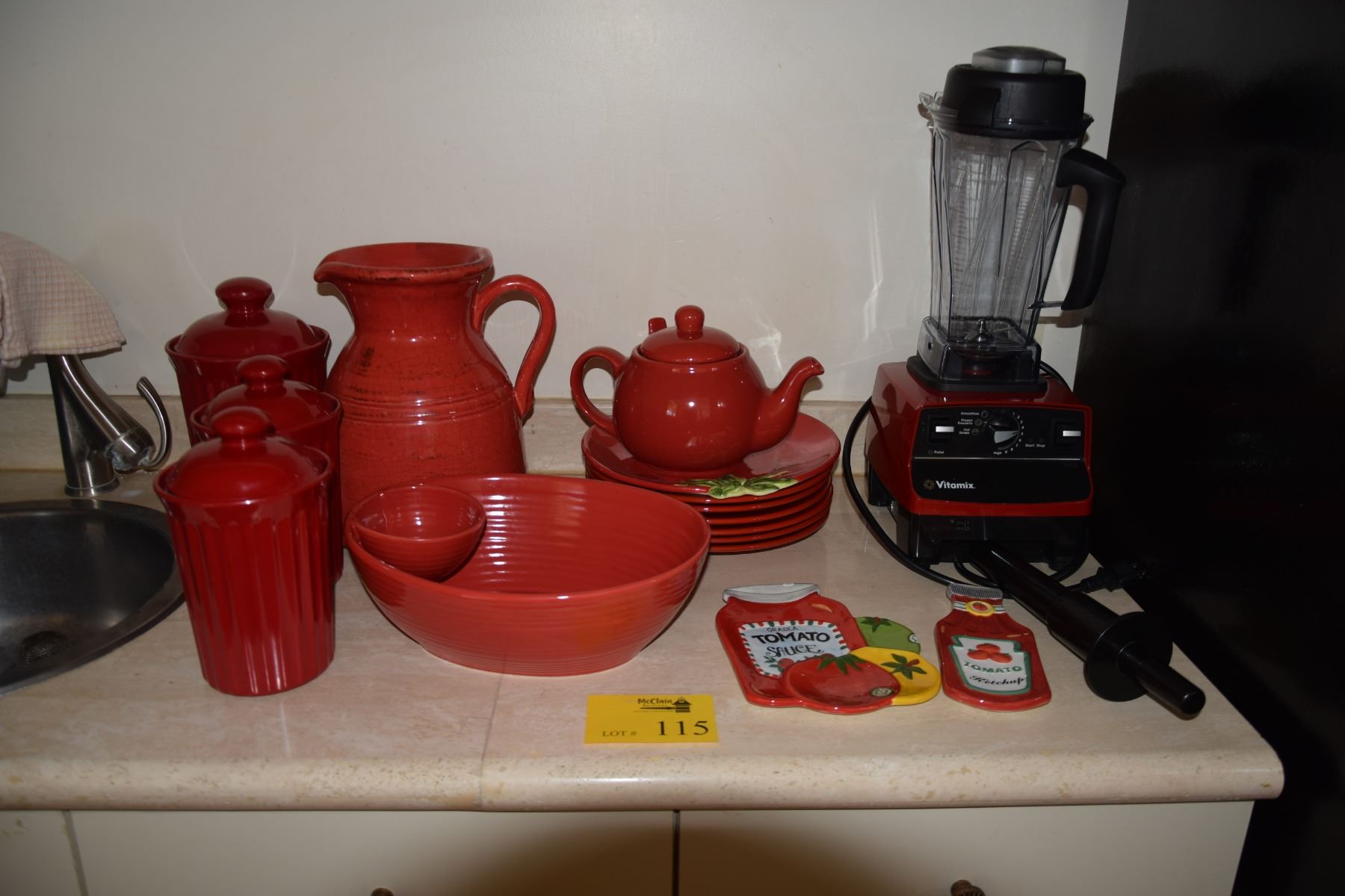 RED DISHES, CHIP/DIP BOWL, PITCHER, SPOON RESTS & VITAMIX BLENDER (13 PCS)