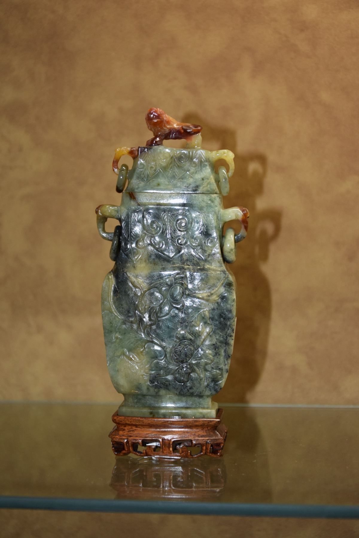 RED & GREEN JADE LIDDED VASE W/RING HANDLES & STAND (6" X 2 1/2")