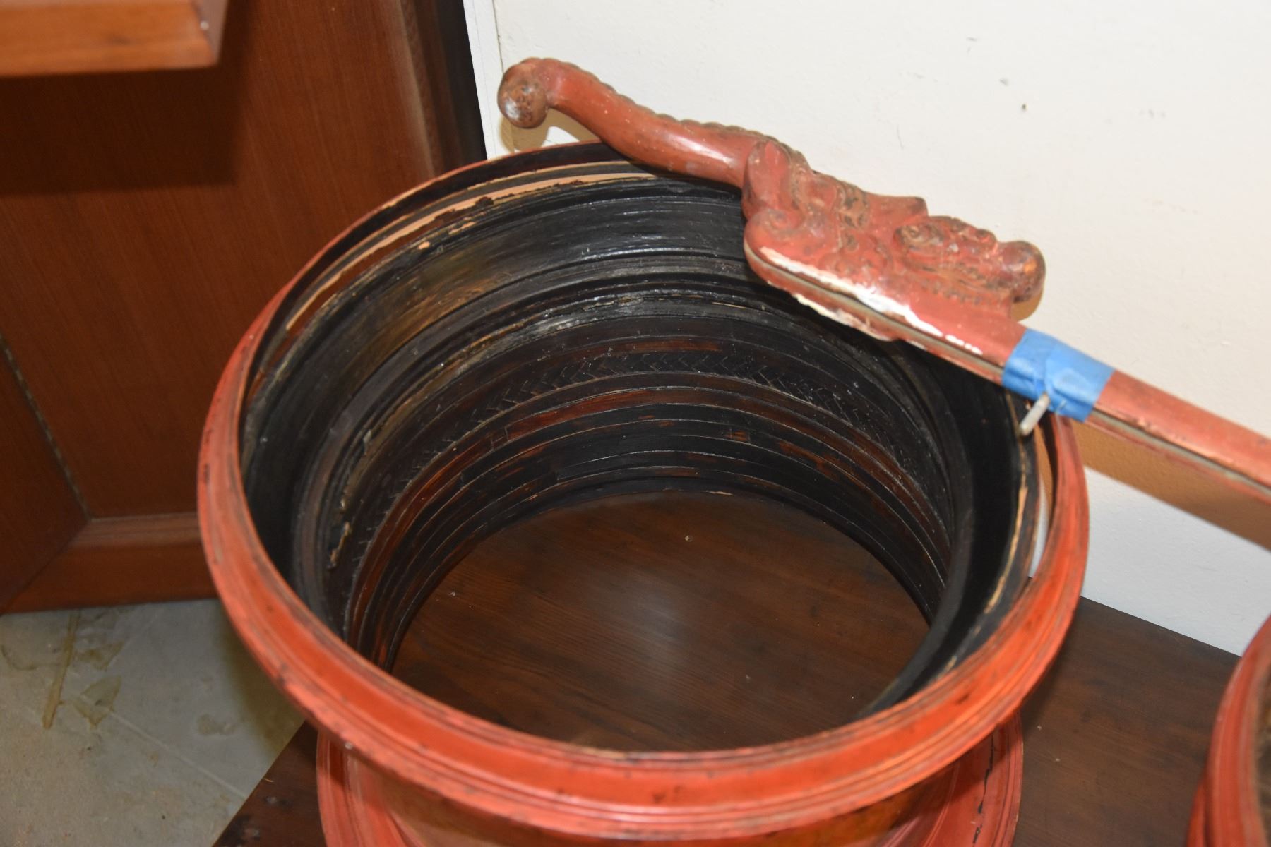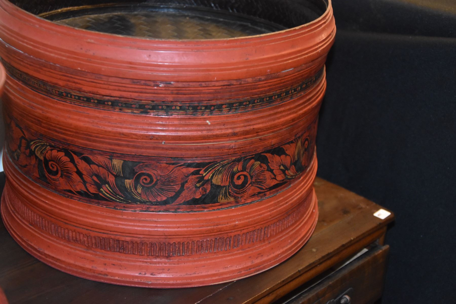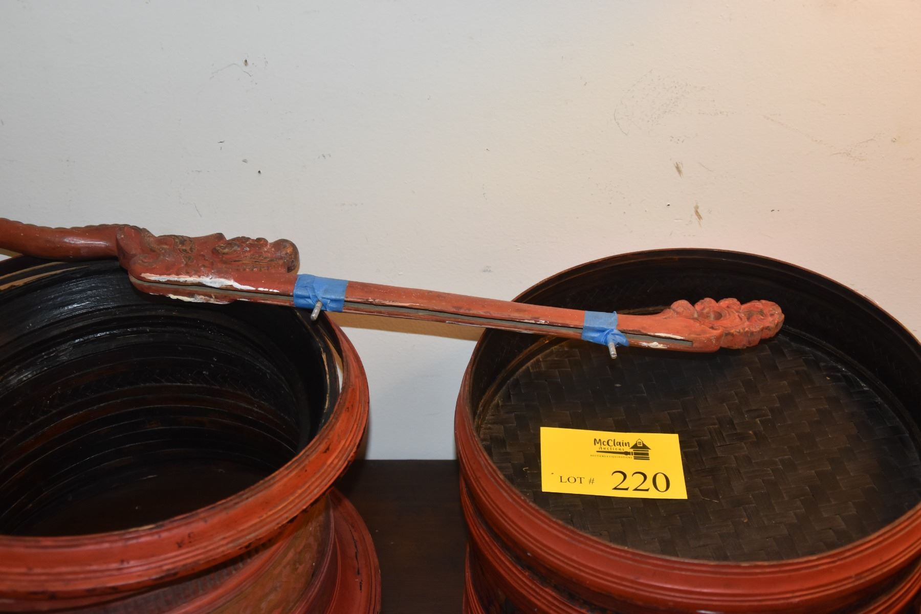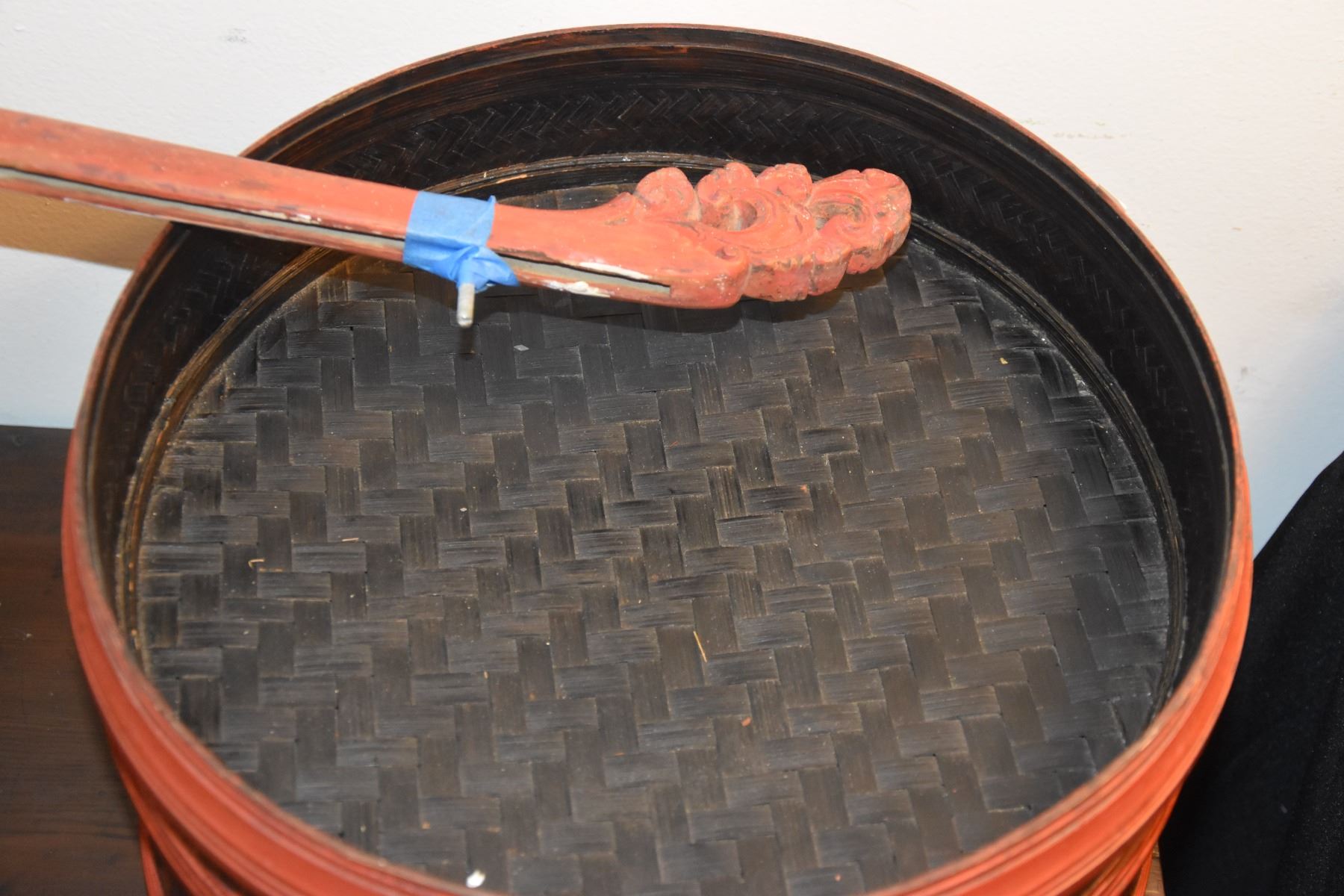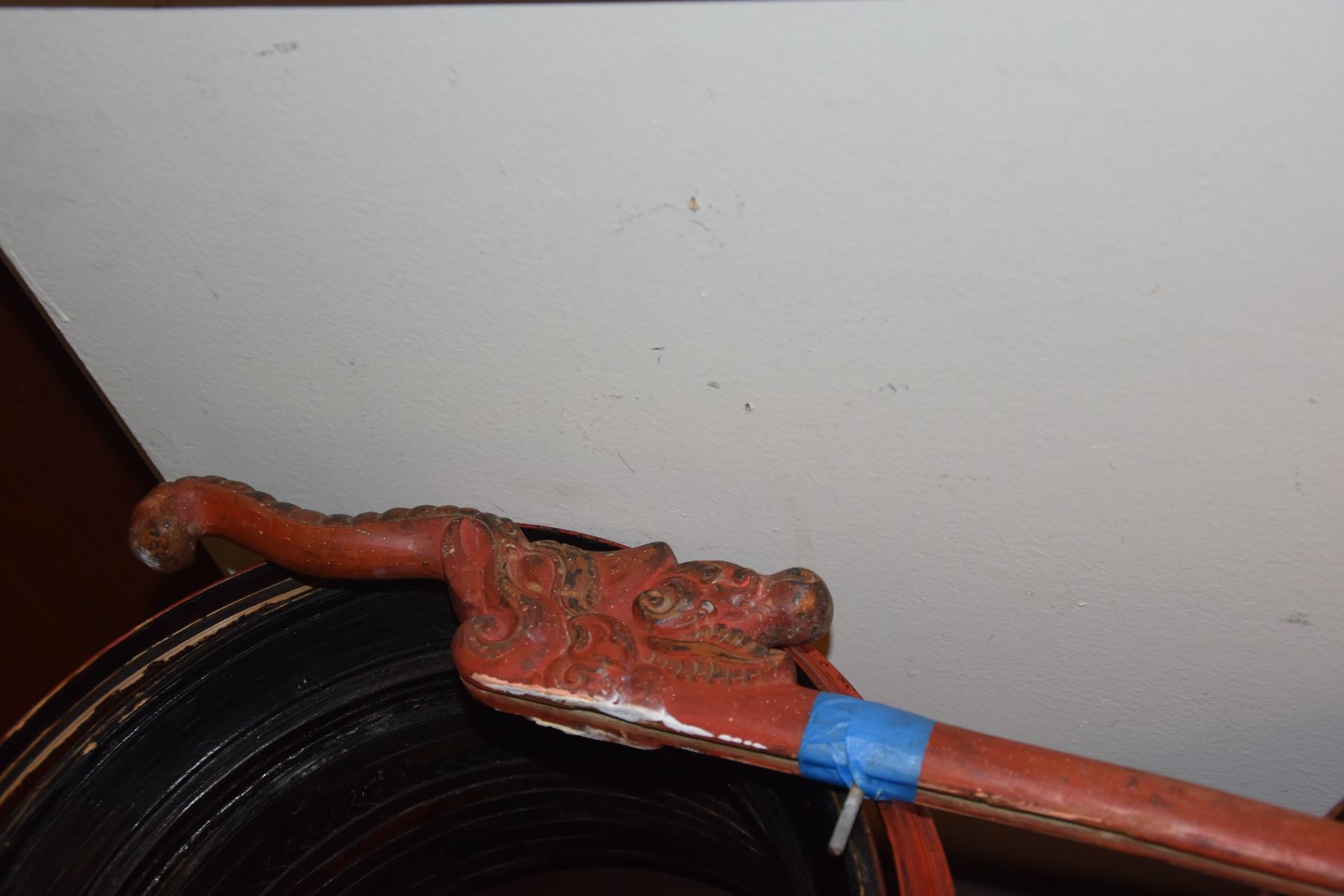RED LACQUER & GILT CIRCULAR CONTAINERS & RED LACQUERED CARVED ORNAMENT IN THE SHAPE OF A STYLIZED ELEPHANT (3 PCS)