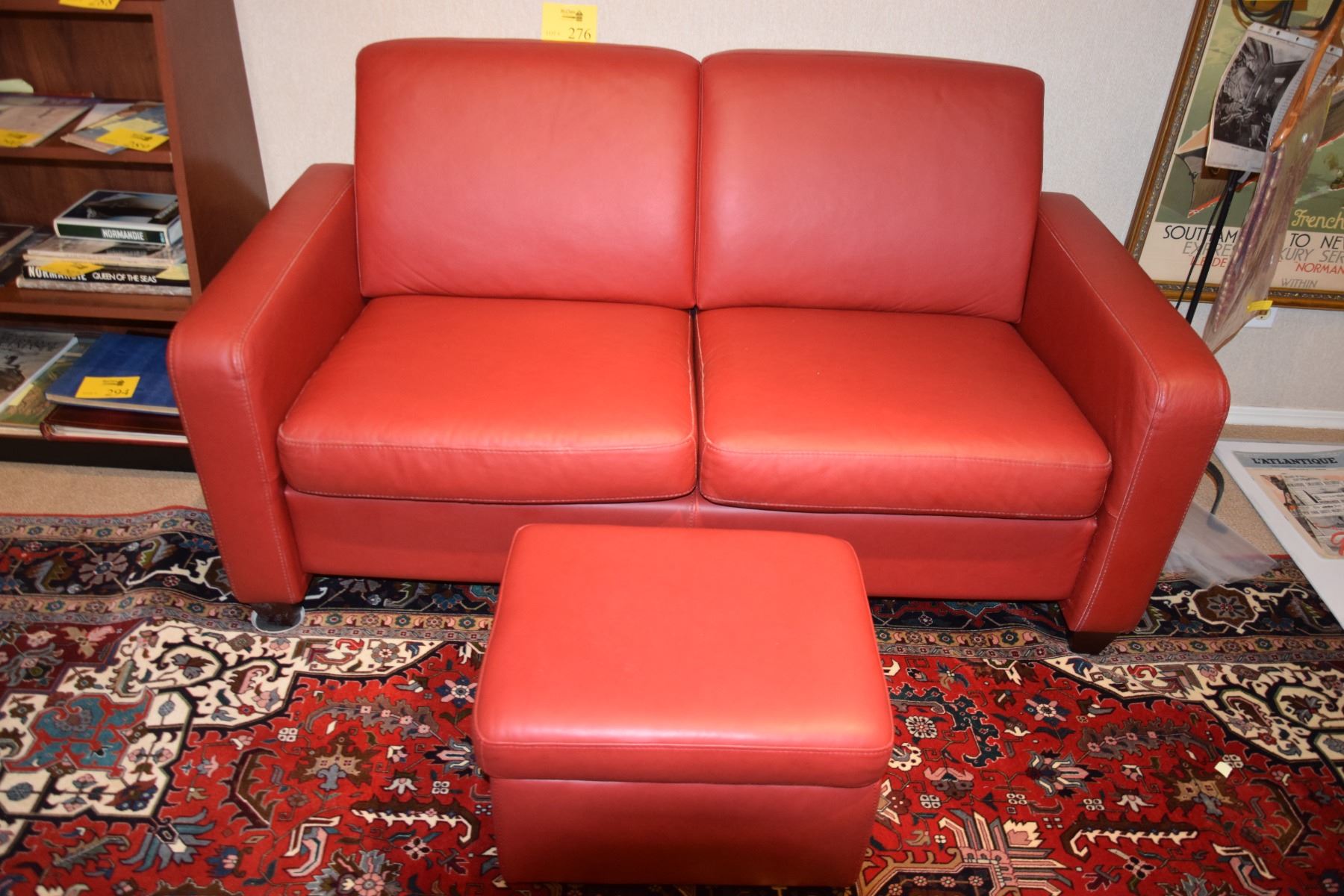 RED LEATHER LOVE SEAT & OTTOMAN (33" X 60" X 33")