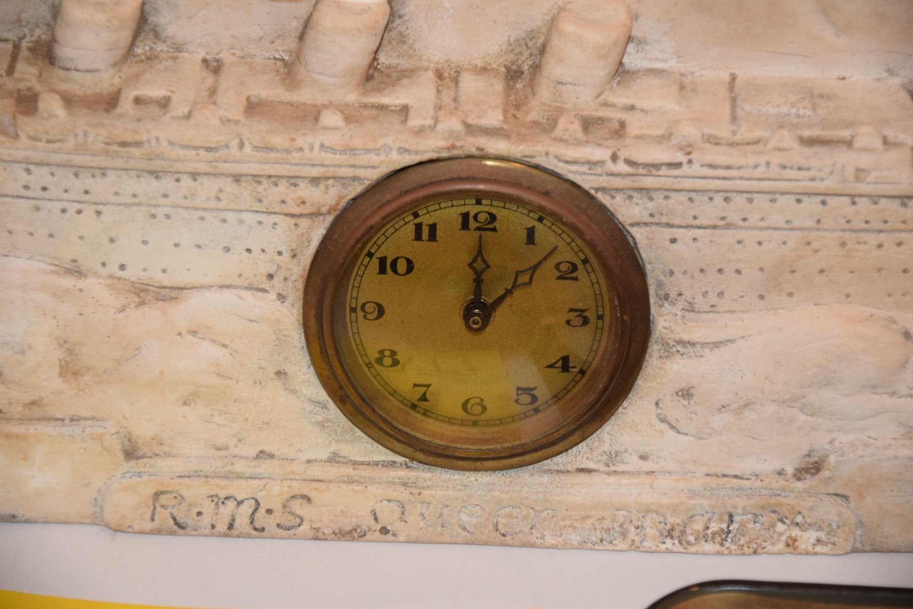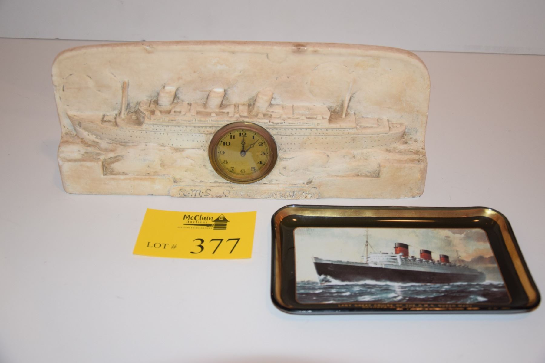 RMS QUEEN MARY PLASTER SHIP FORM W/CLOCK (REPAIRED) (13 1/2" X 6 12"), SOUVENIER GLASS TRAY, "LAST GREAT CRUICE OF THE RMS QUEEN MARY, OCTOBER 31-DECMEBER 9, 1967 (8 1/4" X 5") (2 PCS)
