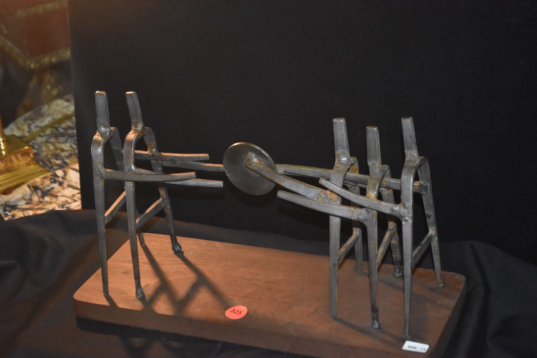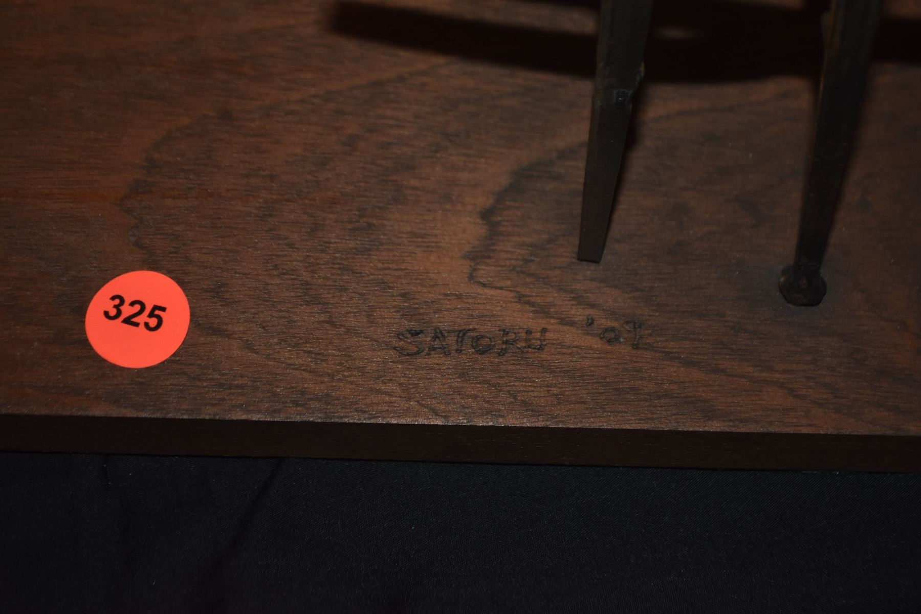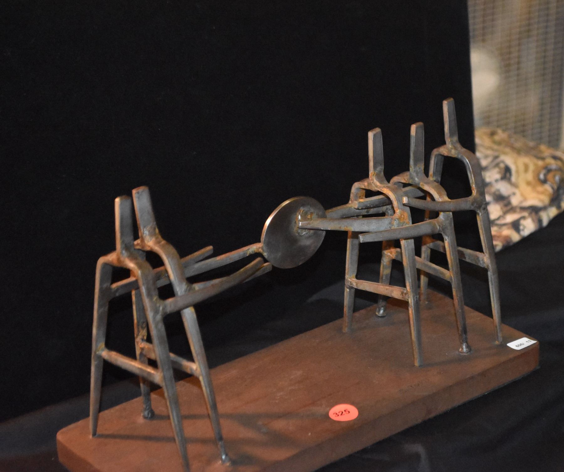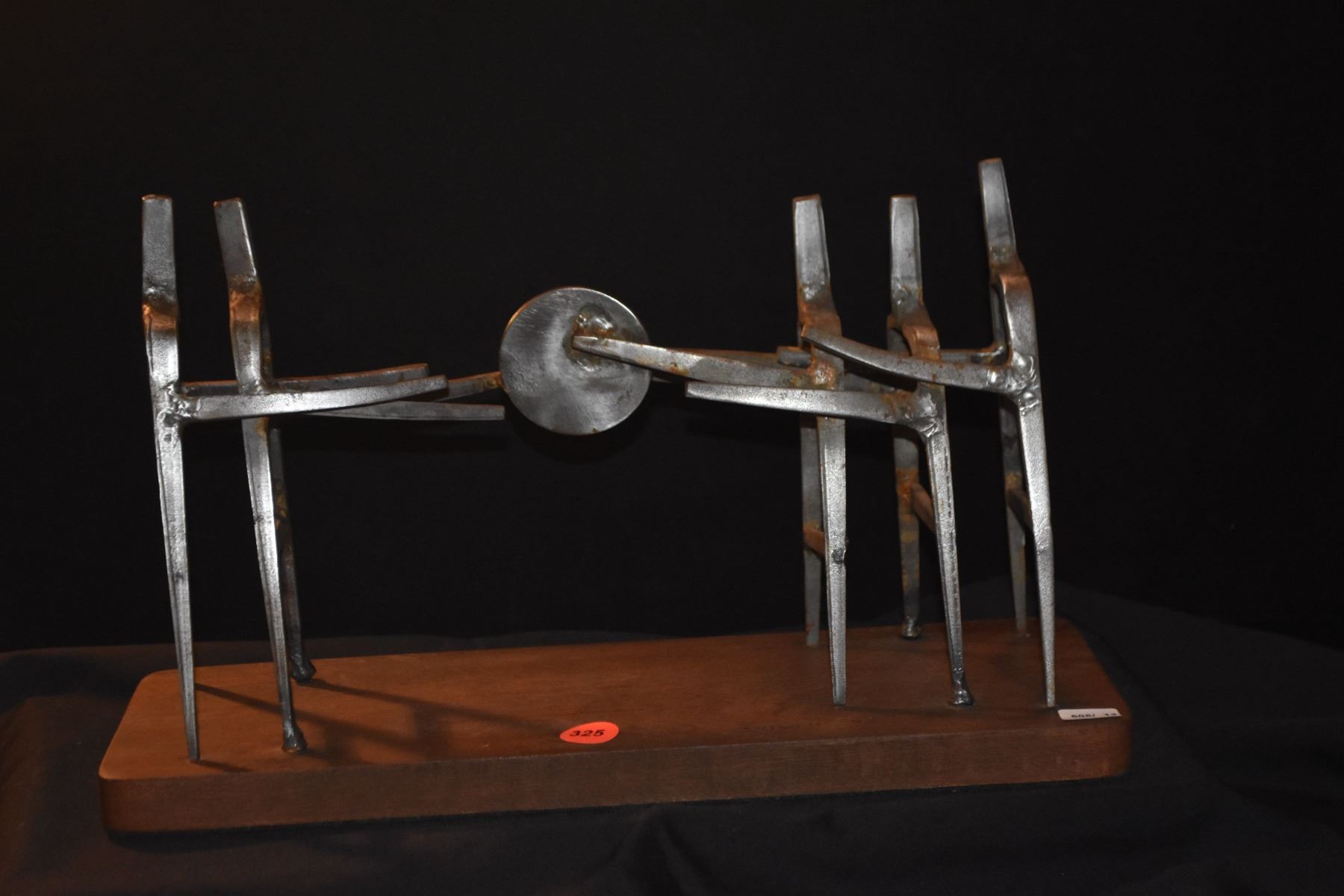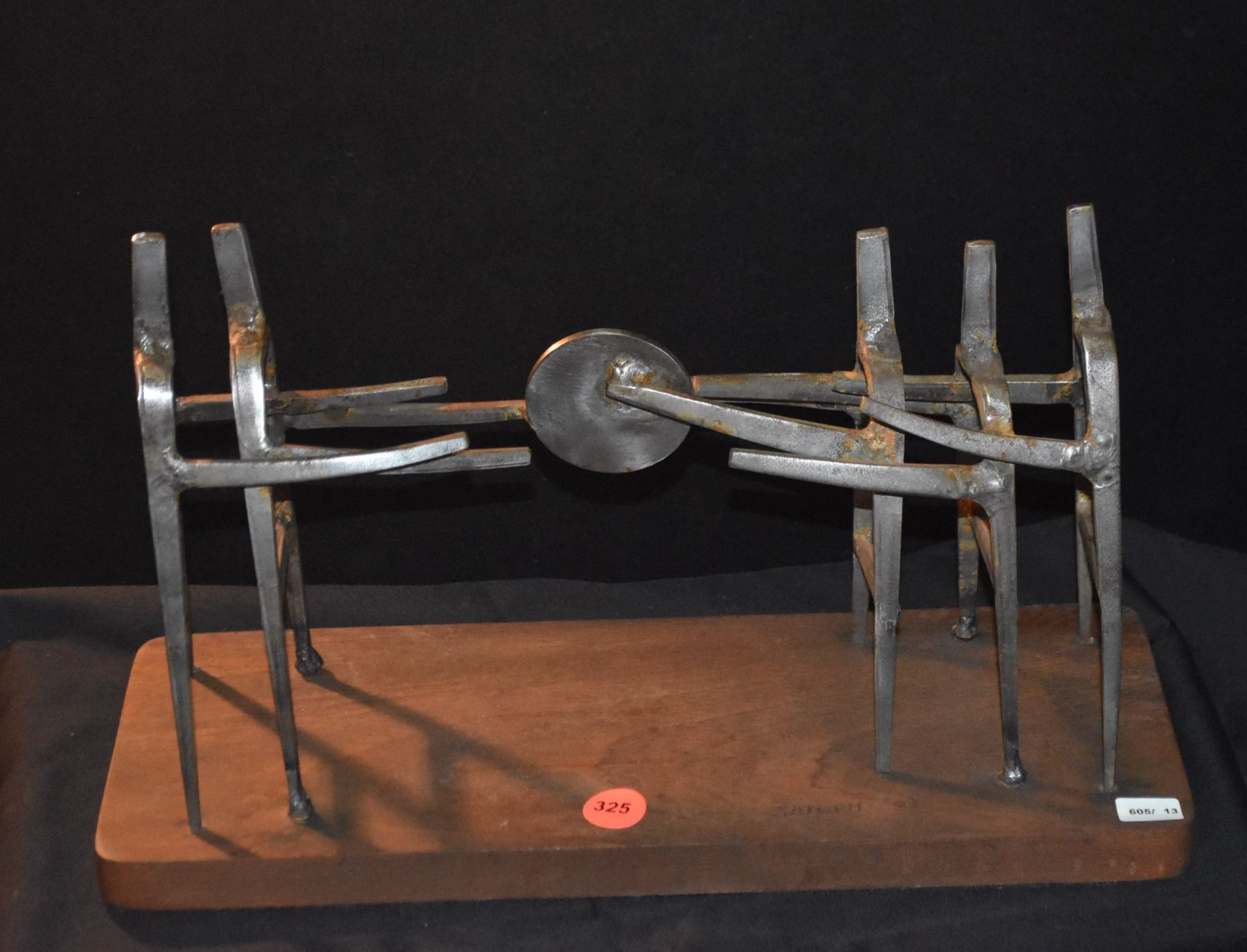 SATORU ABE FIVE MEN 5 SCULPTURE, MILD-CUT STEEL & WOOD; SIGNED SATORU '09 (11" X 3" X 8")
