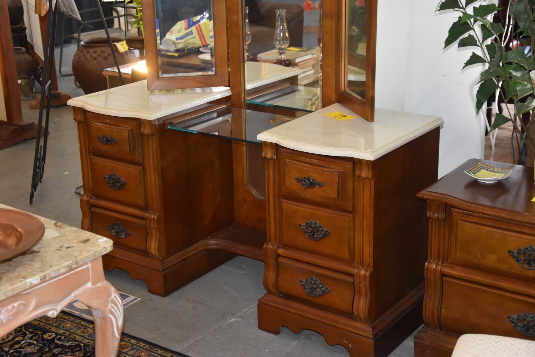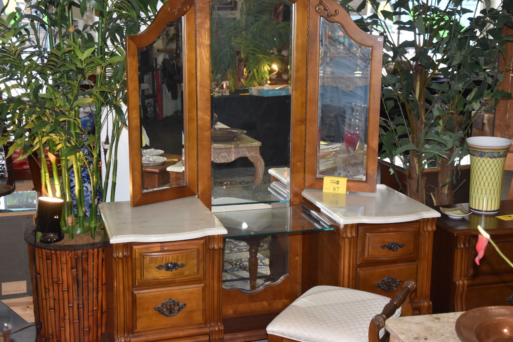 STANLEY VANITY DRESSER W/6 DRAWERS, TRI-FOLD MIRROR & UPHOLSTERED BENCH