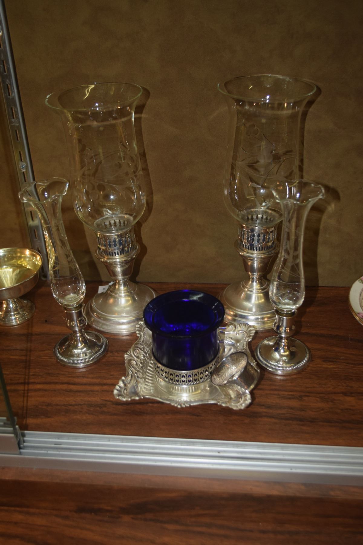 STERLING & GLASS CANDLE HOLDERS, BUD VASES, TRINKET DISH, NAPKIN RING & COBALT BLUE VASE (5 PCS)