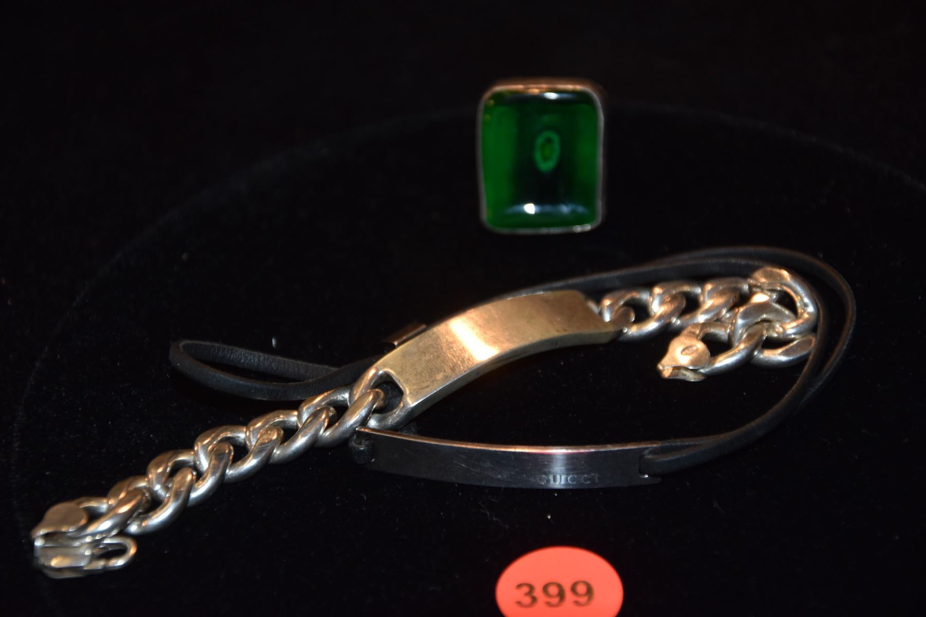 STERLING SILVER BRACELETS (10) (54 GTW), RING (22 GTW) & GUCCI PLAQUE ON LEATHER CORD (3 PCS)
