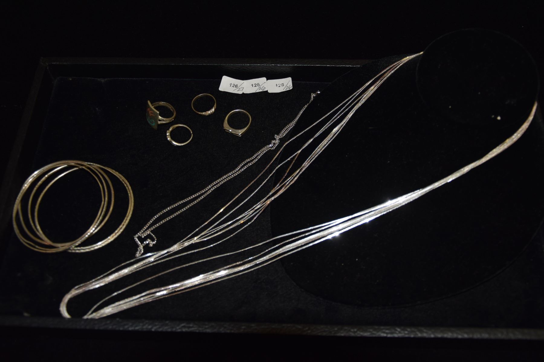 STERLING SILVER JEWELRY: NECKLACES (2), BANGLES (5) & RINGS (4) (11 PCS)