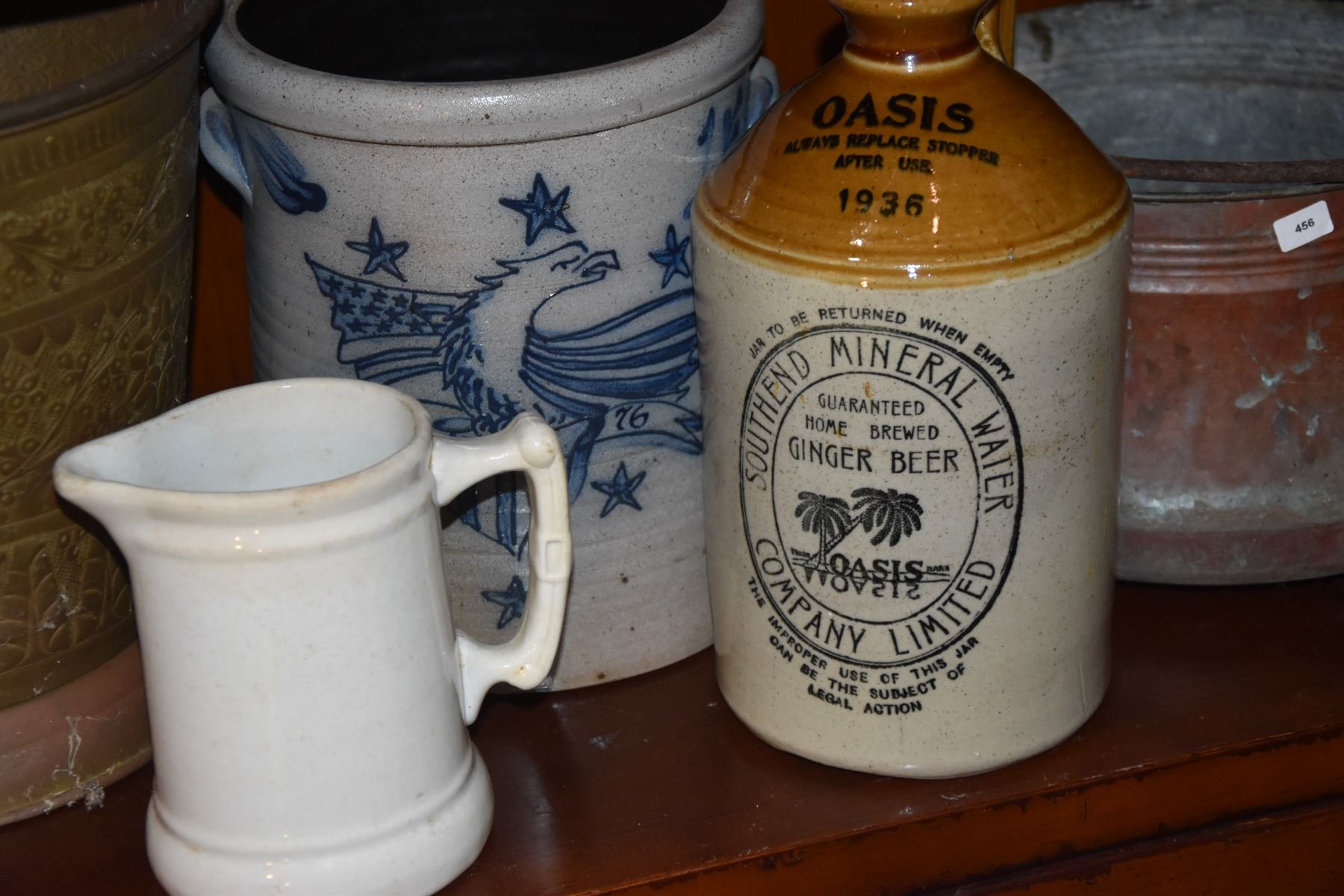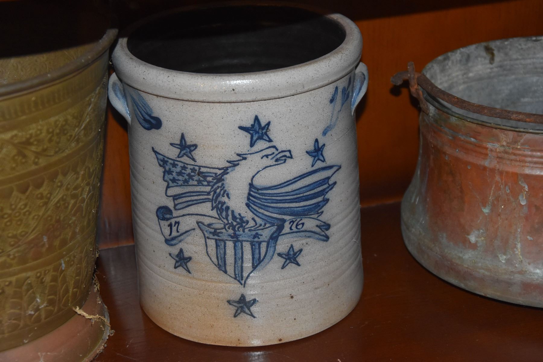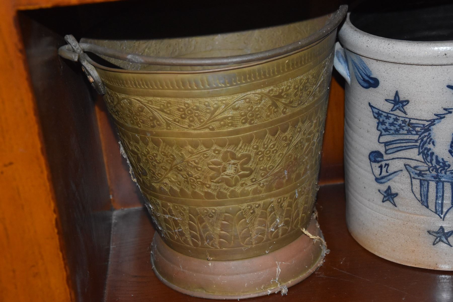 STONEWARE JUG & CROCK, MELLOR & CO. PITCHER & BRASS BUCKETS (5 PCS)