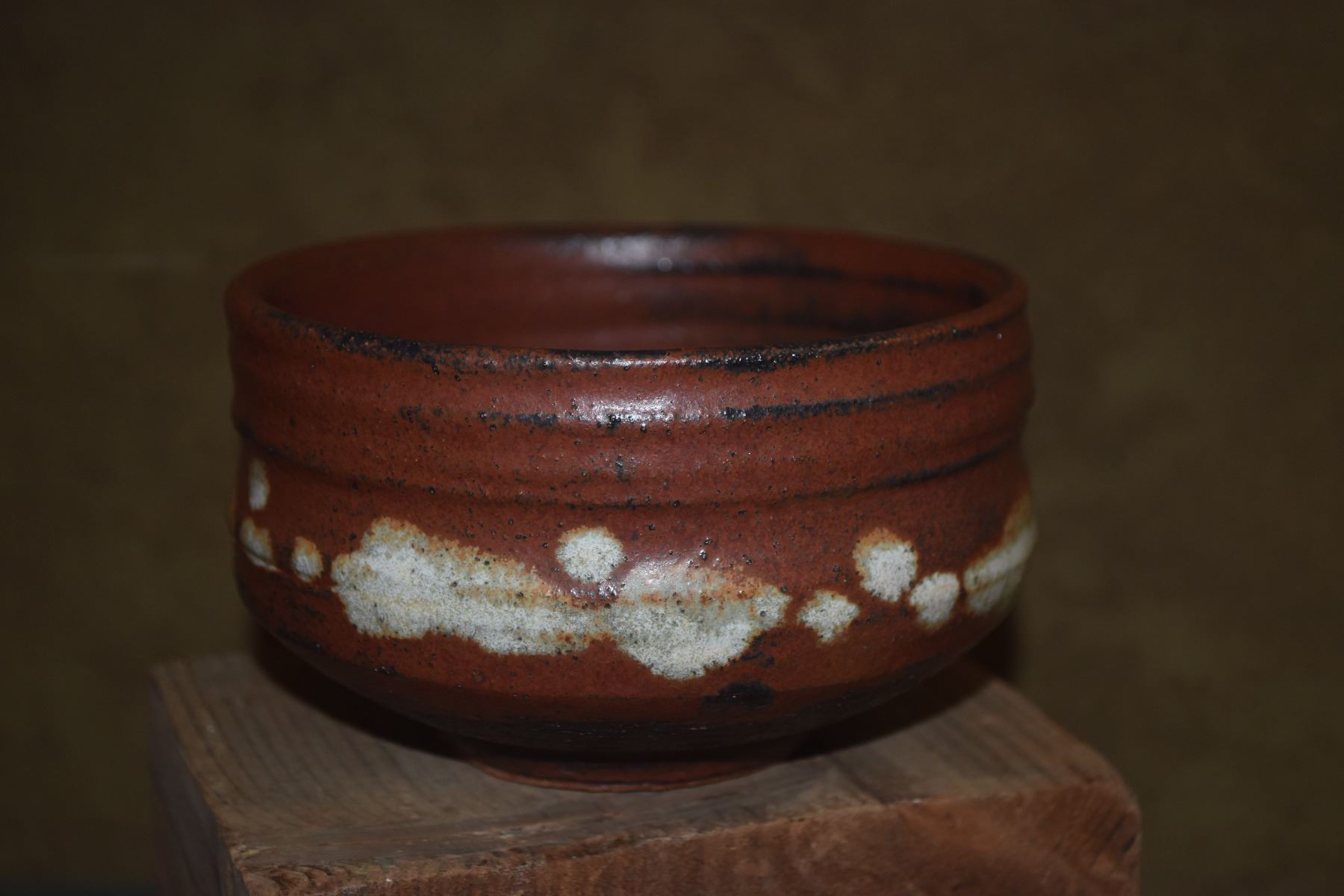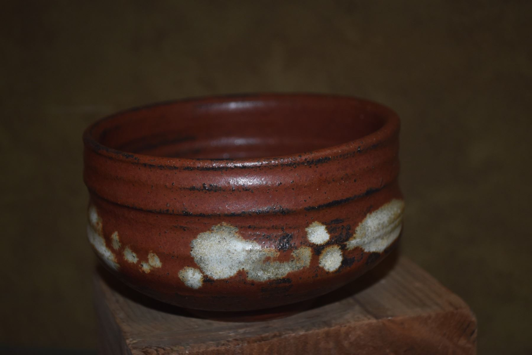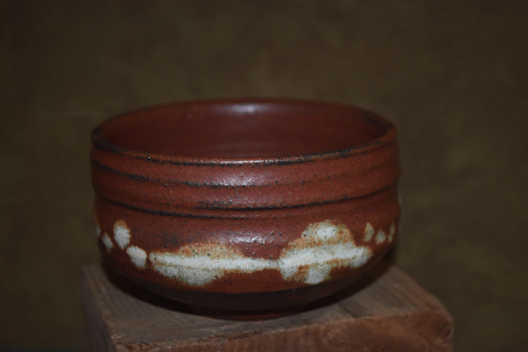 TEA BOWL W/KEAWE ASH & WHITE GLAZE BRUSHSTROKES; HIGA (5" X 3") (DOES NOT INCLUDE STAND)