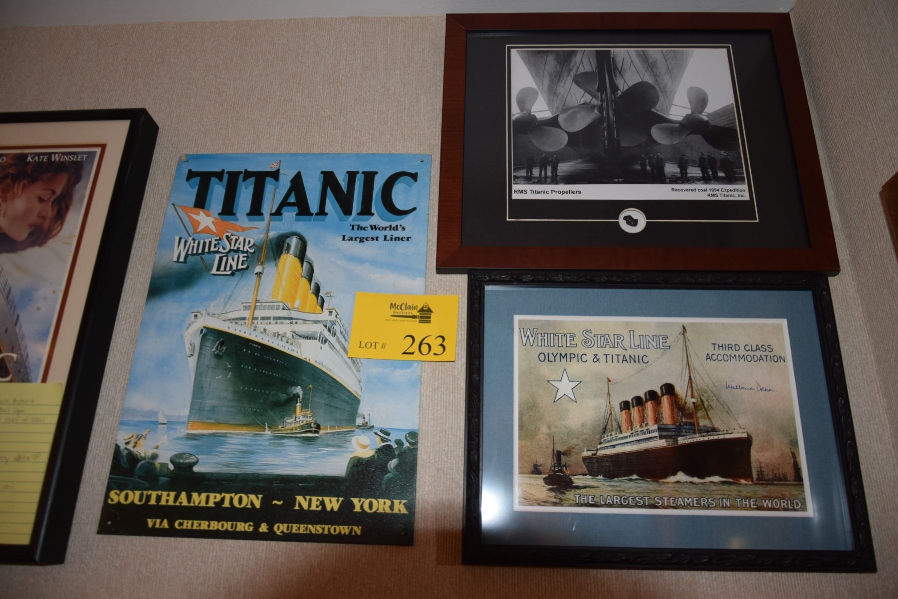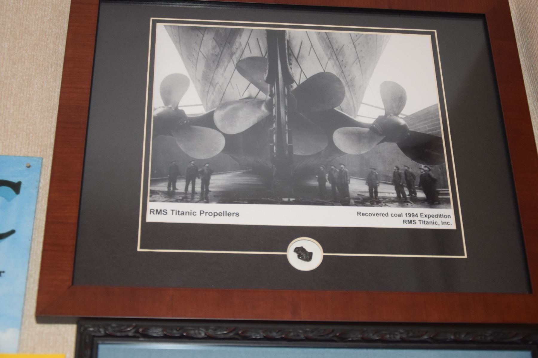 TITANIC PROPELLERS PRINT W/RECOVERED COAL PIECE, OLYMPIC & TITANIC WHITE STAR LINE VINTAGE ADVERTISEMENT ART PRINT POSTER & FRAMED VINTAGE TRAVEL POSTER 1921 (3 PCS)
