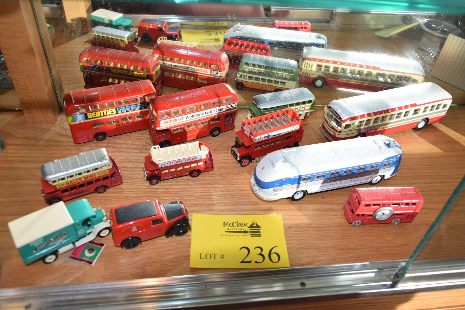 TOY VEHICLES: TRAILWAYS BUS, GREYHOUND BUS, LONDON DOUBLE DECKERS, ROYAL MAIL, ETC. (11 PCS)