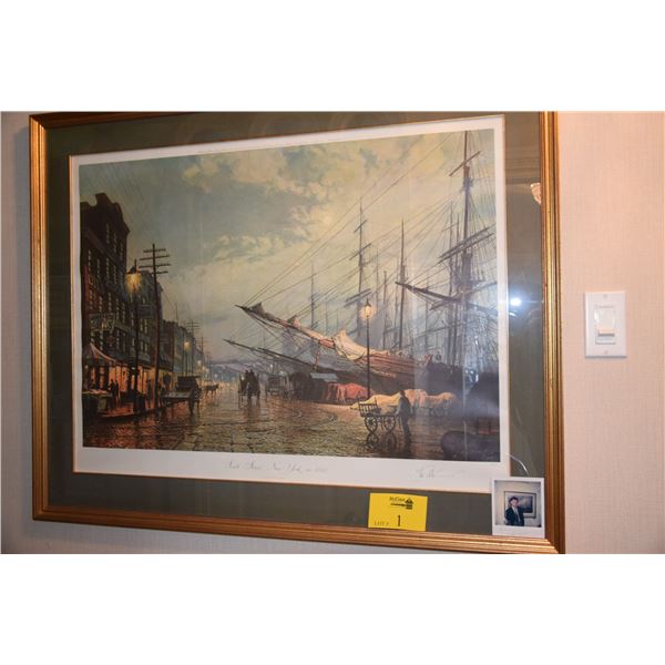 FRAMED "SOUTH STREET NEW YORK 1880" LITHOGRAPH, MARITIME INDUSTRY MUSEUM AT FORT SCHUYLER, THRONGS NECK, BRONX NY; SIGNED JOHN STOBART, AP...