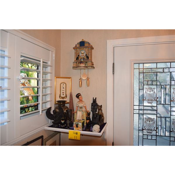 MIXED EGYPTIAN LOT: NEFERTITI STATUE, BASET STATUES, OBELISK, CLOCK, VASE, ETC. (16 PCS)