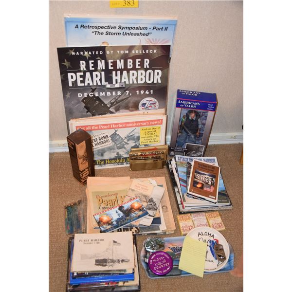 LARGE MIXED LOT: PEARL HARBOR COLLECTIBLES, NEWSPAPERS, BOOKS, CARDS, DOLL, BEER BOTTLE, PHOTOS, PAMPHLETS, ETC.