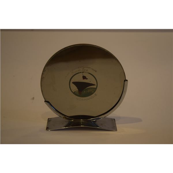 NORMANDIE: CHROME ART DECO DECORATIVE MIRROR W/A FULL COLOR NORMANDIE LOGO ENAMELED IN THE CENTER W/393 - NORMANDIE: CHROME ART DECO DECORATIVE MIRROR W/A FULL COLOR NORMANDIE LOGO ENAMELED IN THE CENTER W/