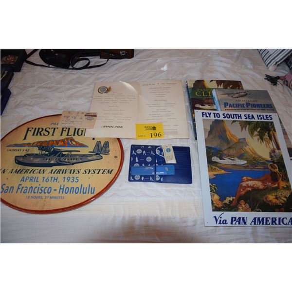 PAN AM MEMORABILIA: FIRST FLIGHT SF-HNL 4/16/1935, MENU, PINS, BOOKS, BOARDING PASS, ADVERTISING SIGN, ETC. (10 PCS)