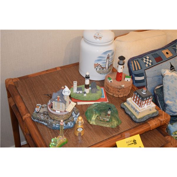 COLLECTION OF SEASHORE DRIFTWOOD ART, LIGHTHOUSE MOTIF STATUARY, COOKIE JAR, PILLOWS & BOOKS (20 PCS