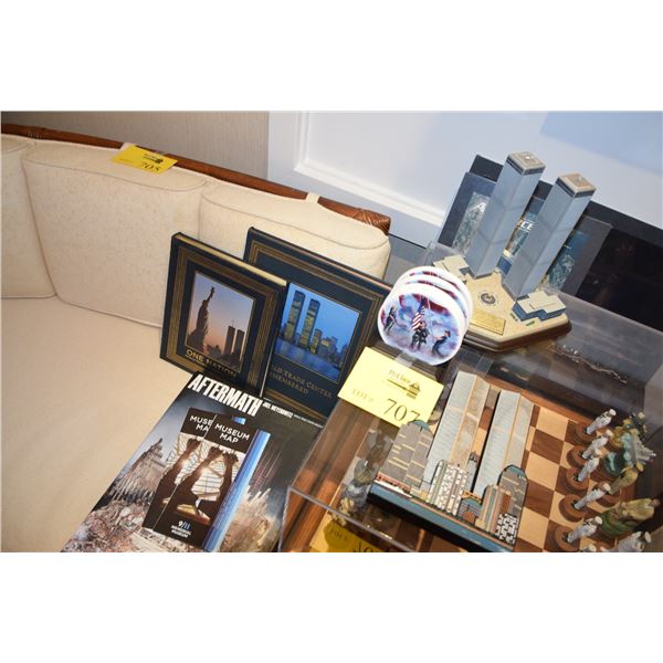 COLLECTION OF 9/11 MEMORABILIA: FRAMED PRINT, STAMPS, BOOKS, COASTERS & MINI MODEL OF THE TOWERS (8