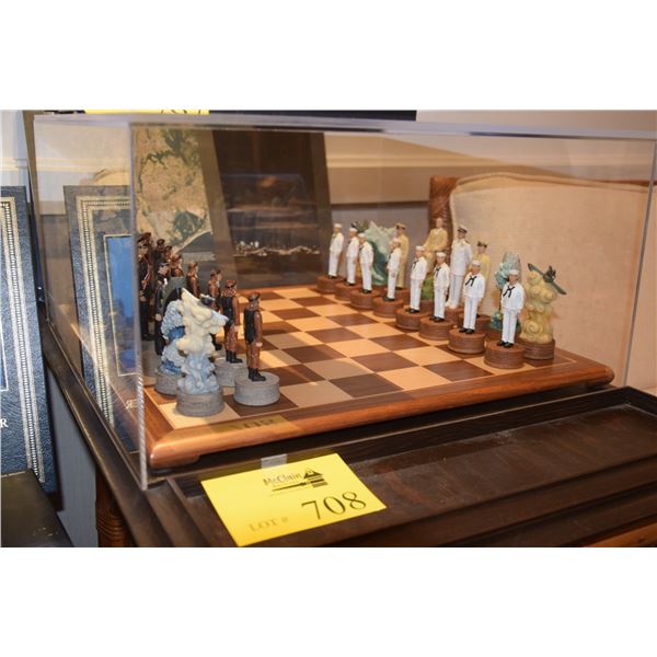 MILITARY MOTIF CHESS BOARD ON CUSTOM BASE W/PLEXIGLASS COVER
