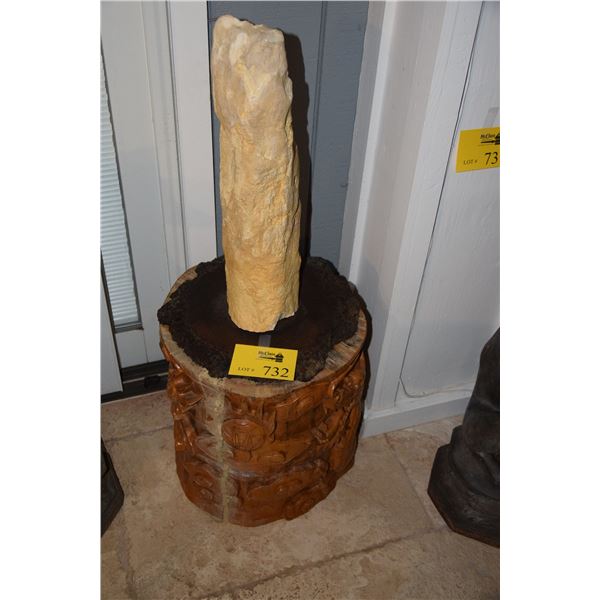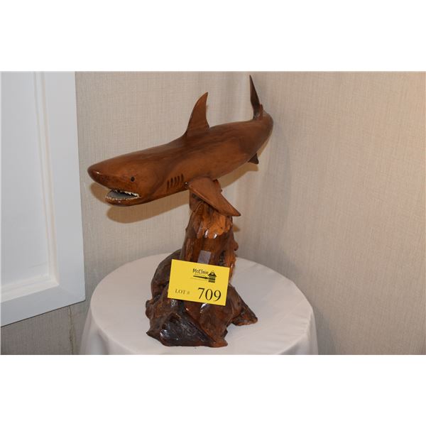 CARVED WOOD SHARK ON WOOD BASE; SIGNED PAUL OF HAWAII (24 1/2" L X 18" H)